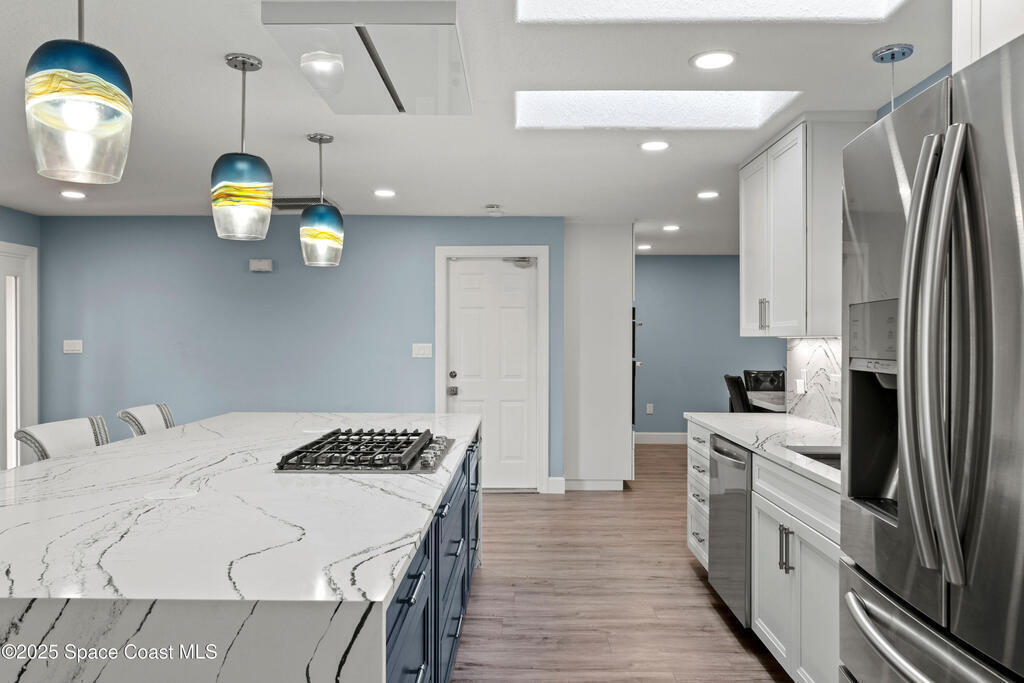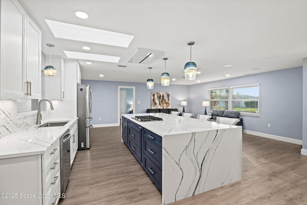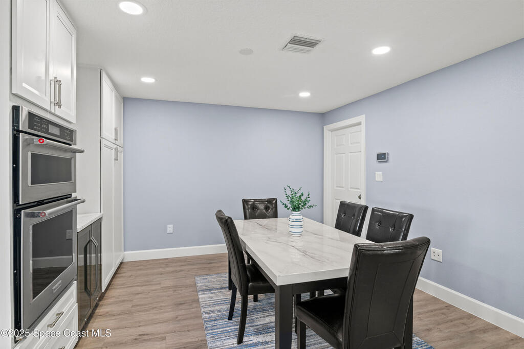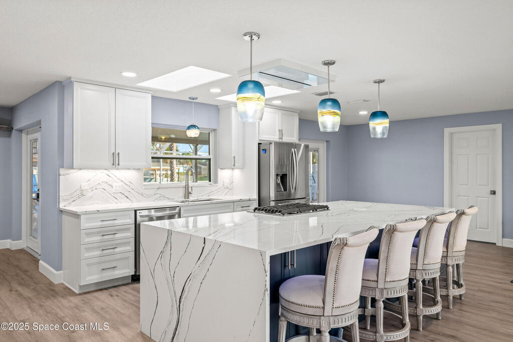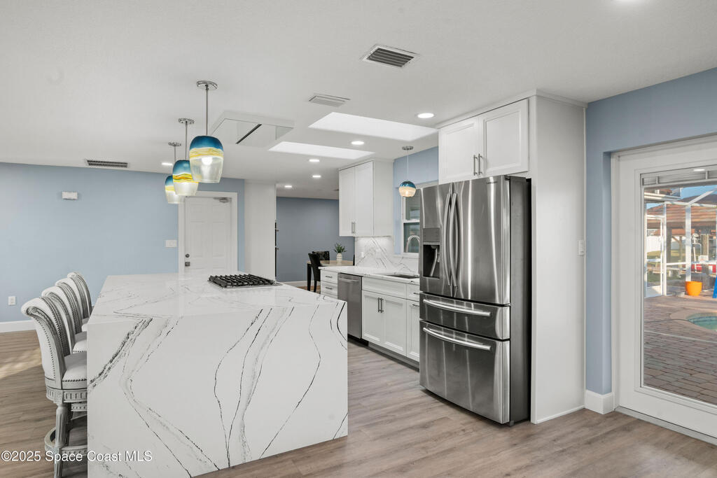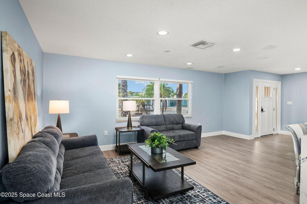 Short Sale - This recently remodeled Florida home offers the perfect blend of luxury and convenience, tailored for professionals who cherish waterfront living, gourmet cooking, and entertaining. Step into a chef's dream kitchen, outfitted with stainless steel appliances and sleek granite countertops, designed to inspire culinary creativity. The open-concept layout seamlessly connects the kitchen to spacious living and dining areas, all adorned with premium Luxury Vinyl Plank (LVP) flooring that combines style with durability. Host gatherings in your backyard oasis, featuring a newly resurfaced saltwater pool enclosed within a screen cage, ensuring year-round enjoyment free from pests. The adjacent patio area provides ample space for outdoor dining and relaxation, making it an entertainer's paradise. Enjoy your own boat lift located on navigational canal with direct access to the Banana River, perfect for boating enthusiasts seeking daily adventures. Embrace eco-friendly living with