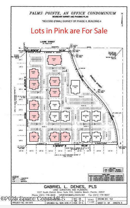 This ''lot'' is one of 9 lots that are all relatively identical. These lots are designed to fit four office condo units with a total area of 5,041 s.f. per building. Each condo unit (4 proposed in each building) could have a size of 1,260 s.f. each or any permutation of that multiple. This Lot has all parking, retention, water and sewer stub out and are flat and level and cleared. They are ready for development of a 5,041 s.f. building. This is a perfect location for a medical use since the hospital is located 2.3 miles or 6 minutes by car. The complex is well maintained and managed. Other owners/tenants include dentist, doctors, massage therapy, lawyer, insurance company, and Realtor. Amazing opportunity to own a free standing office building in the center of town with much of the work of development already completed.There are a total of 10 lots with 9 lots designed for 5041 s.f. buildings and one of approx. 7500 s.f. Asking price is for 1 lot for 5041 sf. blding. All avail.