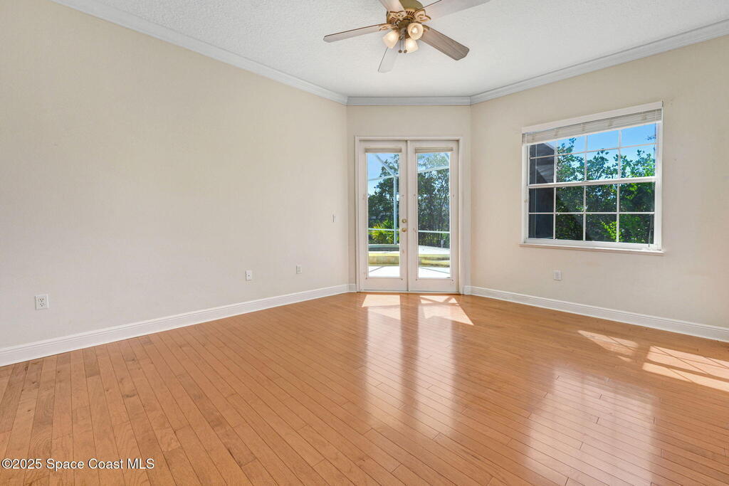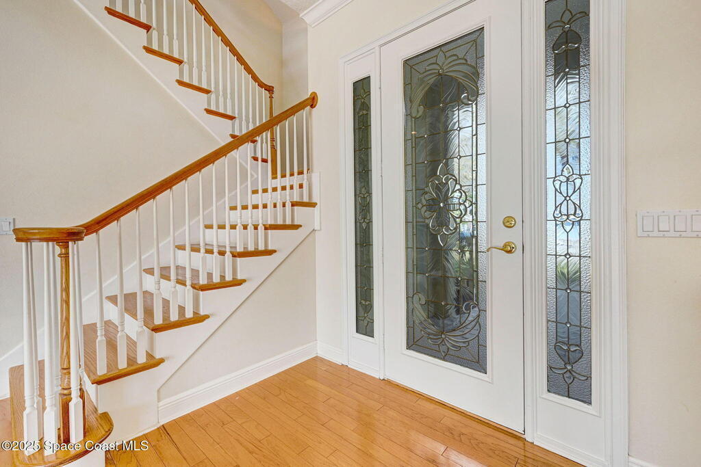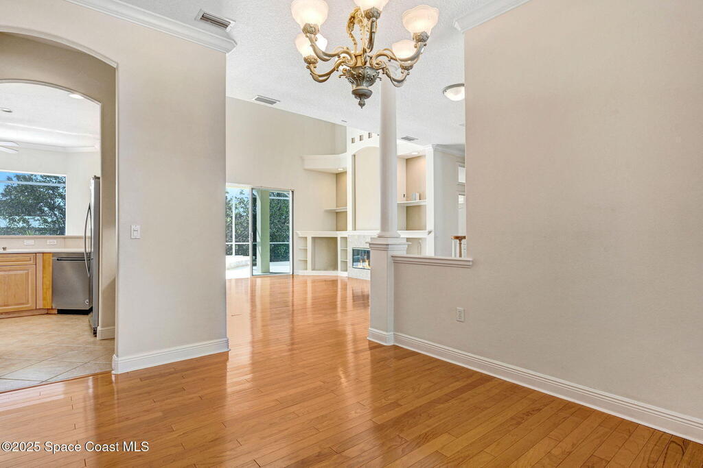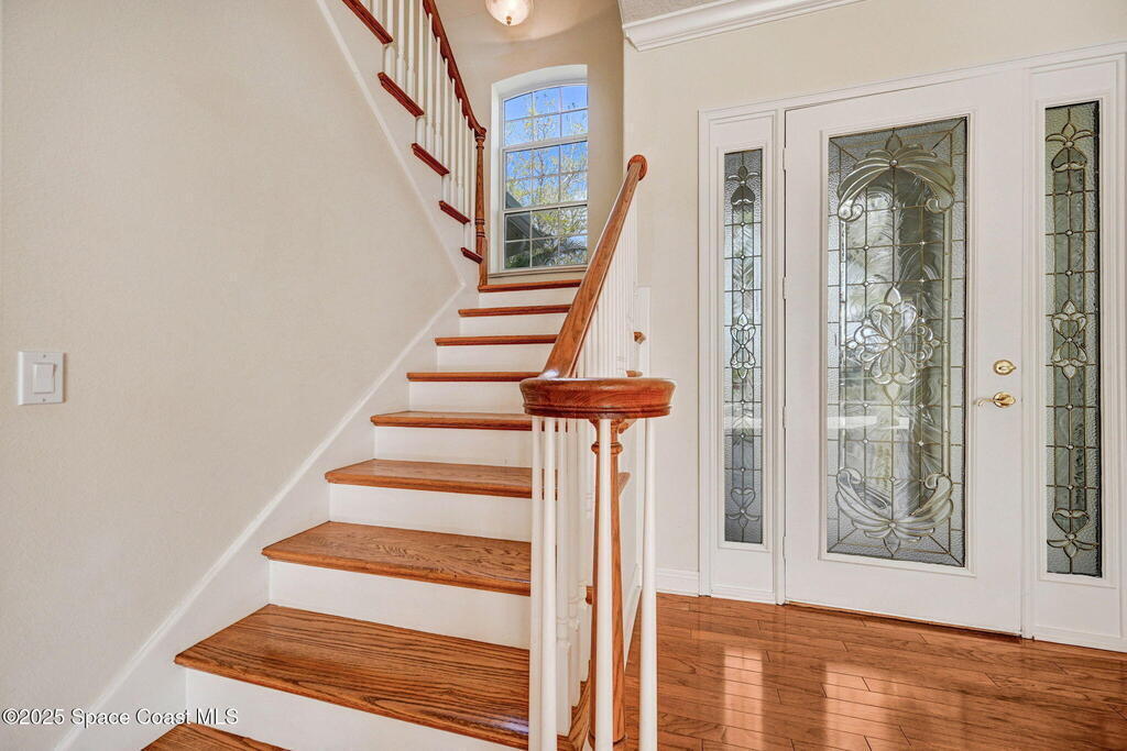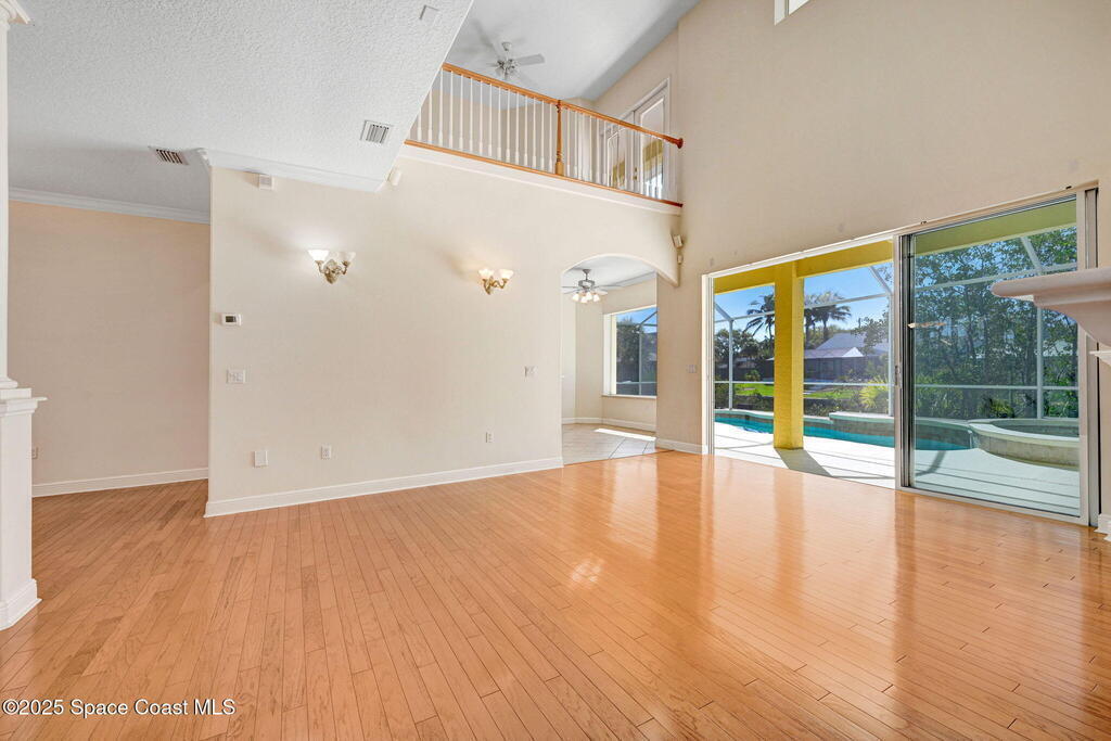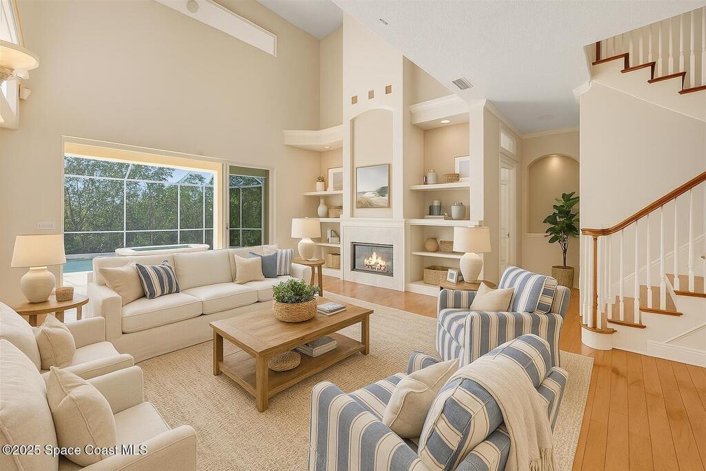 Drastically reduced! Prestigious gated River Moorings! This custom home boasts 24 ft ceilings in the great room accented by a gas fireplace, wood floors & triple sliders to the pool! Spacious kitchen offers a large picture window nook overlooking the water & pool! Primary 1st floor bedroom w/ views of the pool plus a luxury spa bath! Upstairs includes 3 large guest bedrooms, full bath, comfortable loft overlooking the great rm + a cozy library! Screened heated pool & jacuzzi w/ plenty of entertaining area! Serene waterfront setting on a navigable canal that leads directly to the Indian River (no bridges)! Large balcony upstairs for your morning coffee or evening cocktails! See virtual dock picture attached! Mangroves just received 1st trimming - allowed to cut them to 6ft from the water line! This home has so much natural light! Additional features include crown molding, transom windows, central vacuum, full sprinkler system & newer kitchen appliances!