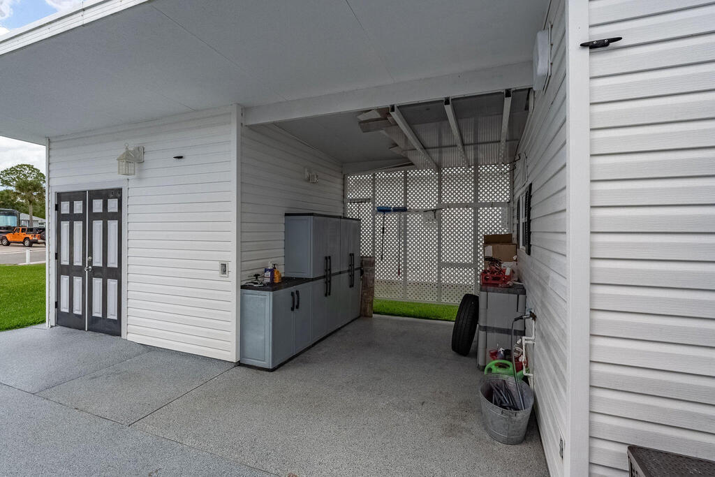 Imagine living in America's highest rated RV Resort with Ron Garl designed championship 18-hole 72 par golf course and so much more! This executive suite is a custom built structure, not mfg. It supports a 45' RV plus 2 cars. Kitchen features solid wood cabinets, custom built work station with deep pull out draws and built-ins, convection cook top stove, convection microwave oven, new appliances and stand alone pantry. Bathroom has full tiled shower with glass doors, plenty of counter space and pantry style wood cabinets for storage. Family and dining area feature a Wall fireplace and 55'' TV. With the many large windows you can enjoy the water view of the pond and trees. Enjoy the spacious outdoor kitchen area with large grill, Sunbrella sofa and cozy tabletop fireplace. Outside area also has a workspace and laundry room with lots of storage. The Great Outdoors has so much to offer, you will feel like you are on vacation 365 days a year!