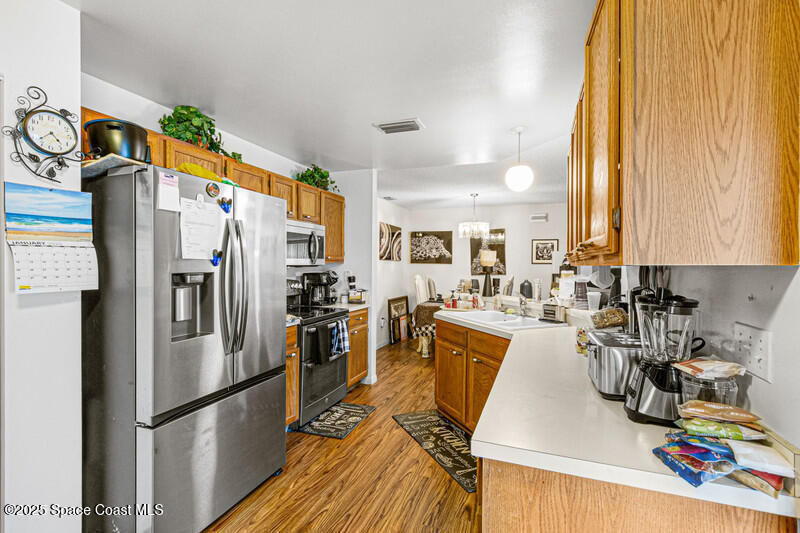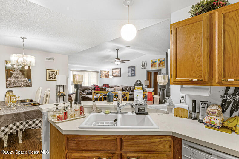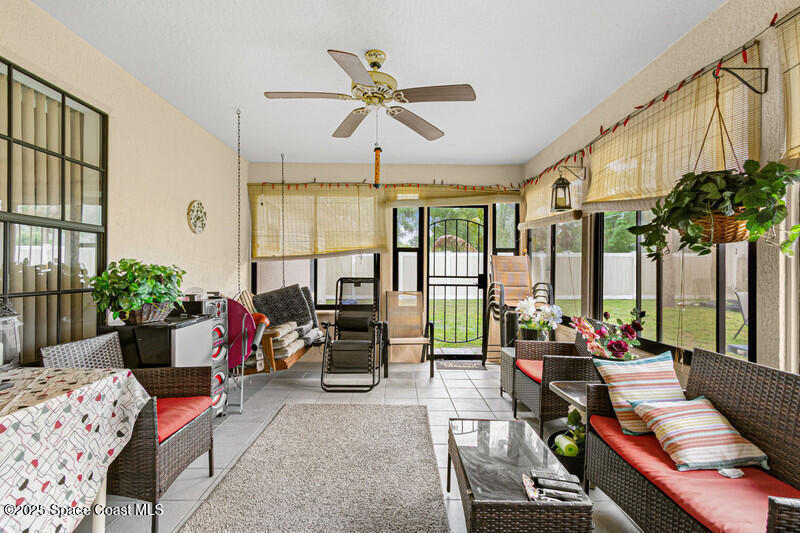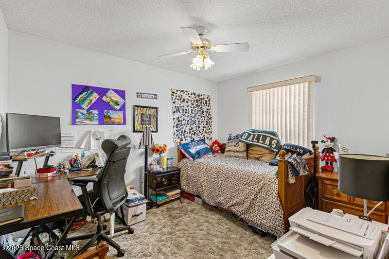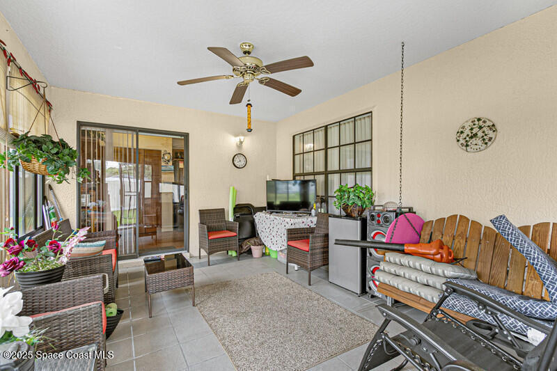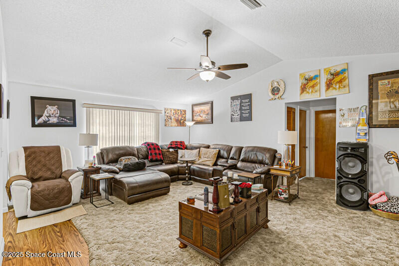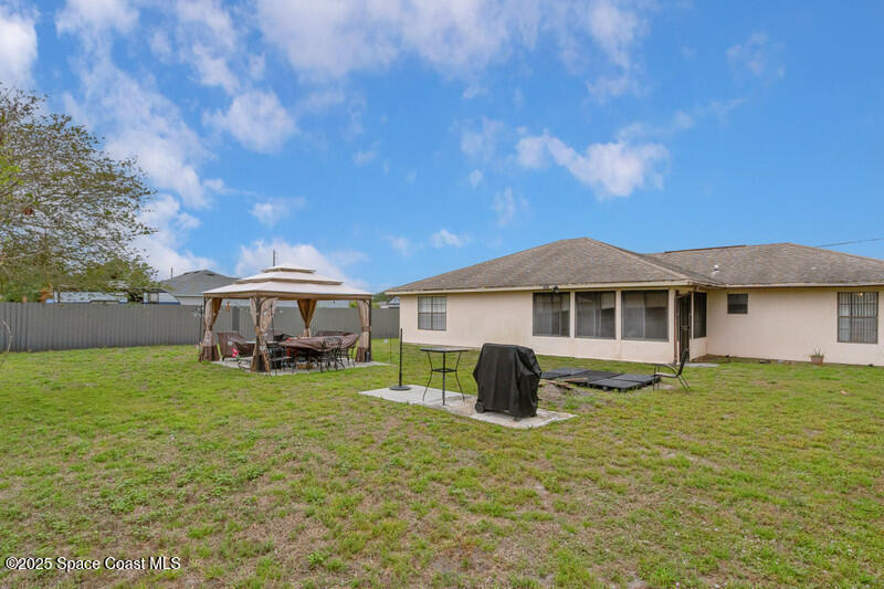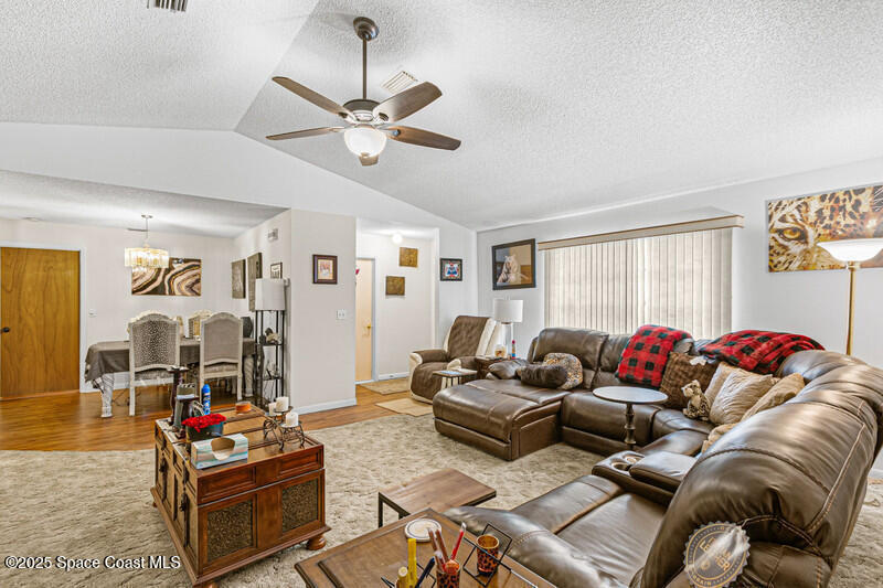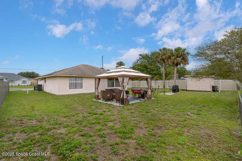 Charming three-bedroom, two-bath residence nestled in the heart of Palm Bay, This well maintained property boasts a perfect blend of comfort, style, and functionality, making it an ideal haven for families, professionals, and anyone seeking a relaxing retreat.The interior boasts a spacious open floor plan that seamlessly integrates the living, dining, and kitchen areas. The updated kitchen has newer appliances and generous breakfast bar space.The large Primary Bedroom has plenty of closet space and the Primary bathroom offers a double vanity. The private backyard has an oversized storage building. In addition there is a private well for irrigation. The home is close to shopping, entertainment, and churches. VA ASSUMABLE.This is a must see!