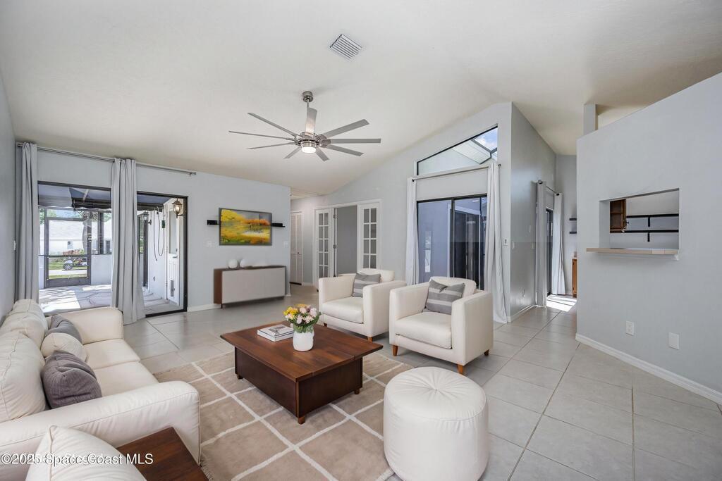 Gorgeous paver driveway and lush landscaping greet you as you arrive at this lovely, expanded Madison Model, located in a resort-style country club community, offering top-notch amenities for an exceptional Florida lifestyle. Vaulted ceilings, bright open floor plan, indoor laundry, updated bathrooms, modern fans and light fixtures, make this home move-in ready. Bonus room attached to the large owner's suite makes an ideal, private office or a place to relax, curl up, read a book, or enjoy your favorite hobby. There are sliding glass doors that lead to the lanai from the bonus room and living room. Guest bathroom also has access to the spacious screened lanai. Home includes an open air atrium, great for combining open space, natural light & the potential for a unique & inviting garden, or space for relaxation, and enjoying your morning coffee. Home to over 600 Military Veterans, Indian River Colony Club is a Private 55+ Country Club community with an extensive maintenance program for