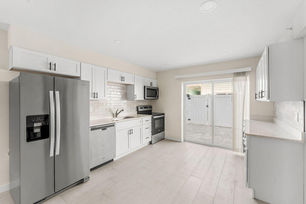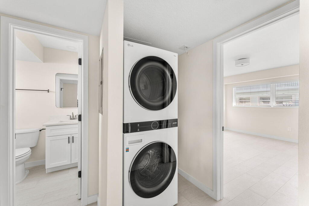 The wait is over, renovations are complete! Welcome to our exclusive beachside apartments, just 1,000 feet from the beach. This 1-bed, 1-bath sanctuary underwent a full renovation in '24. Enjoy a stylish kitchen equipped with SS Whirlpool appliances & quartz countertops, a luxurious bathroom featuring a glass door shower and quartz vanity, and an LG stacked washer and dryer in-unit. Wood-look tile flooring throughout adds an elegant touch. Step out onto your private fenced paved patio, extending your living space in this coastal climate. With restaurants, breakfast spots, and shopping just steps away, coastal living has never been more convenient.