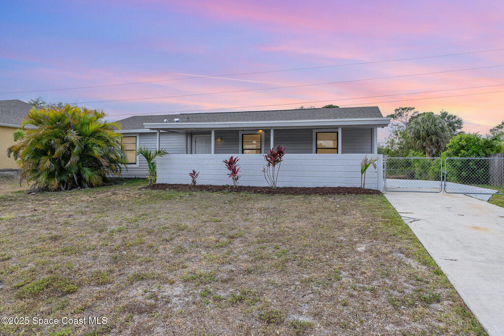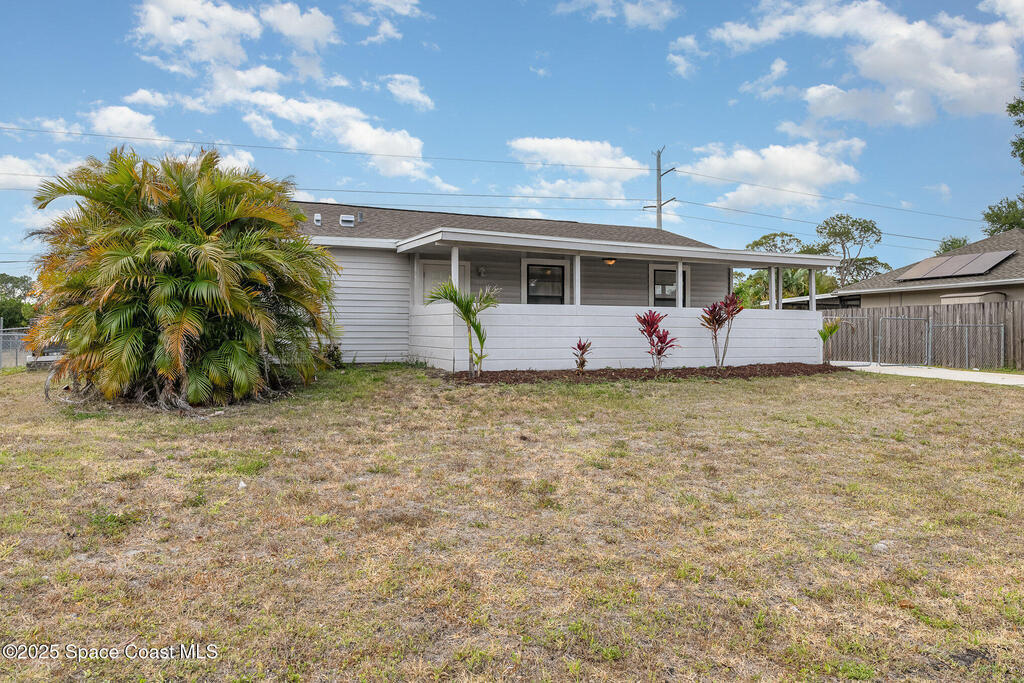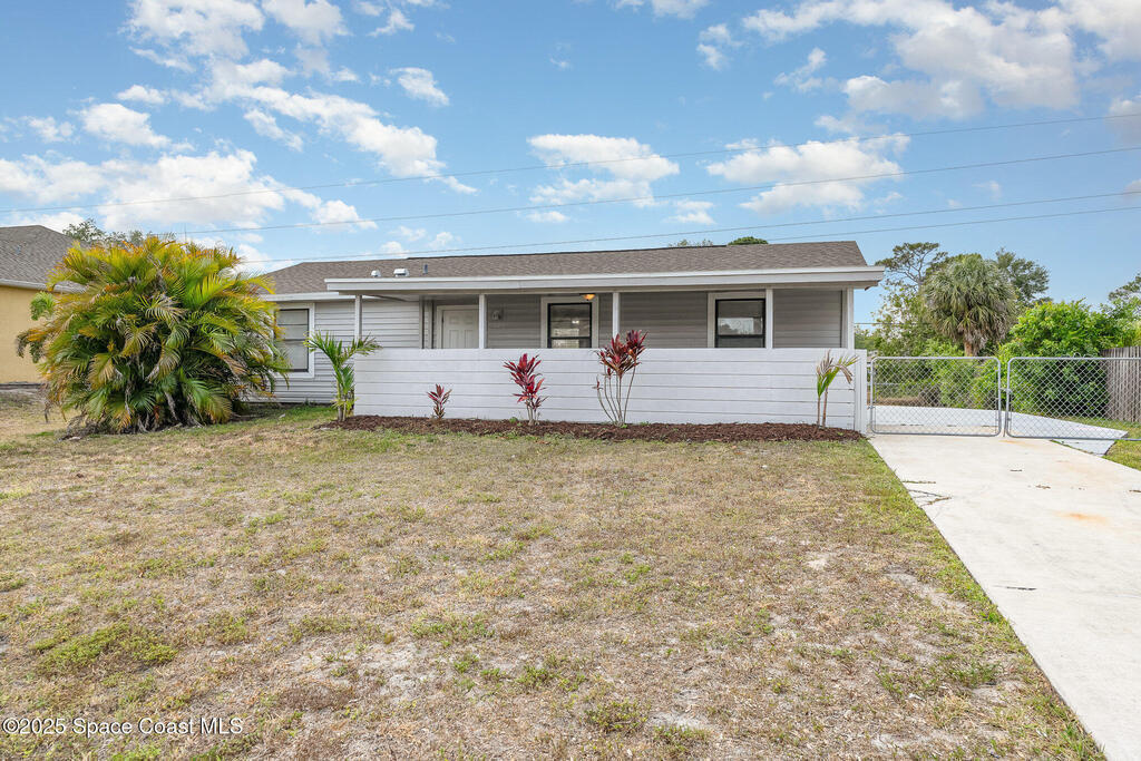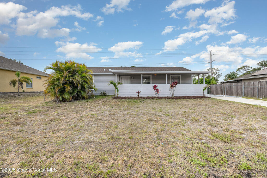 Welcome to this freshly updated 3-bedroom, 2-bath home on a spacious 0.35-acre lot in NW Palm Bay. Featuring new luxury vinyl plank flooring throughout, a split-bedroom layout, and a bright kitchen with a pantry, this 1,104 sq ft residence offers comfort and style. Enjoy outdoor living on the covered porch and patio, with ample room to expand or entertain. Nestled on a quiet street, you're just 12 minutes from I-95 and Hammock Landing Shops, 20 minutes to Downtown Melbourne, and 25 minutes to the beach. Nearby parks include Turkey Creek Sanctuary and Fred Poppe Regional Park. Experience the perfect blend of tranquility and convenience in this move-in-ready home.