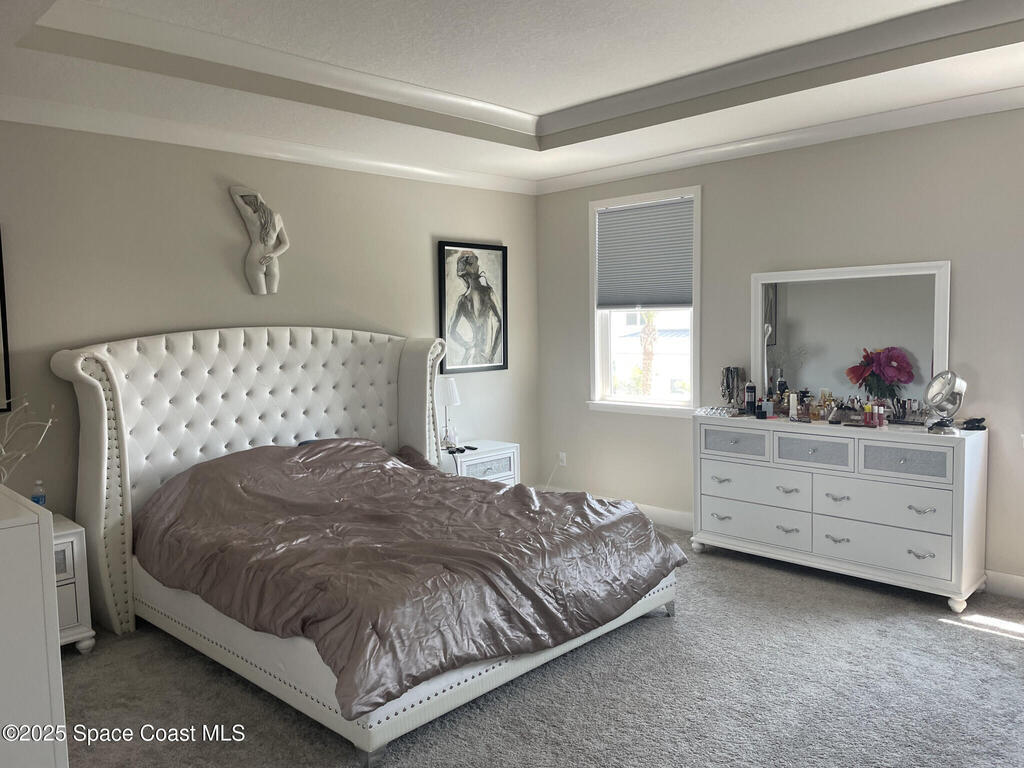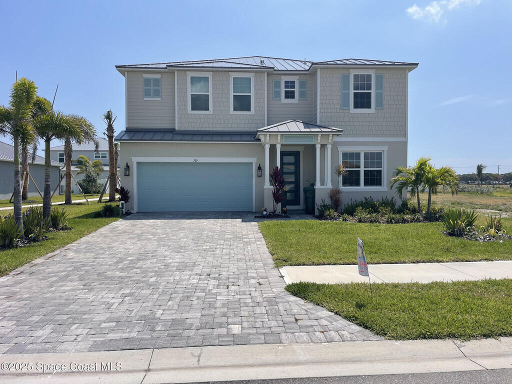 This stunning coastal residence sits on a premium lot just one block from the beach. The home features a metal roof, impact-rated windows, and an extended lanai perfect for outdoor enjoyment. About $70k in upgrades (incl. premium lot). Orion Model. Inside, the open-concept layout is elevated by crown-molded ceilings, wood-look tile flooring, and oil-rubbed bronze fixtures. The island kitchen, highlighted by marbled quartz countertops, rich cabinetry, and a spacious pantry, ideal for both entertaining and everyday living. The MBR has ocean view, along with an upgraded ensuite featuring dual vanities, a multi-head shower, and an expansive closet. Four upstairs bedrooms and three full baths, including a Jack-and-Jill bath between two bedrooms. Downstairs an office or 5th bedroom. The oversized garage provides additional room for parking, storage, or a home gym.