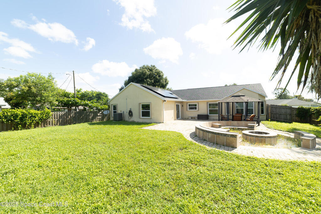 Beautiful well maintained 3 bedroom 2 bath home located on a quite street in NE Palm Bay. This pristine home offers newer paint, newer roof (2022), solar panels, new windows and accordion shutters, new A/C, new water heater, and updated bath rooms. The kitchen has beautiful granite countertops and upgraded faucet with a double sink. The flooring has masterfully laid stone tile throughout. The back of this home features a large paved area with a built in fire-pit and a gazebo great for entertaining or just relaxing.