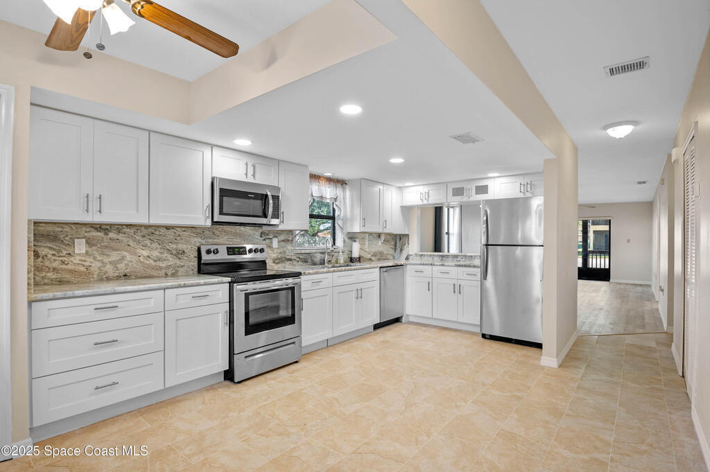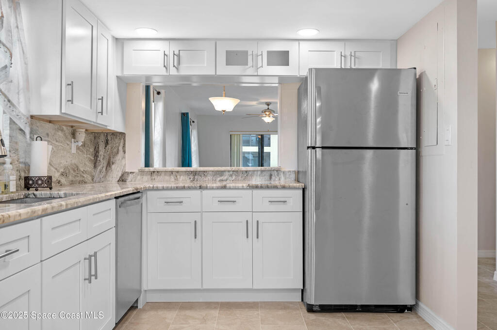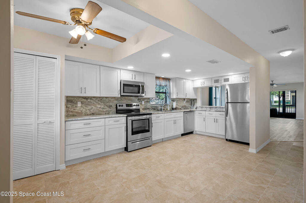 This roomy condo offers the perfect blend of comfort, space and coastal design! Featuring a bright and open kitchen that was recently updated with new soft close cabinets and granite throughout, newly installed stainless steel appliances as well as a new engineered vinyl planking and tile. This condo's amenities includes a beautiful large pool with new furniture & umbrellas as well as convenient car wash area. Centrally located just blocks from the world famous Cocoa Beach. This property is walking distance to excellent restaurants and shopping. As well as just a quick drive to Port Canaveral and Kennedy Space Center. The building features a newer roof installed in 2024 and A/C installed in 2022. There is also a common storage area to store all of your beach essentials. This condo offers unparalleled convenience. Don't miss the opportunity to experience the ultimate in coastal living on the Space Coast!