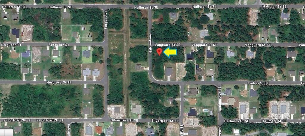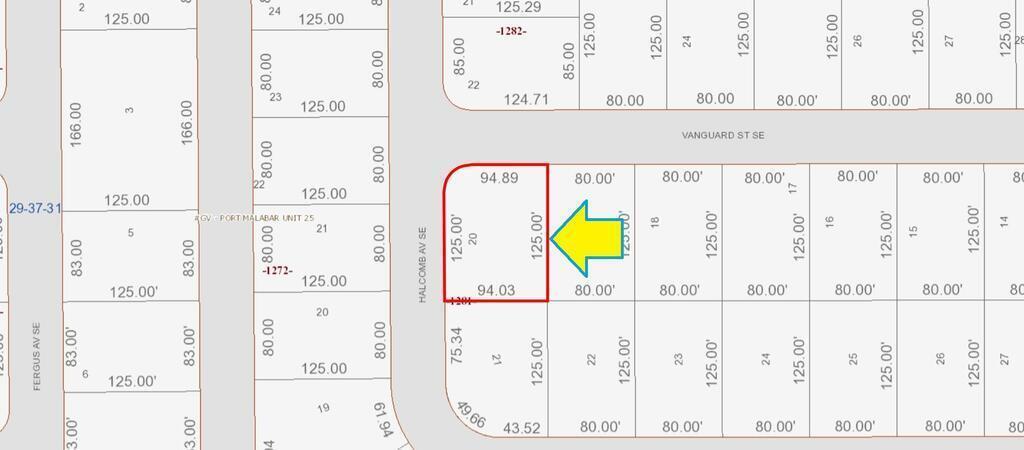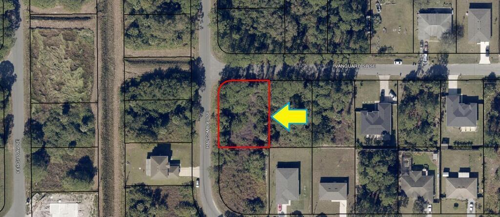 The Oversized 0.27 acre buildable single family residential corner lot [Rs2 Zoning] is available in Port Malabar Unit #25 of Palm Bay. Located in the southeast section near the Bayside Lakes Subdivision, this lot is just 3.1 miles - 7 minutes to Westside Elementary School, 4.3 miles - 10 minutes to the Publix Supermarket, 14.5 miles - 31 minutes to Melbourne Airport, and 19.4 miles - 34 minutes to the beaches of Indialantic. From exit #173 of I-95 go west on Malabar Road for .2 miles, left on San Filippo Drive for 6.7 miles, left on Firwood Avenue for .3 miles, right on Halloran Street for .2 miles, left on Halcomb Avenue, and left on Vanguard Street. The lot will be on your right at that corner.