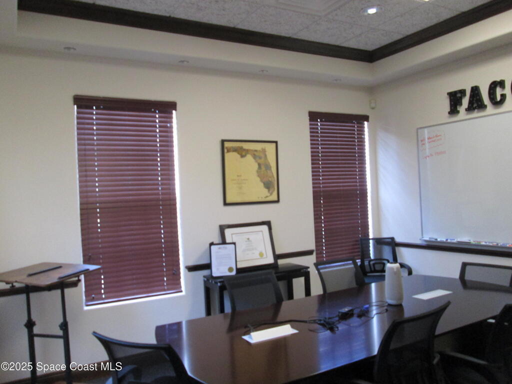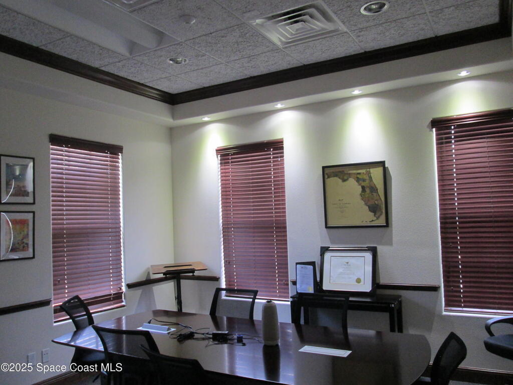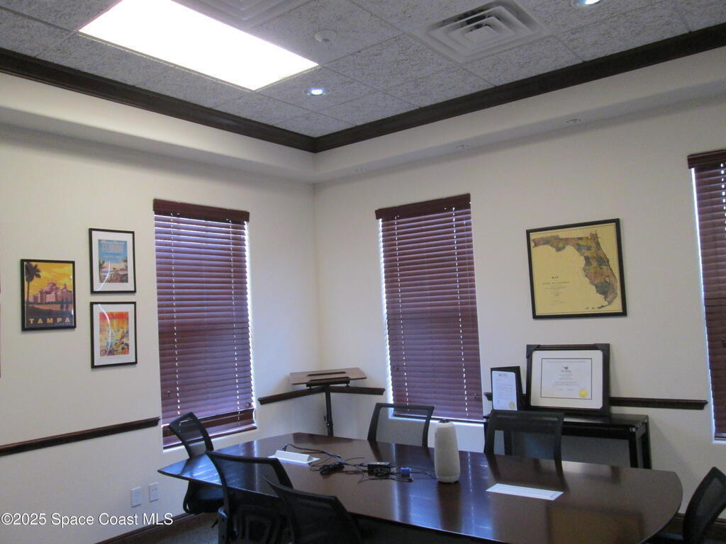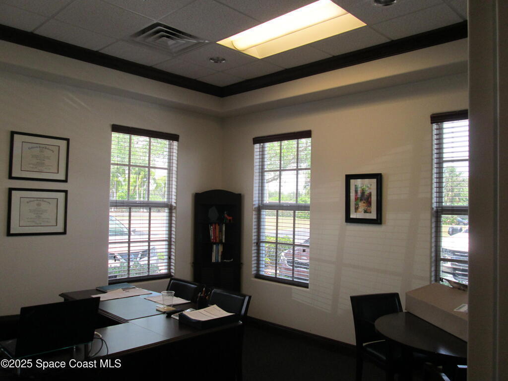 Great location!Minutes from I-95, Melbourne Airport and L3 Harris. Office includes full kitchen, lobby, conference room and 3 private offices with windows. Finishes include wood stained trim including crown molding ,chair rails and upgraded lighting package. Construction is concrete block with impact windows and doors.