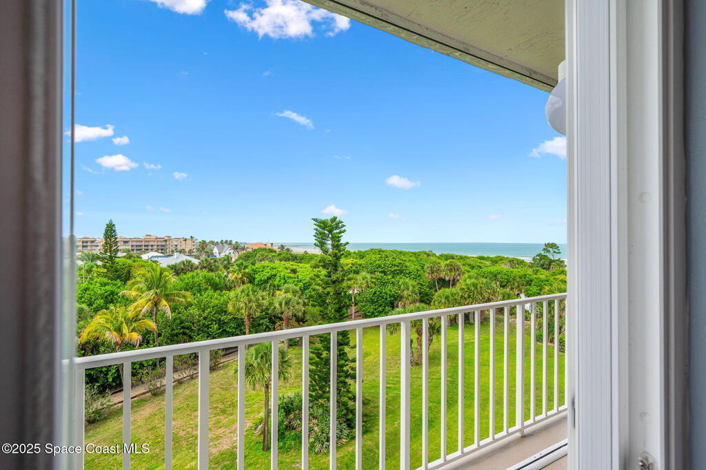 Experience coastal living at its finest in this top-floor oceanview penthouse at the desirable Ocean Oaks complex in Cape Canaveral. This beautifully appointed 2-bedroom, 2-bath condo also features a versatile flex room with sliding barn doors, perfect for a home office or guest space.Enjoy front-row seats to breathtaking rocket launches, serene views of lush green space, and the tranquil sound of ocean waves while you watch the tide roll in. The spacious living area opens up to panoramic vistas, where you can watch cruise ships drift by and feel the fresh sea breeze. The updated kitchen boast granite countertops, ample cabinet space, a coffee station, and a large pantry. Stylish tile floors throughout add to the modern coastal charm. The primary suite is a true retreat, offering spectacular ocean views, his & hers closets, dual vanities, and a luxurious jetted tub--perfect for unwinding after a long day on the beach! Includes a 1 car under building oversized garage! Call today!