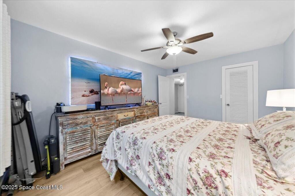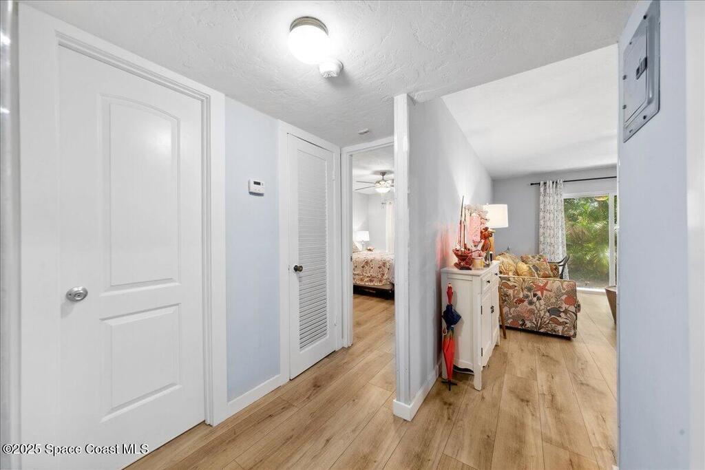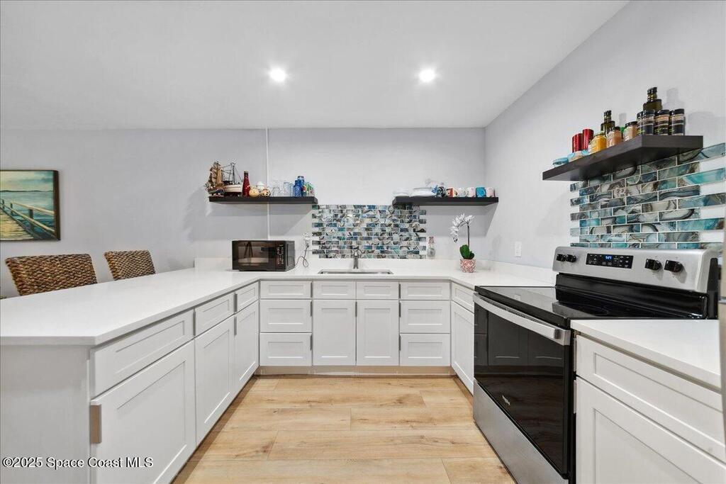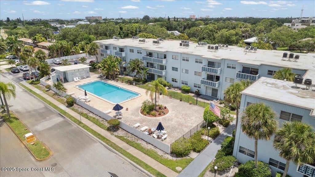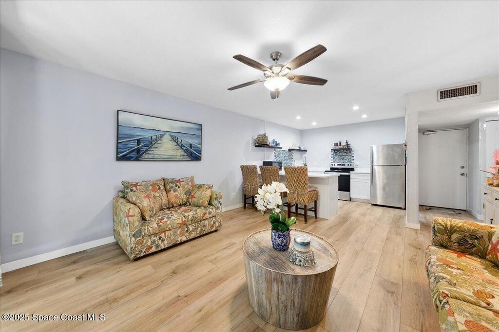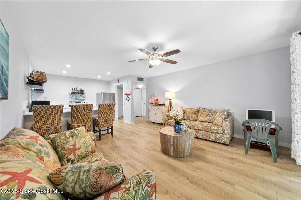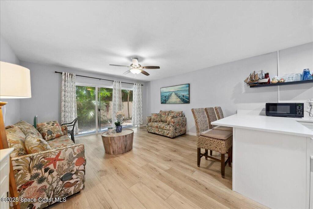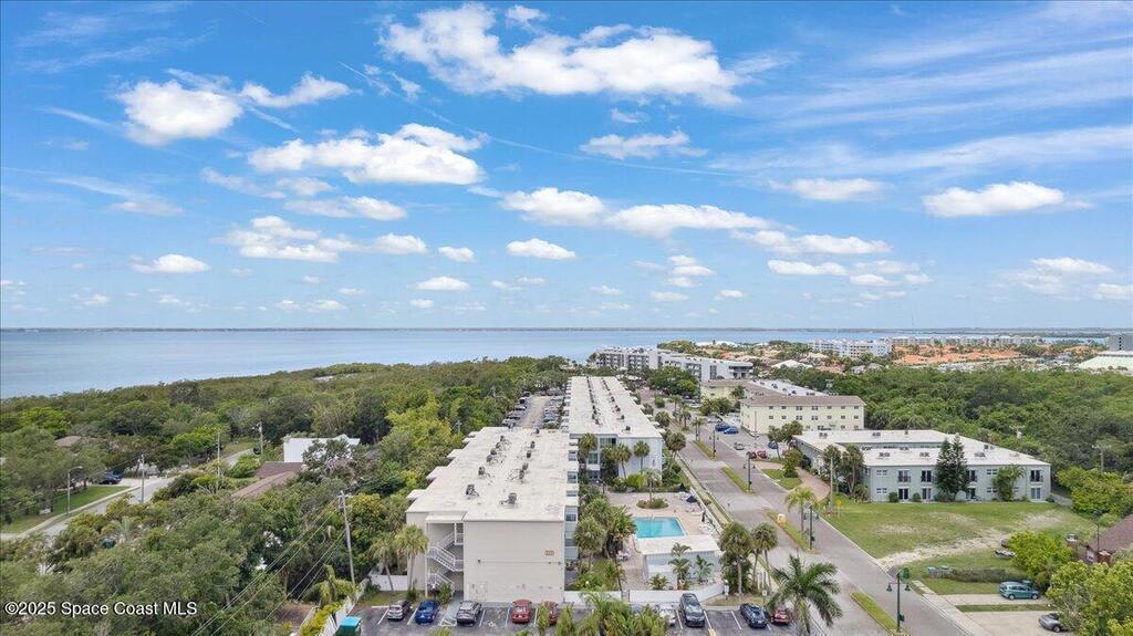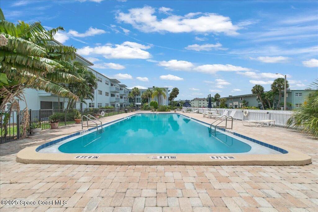 New lower price!! Own your slice of paradise just 0.8 miles from public beach access, minutes from Port Canaveral and a short 6 minute drive to the world famous Cocoa Beach Pier! Perfect for a full or part-time residence, or income producing rental (rent restricted to 1 month minimum). This fully updated (in 2022) 1 bed, 1 bath first floor unit comes with hurricane impact door and windows for peace of mind and comfort. The open floor plan and roomy kitchen are highlights of the condo. Easy to maintain upgraded luxury vinyl flooring, white cabinets and quartz countertops add to it's chic design. Association amenities include a sparkling community pool, secure entry, indoor mail area, elevator and laundry facility. Condo fees include trash, water and sewer and the building is currently being updated with new exterior paint.