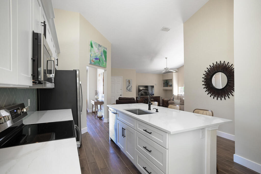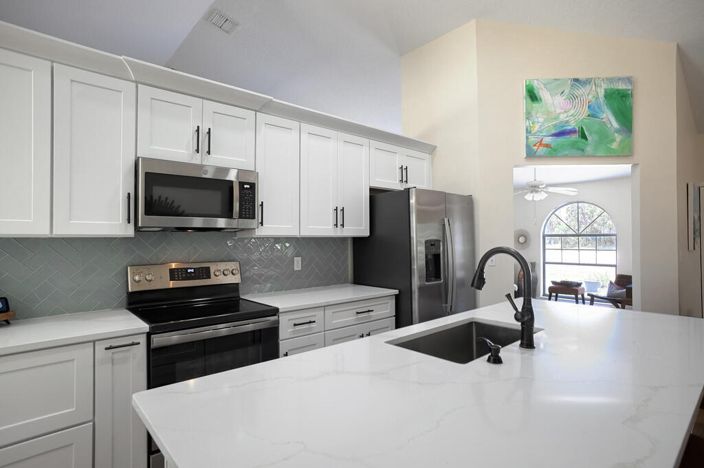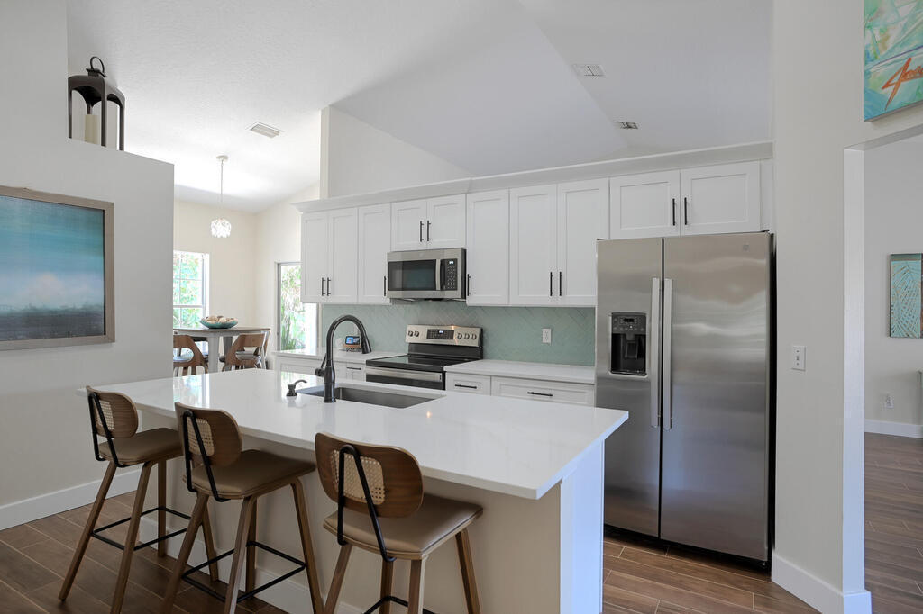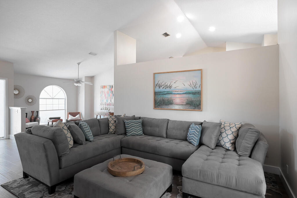 Seller will credit $20000 for new roof to be installed! Airbnb allowed here! Ocean access is only a 30 second stroll away from this Gorgeous TOTALLY Updated Home in Melbourne Beach! New 36'' Plank Ceramic Tile Throughout. New A/C 2020, Exterior Paint 2021, Complete Guest Bath and Primary Bath Remodel 2024, Complete Kitchen Remodel 2023 includes Quartz Countertops and Large Quartz Center Island that Has Breakfast Bar Perfect for Entertaining, Soft Close Cabinetry and New Stainless Steel Appliances, New Washer and Dryer 2023, New Garage Door with Keypad Entry and Security Camera, Garage Floor Epoxied, Freshly Painted Inside w/ New Baseboards. Super Floorplan with Split Bedrooms and One Bedroom has Private Entrance Door. Hurricane Shutters. Take a Stroll on the Sidewalk that Goes for Miles and Miles. Only a Mile Away from Ryckman Park that boasts the best sunsets around with Playground, Tennis Courts, Basketball and Clubhouse with Restrooms. Enjoy the long River Pier and Go Fish.