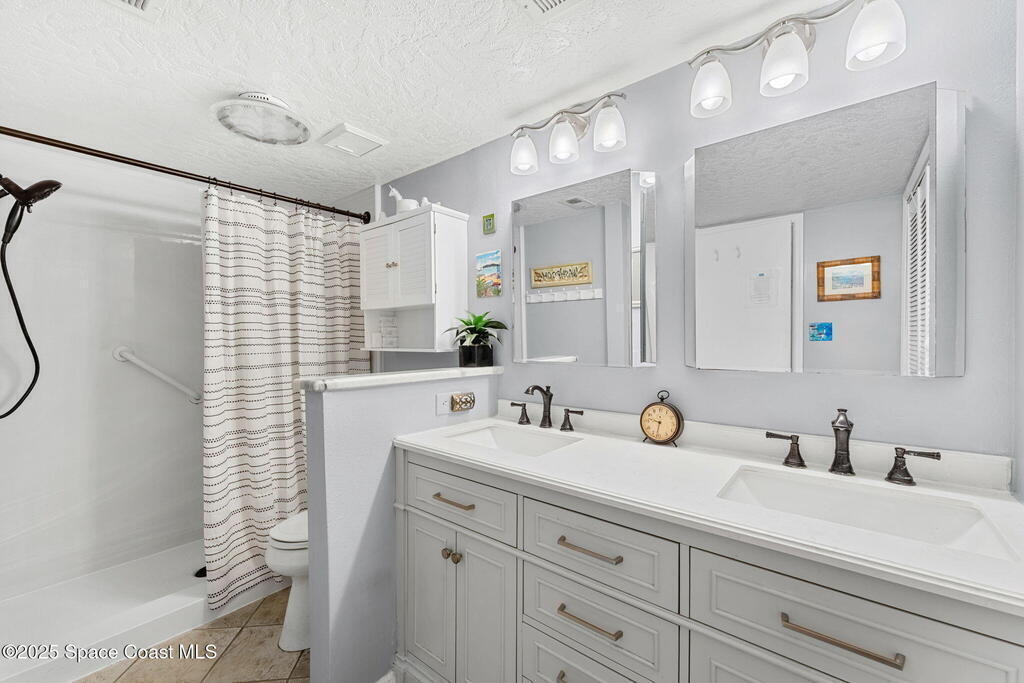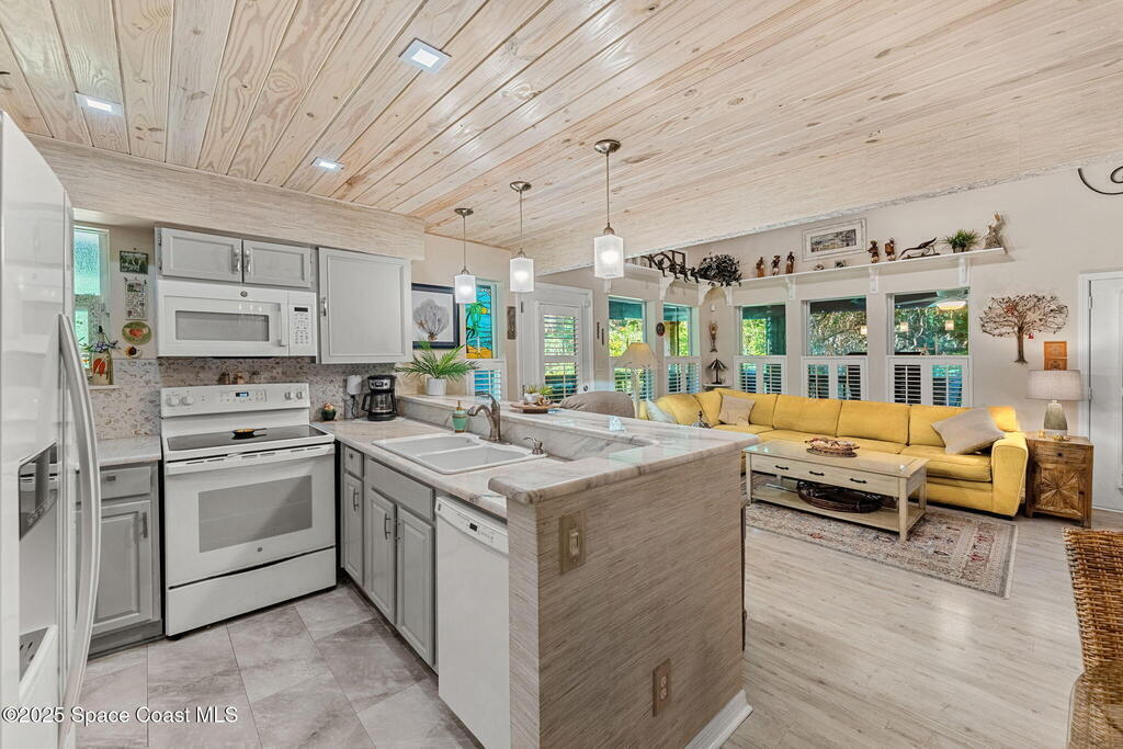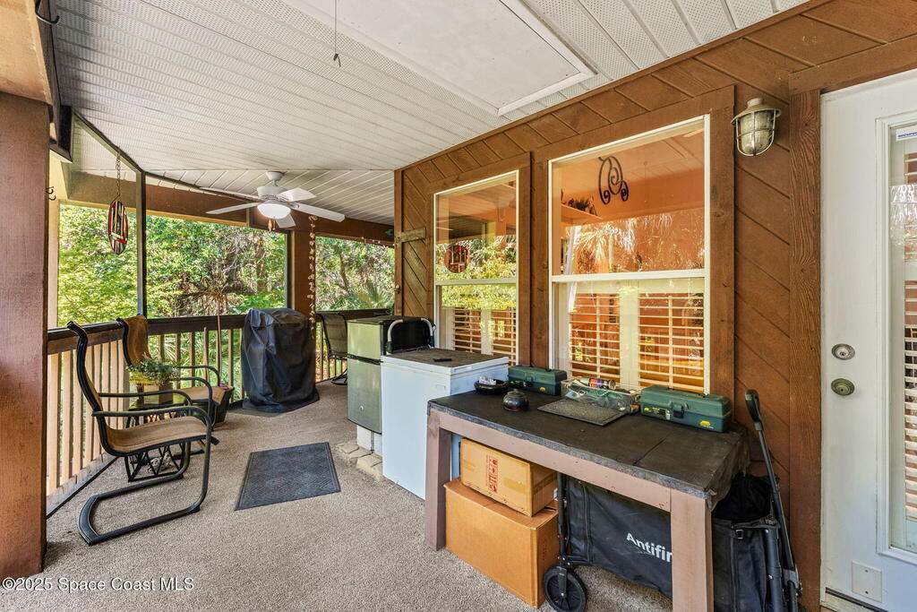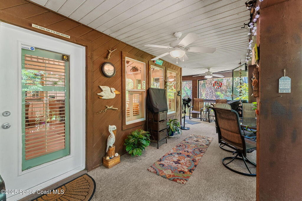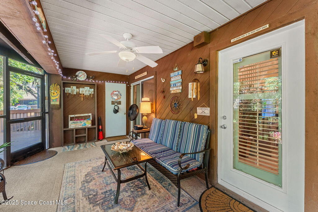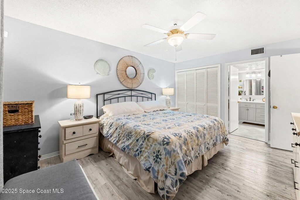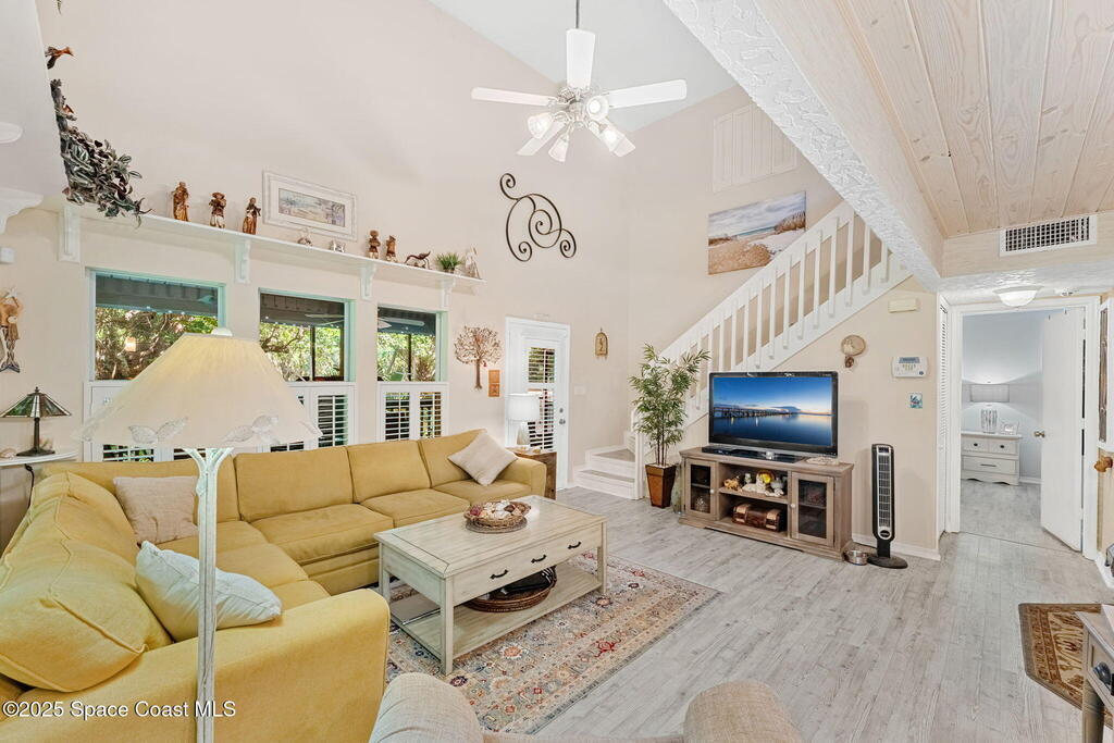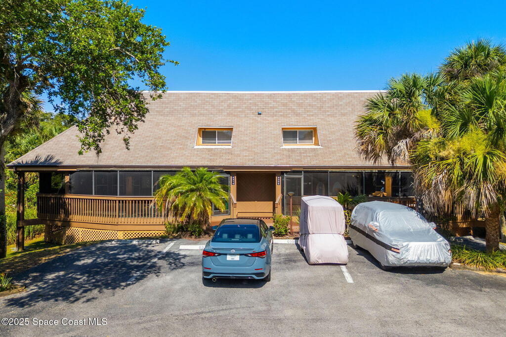 Floating among the treetops & kissed by coastal breezes, this Melbourne Beach condo feels like a private retreat in the sky. Nestled in the serene canopy of Treetop Village & just a short stroll from the sand, it blends a tranquil, elevated setting w/ thoughtful interior upgrades. The open layout unfolds beneath white-washed wood ceilings, w/ luxury vinyl plank flooring, quartz countertops, & recessed kitchen lighting creating a clean, coastal vibe. The main-floor primary suite offers a walk-in shower, double-sink vanity, & direct access to the washer & dryer for everyday ease. Upstairs, a spacious second bedroom boasts a walk-in closet & access to a full bath w/ soaking tub, while a versatile loft--complete with its own closet, makes the perfect office, lounge, or overflow sleeping space. The wraparound porch is a standout, offering wooded privacy, attic access via pull-down stairs & a dedicated storage shed, ideal for stashing surfboards, bikes, or beach gear after a day by the Ocean