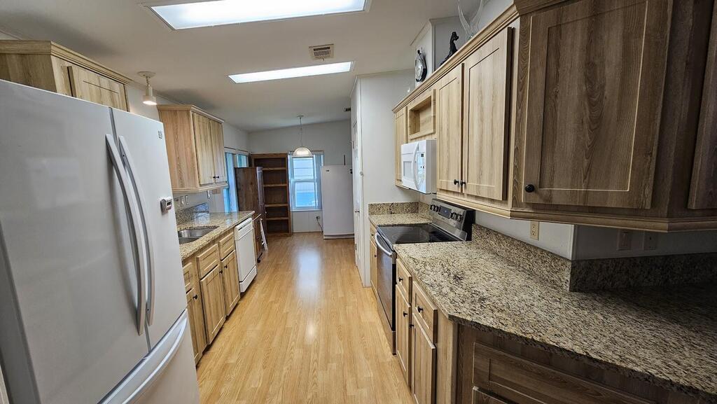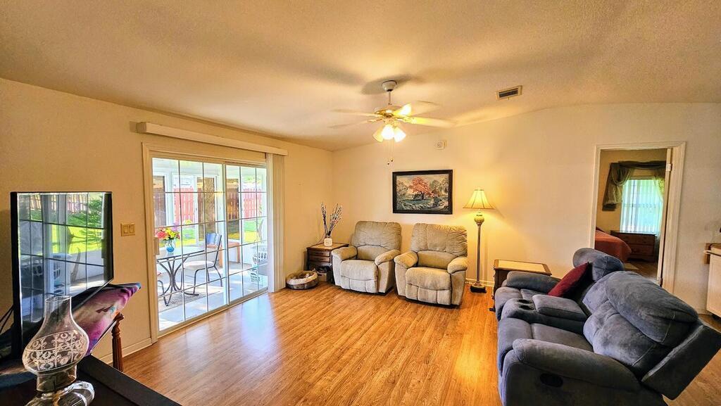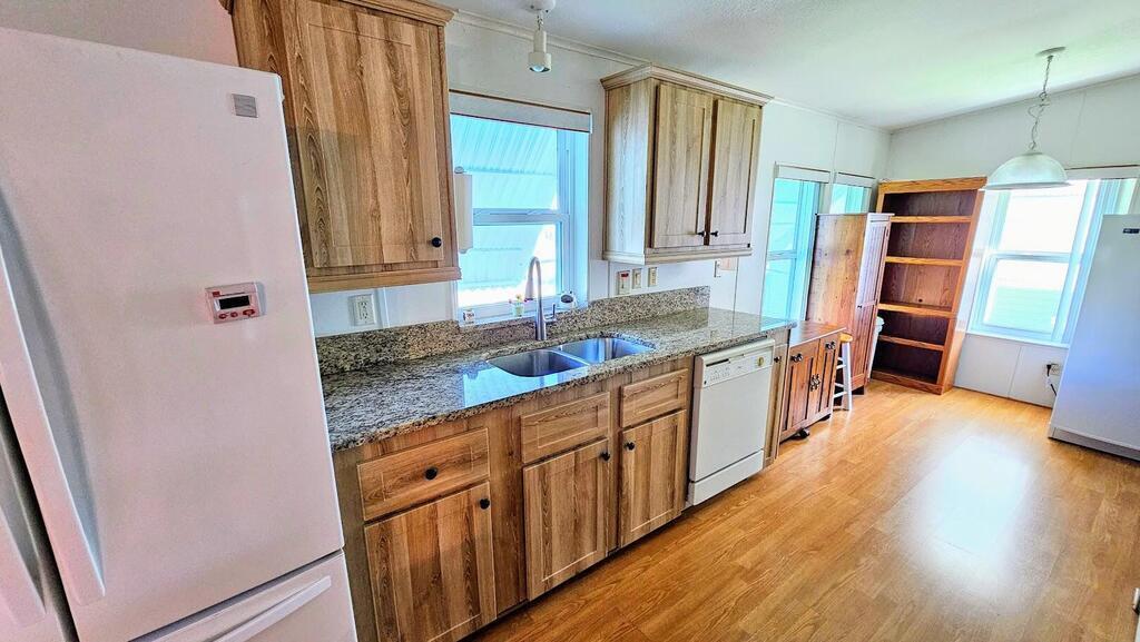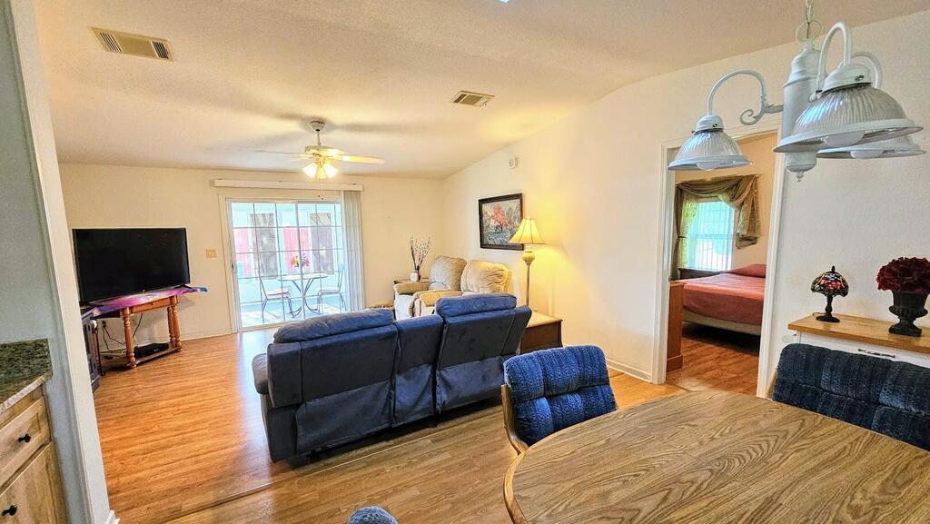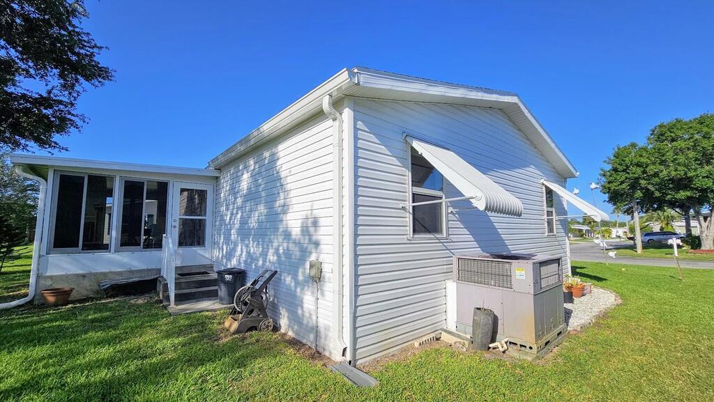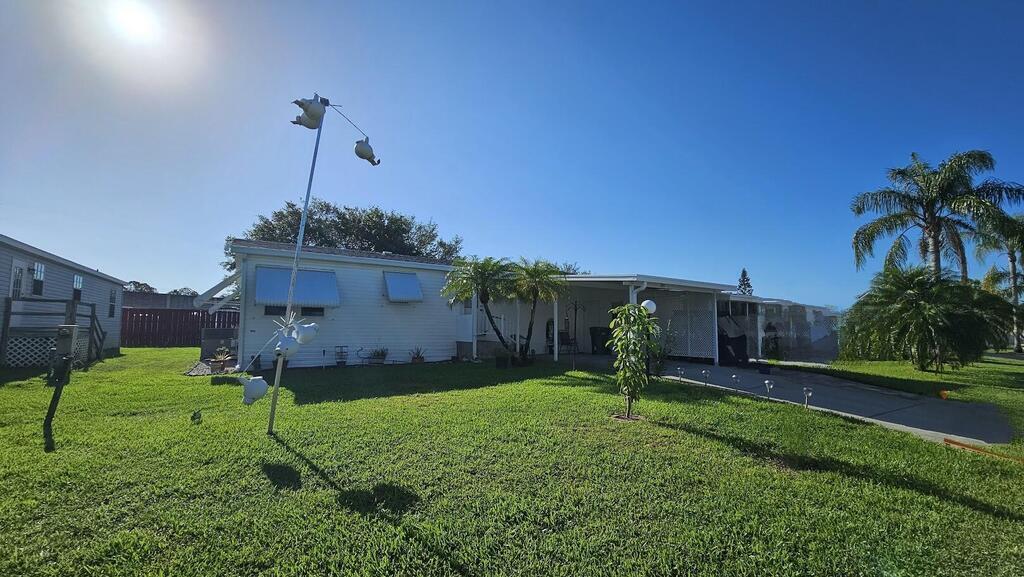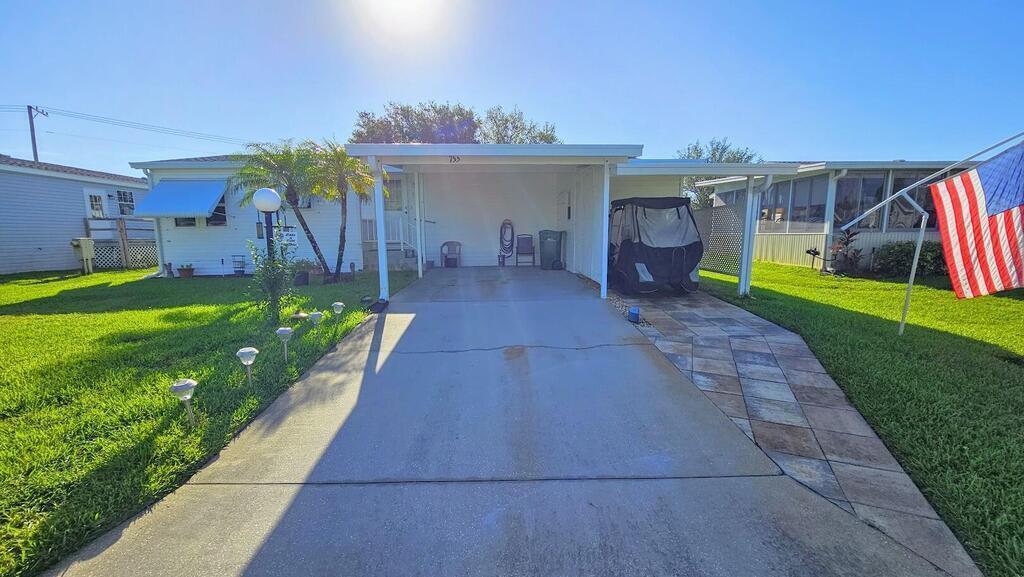 Feel at home on your First Day. This senior community where you own the land has many activities to enjoy. This 2/2 home has newer roof,granite counter in the kitchen,all new flooring and is move in ready.Complete with hurricane shutters and a charming back yard or sit on the patio with a glass of iced tea.You can see rocket launches from home and see beautiful sunsets at night. Hoa dues are low and they include cable,internet,and lawncare. Park your RV.or Boat for free.