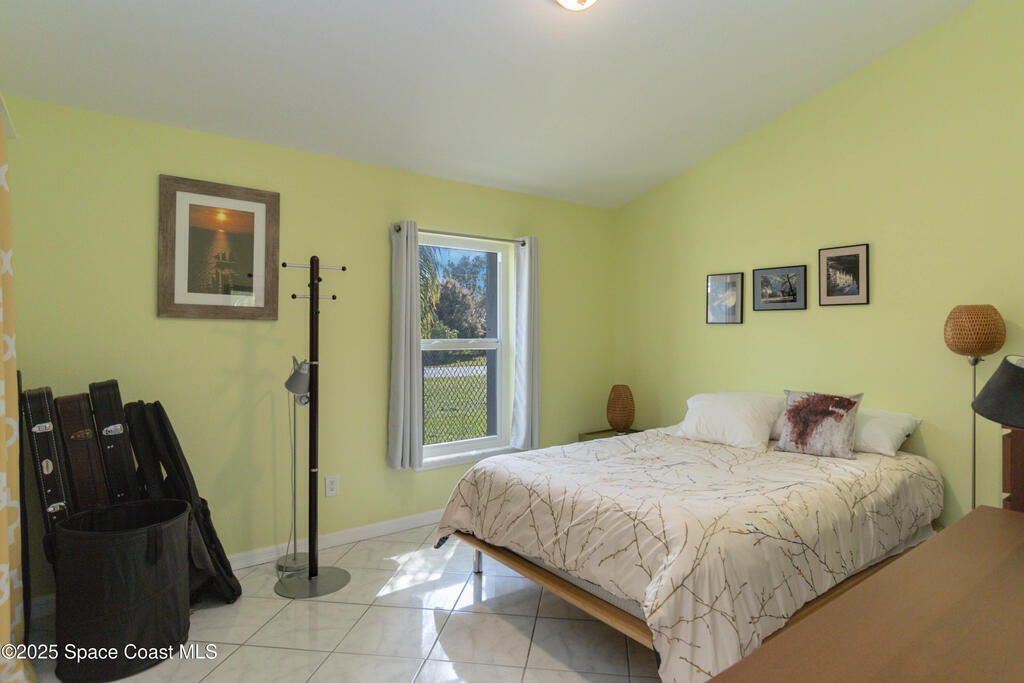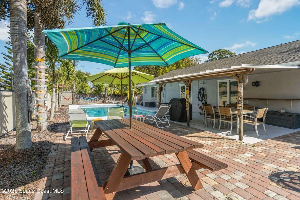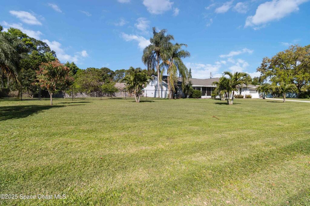 DESIRABLE DOUBLE LOT HOME!!! Welcome to this beautifully-maintained 4-bedroom, 2-bath home located in the heart of North Merritt Island on a spacious lot with many fruit trees and a fenced-in section ideal for dog-owners. Protected by hurricane rated impact windows, sliders, and garage door, and a whole-house Generac generator, all added in late-2017, and a new roof in 2023. The weather proof windows and doors, plus 6'' of new insulation added in 2018 combine to result in a monthly electric bill which averaged less than $192/mo. in 2024. The condenser for the HVAC system was replaced in feb 2023 and has a 10-year transferable warranty. All utilities have been professionally serviced annually. The split floor plan offers vaulted ceilings and an open living area filled with natural light. The kitchen includes a gas range and large refrigerator, both new in 2017 and quartz countertops installed in 2019. Step outside to a large patio and pool area--an oasis ideal for relaxing or hosting.