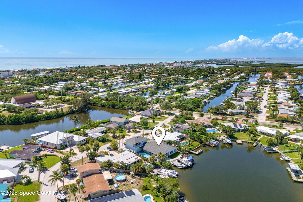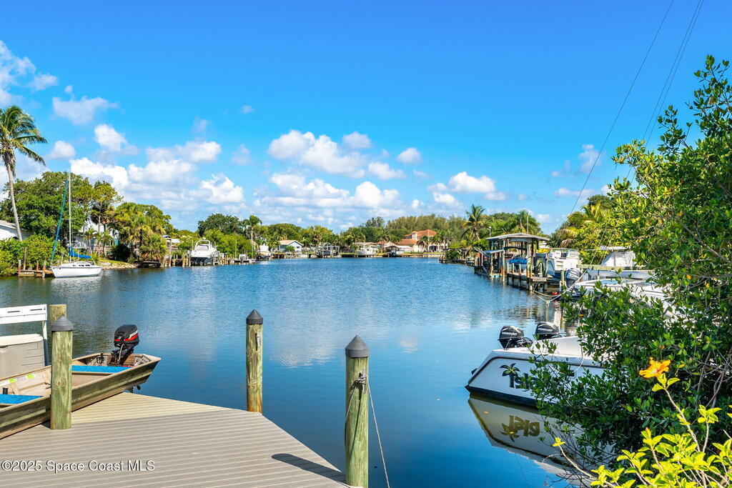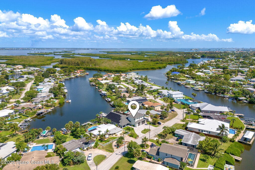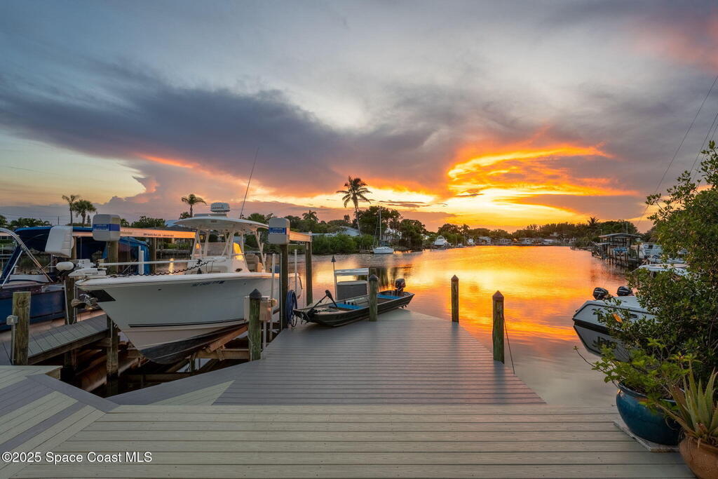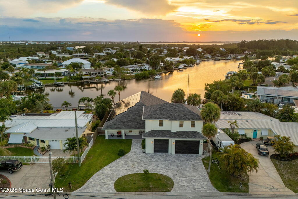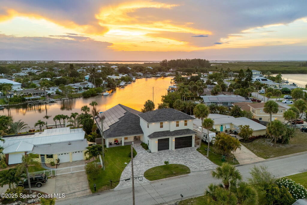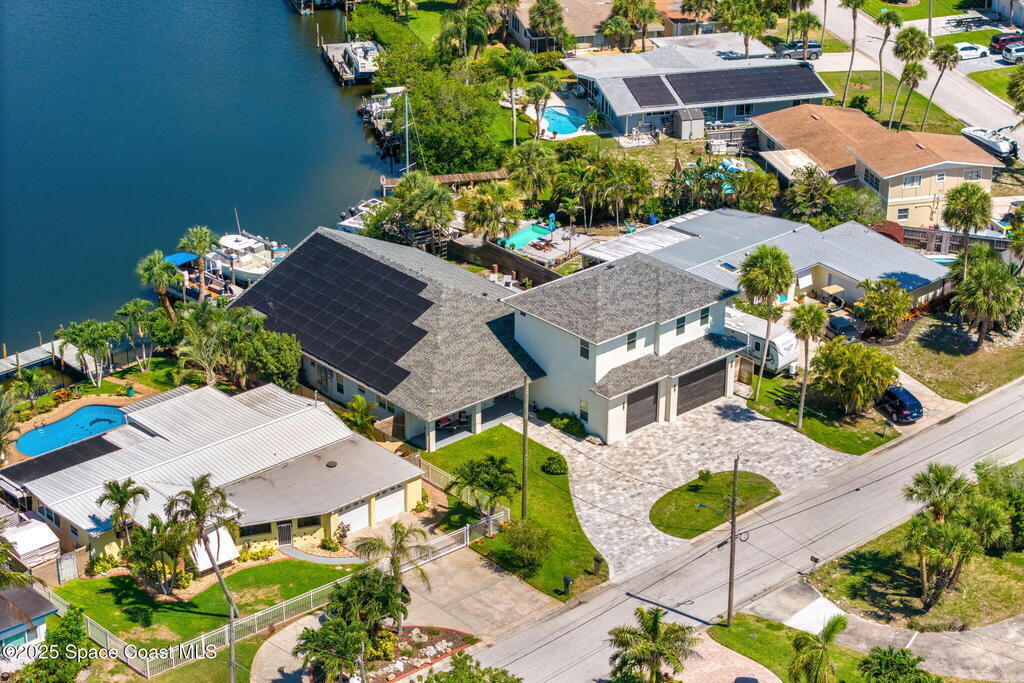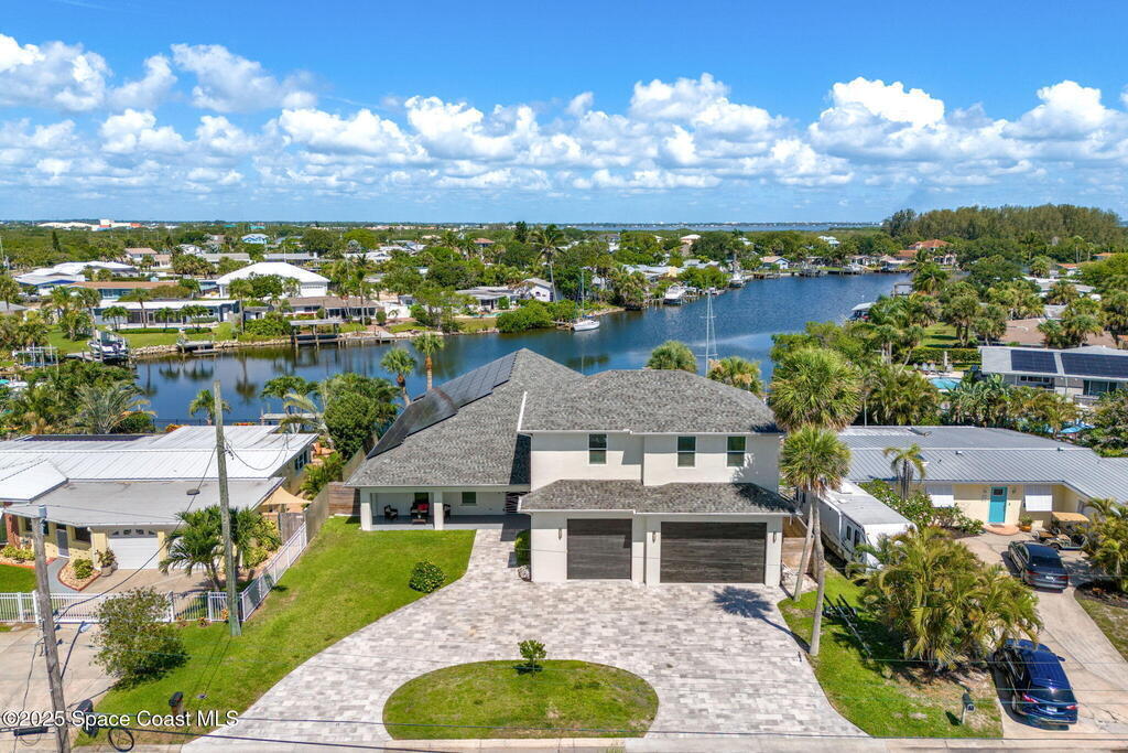 Experience waterfront living in this 2023 custom-built 5-bedroom, 5-bath home, located on a wide canal with stunning sunset views-- short walk to the beach, downtown Cocoa Beach, and a bike ride to the golf course. This luxury residence features a pool with full pool bath, and a 3-car garage with A/C, tall ceilings, and extra-high doors. The new dock includes water, electric, and two boat lifts. Inside, enjoy a chef's kitchen with 36'' gas range, pot filler, Bosch ultra-quiet dishwasher, tankless gas water heater, butler's pantry, and vaulted ceilings. The primary suite offers a spa-like bath with zero-entry shower, soaking tub, oversized closet. Additional highlights include illuminated mirrors in all baths, custom tongue-and-groove cypress ceilings, generator hookup, and a full solar system for $0 electric bills. A private 850 sq ft guest suite features its own kitchen, laundry, two queen beds, and a balcony--ideal for guests, income, or in-law living. Luxury, efficiency & location