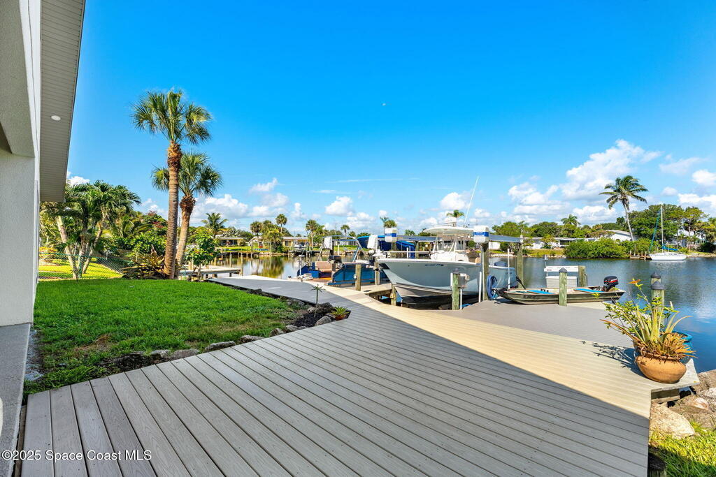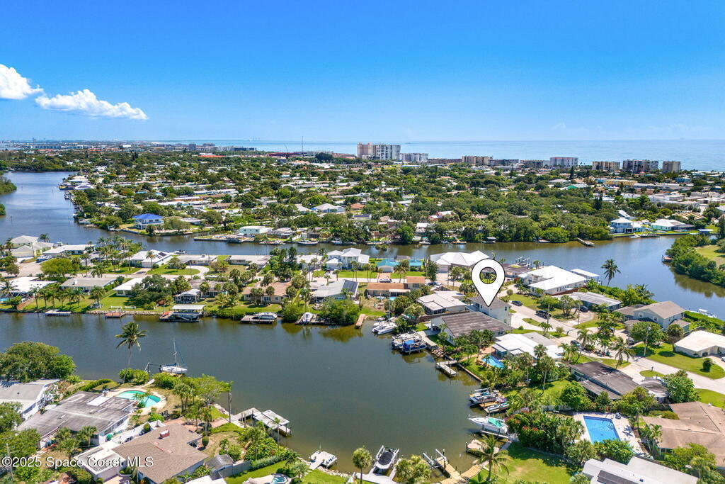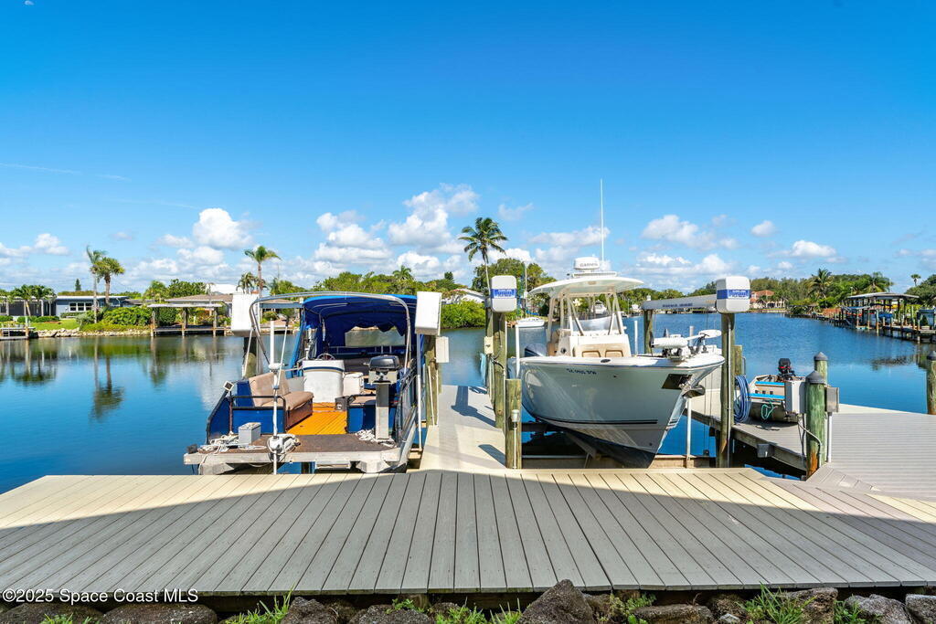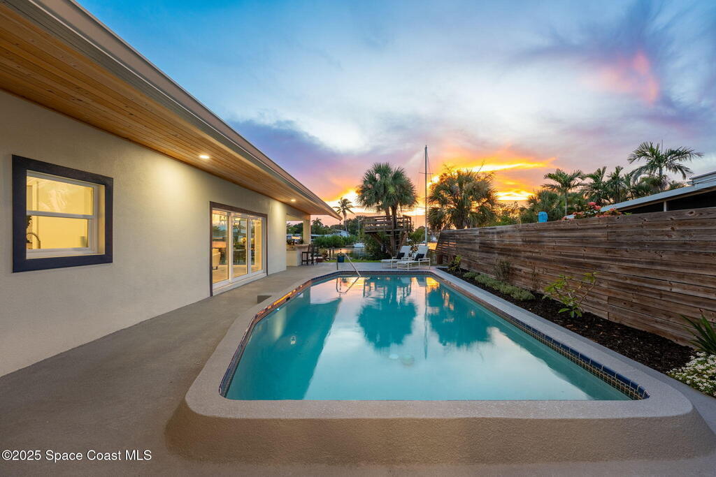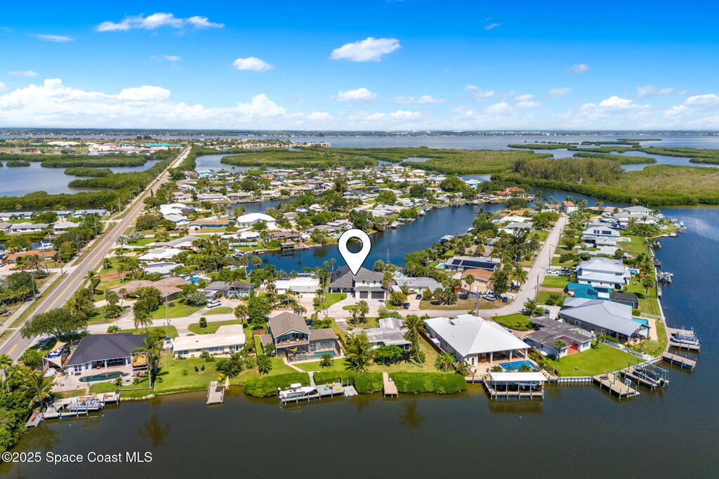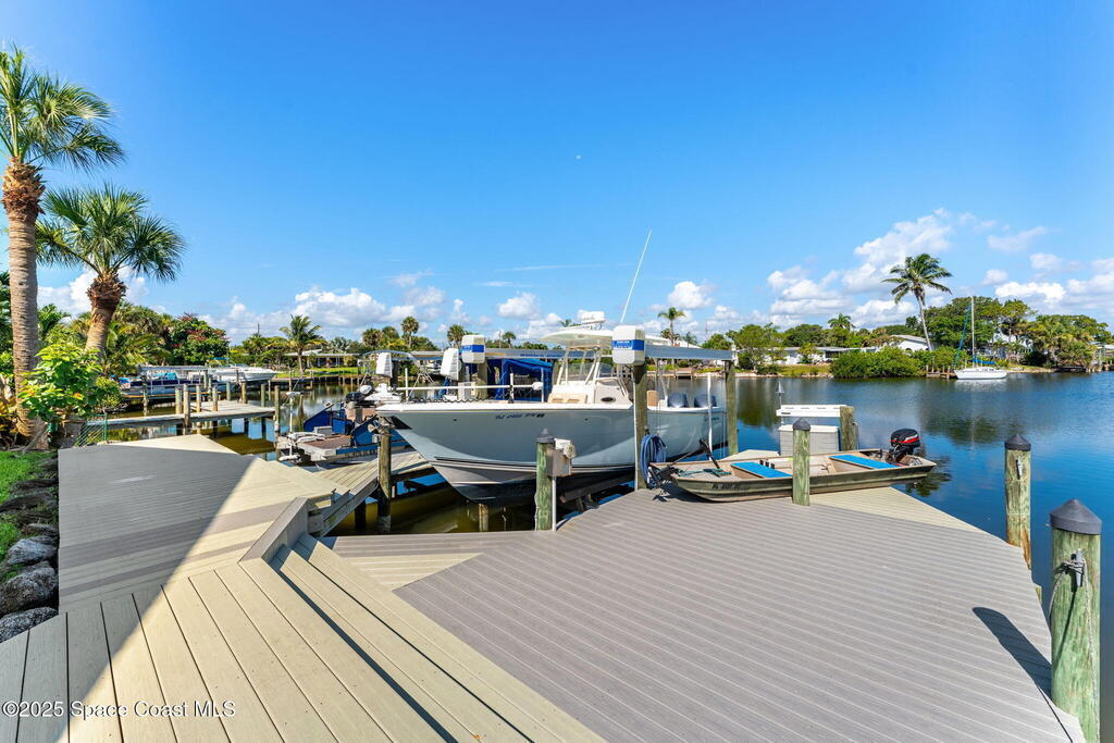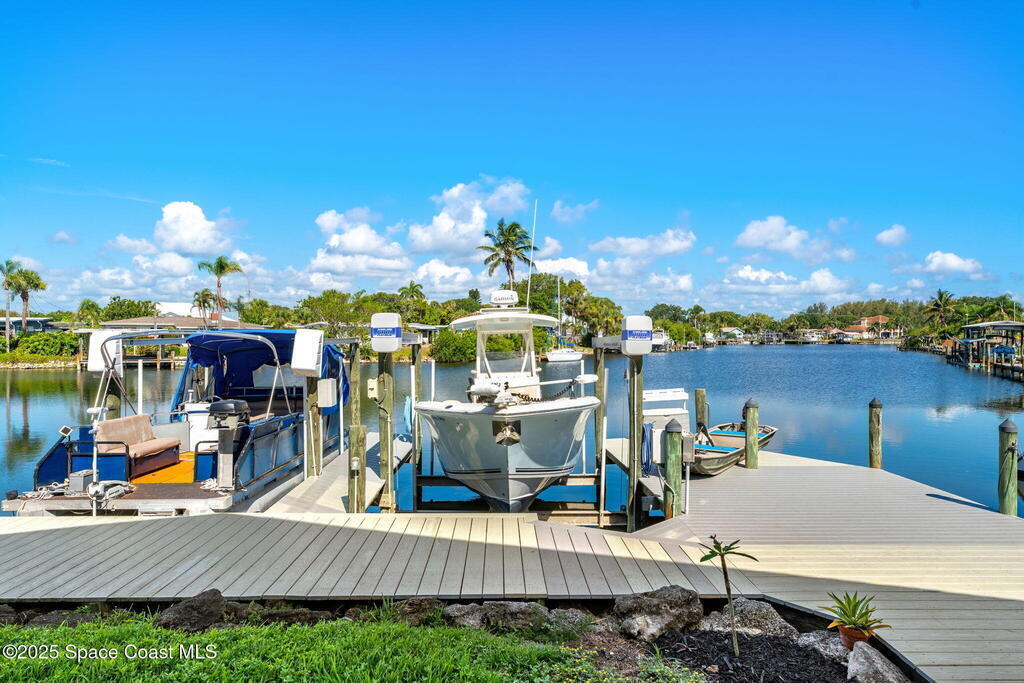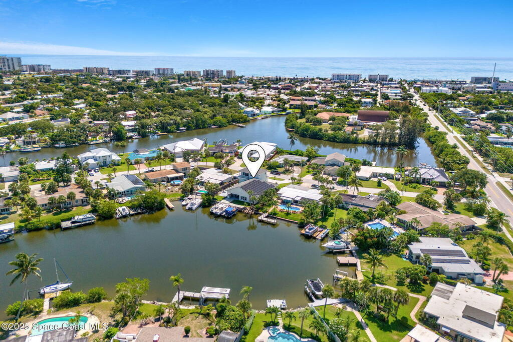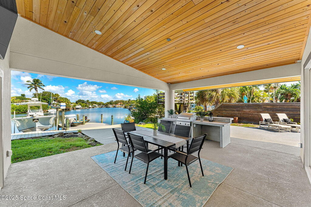 Experience waterfront living in this 2023 custom-built 5-bedroom, 5-bath home, located on a wide canal with stunning sunset views-- short walk to the beach, downtown Cocoa Beach, and a bike ride to the golf course. This luxury residence features a pool with full pool bath, and a 3-car garage with A/C, tall ceilings, and extra-high doors. The new dock includes water, electric, and two boat lifts. Inside, enjoy a chef's kitchen with 36'' gas range, pot filler, Bosch ultra-quiet dishwasher, tankless gas water heater, butler's pantry, and vaulted ceilings. The primary suite offers a spa-like bath with zero-entry shower, soaking tub, oversized closet. Additional highlights include illuminated mirrors in all baths, custom tongue-and-groove cypress ceilings, generator hookup, and a full solar system for $0 electric bills. A private 850 sq ft guest suite features its own kitchen, laundry, two queen beds, and a balcony--ideal for guests, income, or in-law living. Luxury, efficiency & location