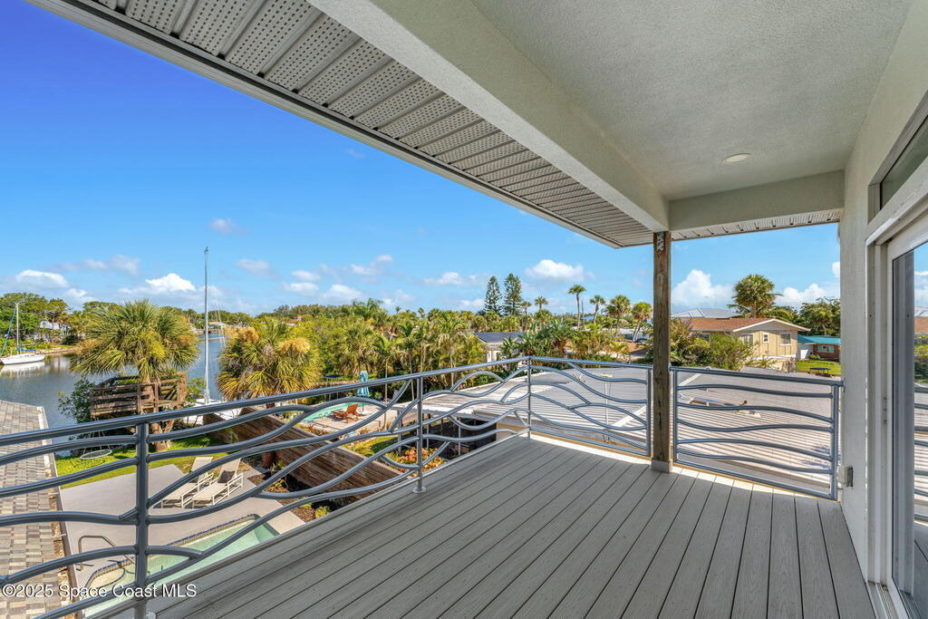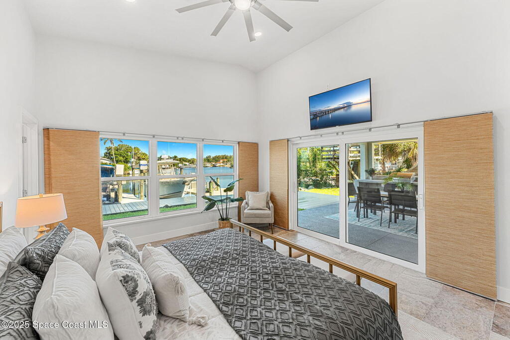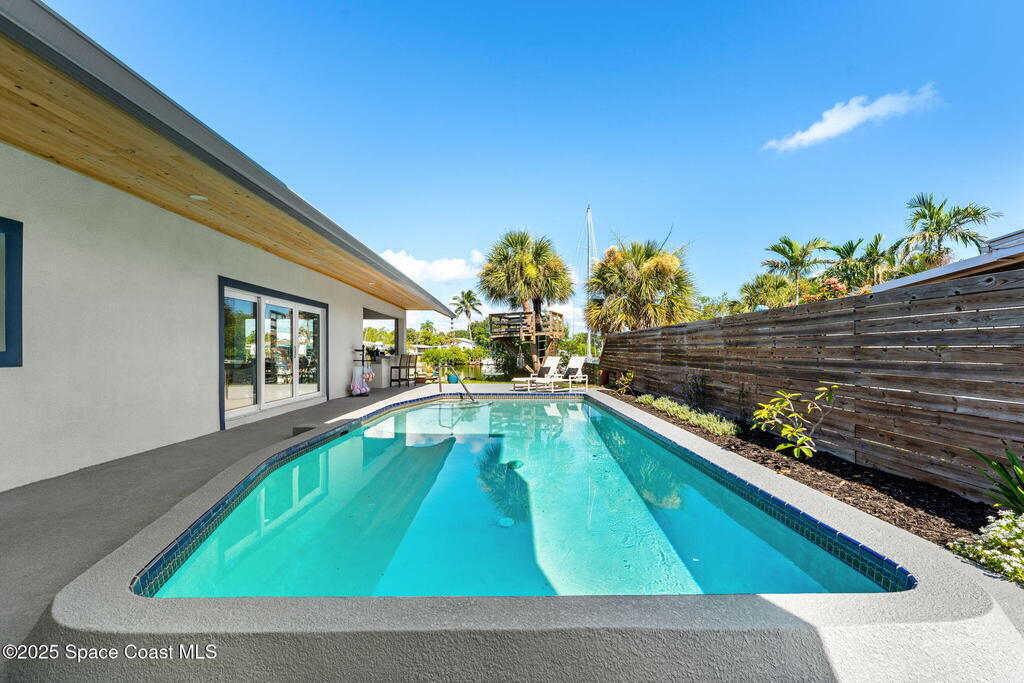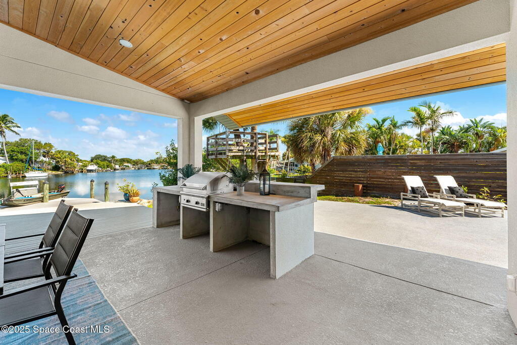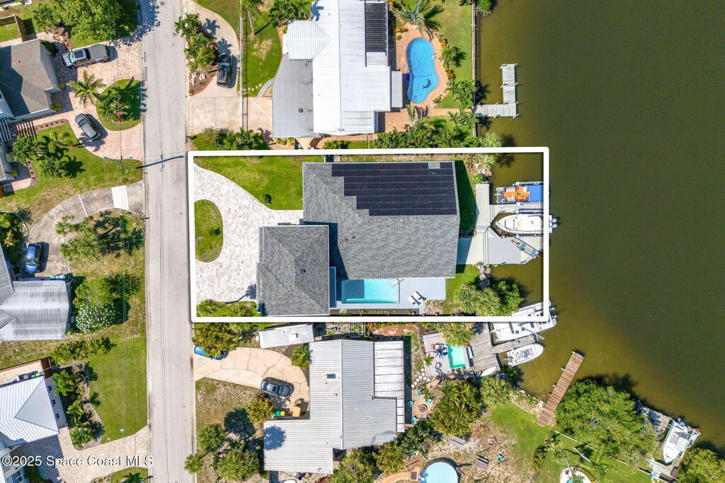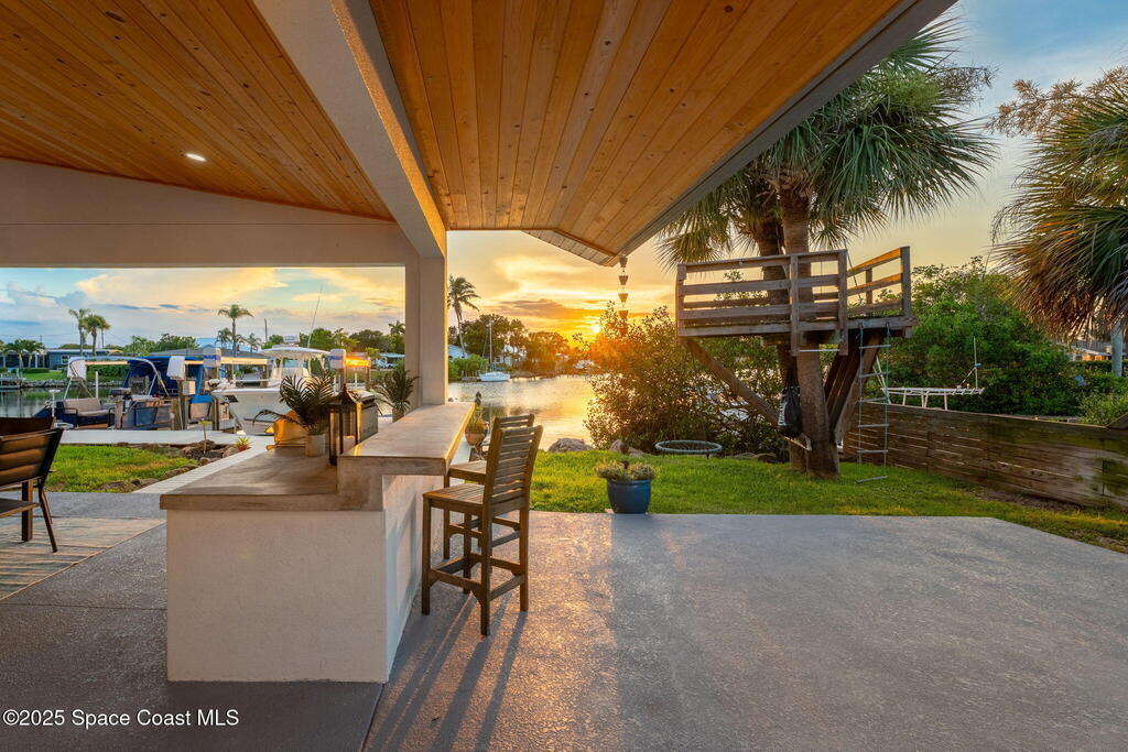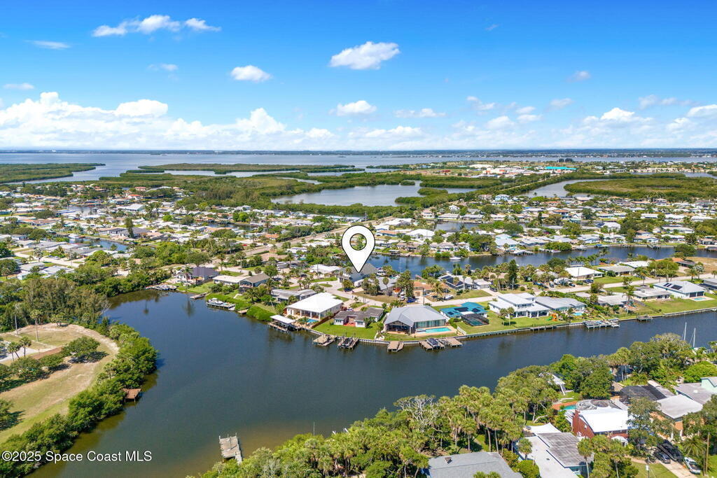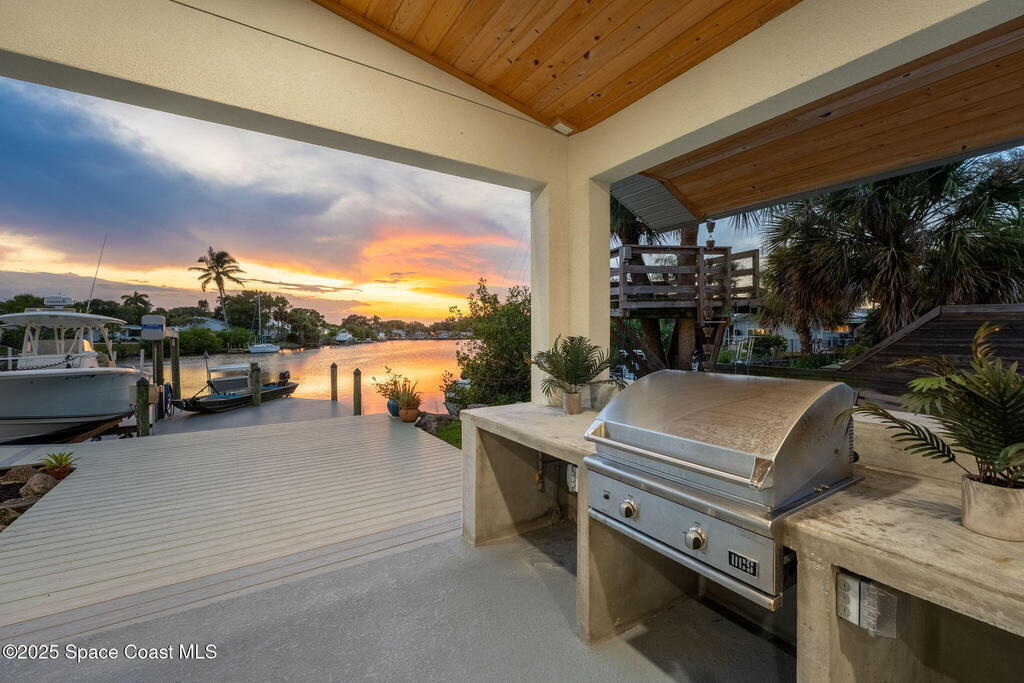 Experience waterfront living in this 2023 custom-built 5-bedroom, 5-bath home, located on a wide canal with stunning sunset views-- short walk to the beach, downtown Cocoa Beach, and a bike ride to the golf course. This luxury residence features a pool with full pool bath, and a 3-car garage with A/C, tall ceilings, and extra-high doors. The new dock includes water, electric, and two boat lifts. Inside, enjoy a chef's kitchen with 36'' gas range, pot filler, Bosch ultra-quiet dishwasher, tankless gas water heater, butler's pantry, and vaulted ceilings. The primary suite offers a spa-like bath with zero-entry shower, soaking tub, oversized closet. Additional highlights include illuminated mirrors in all baths, custom tongue-and-groove cypress ceilings, generator hookup, and a full solar system for $0 electric bills. A private 850 sq ft guest suite features its own kitchen, laundry, two queen beds, and a balcony--ideal for guests, income, or in-law living. Luxury, efficiency & location
