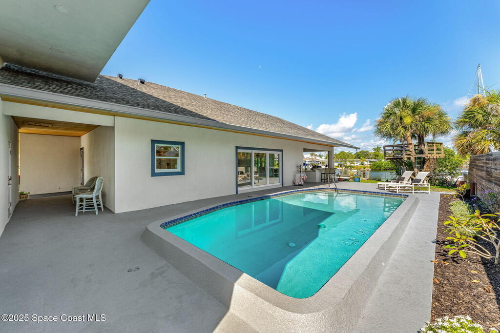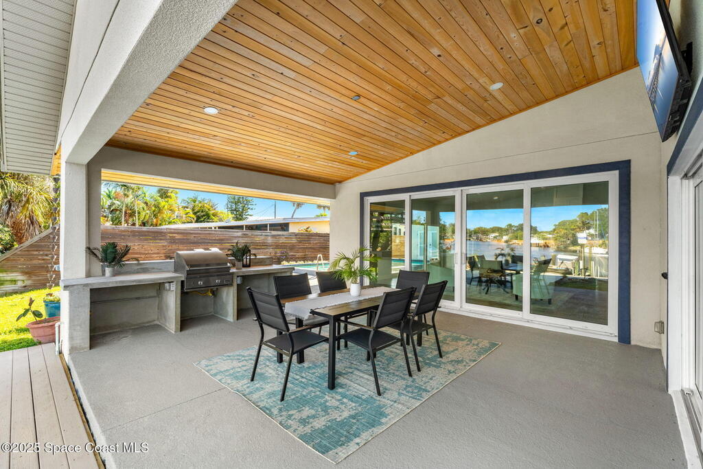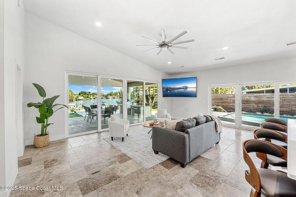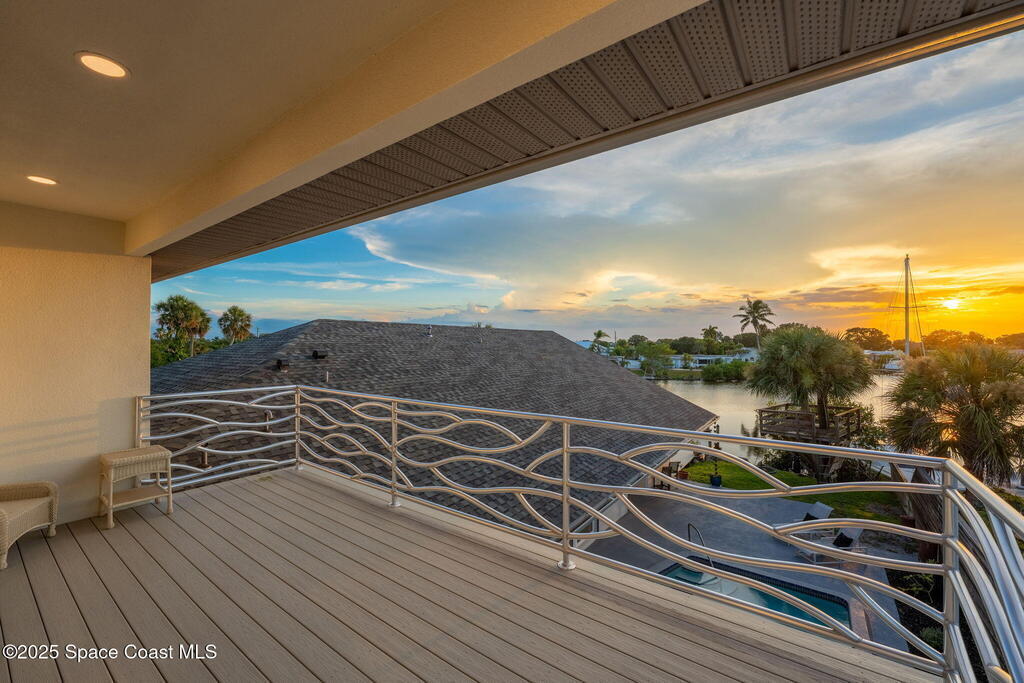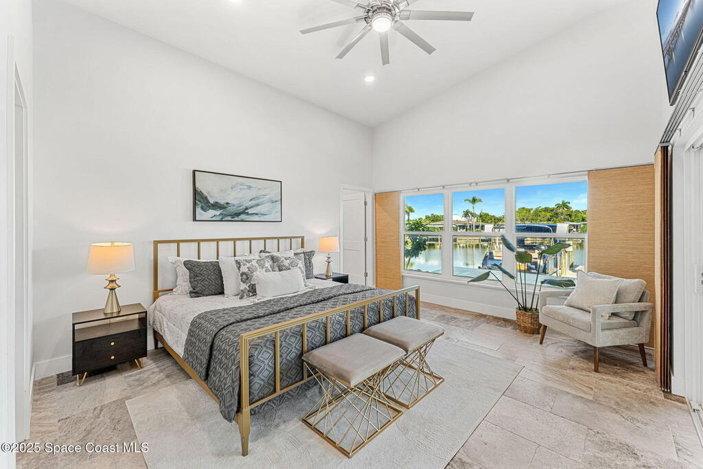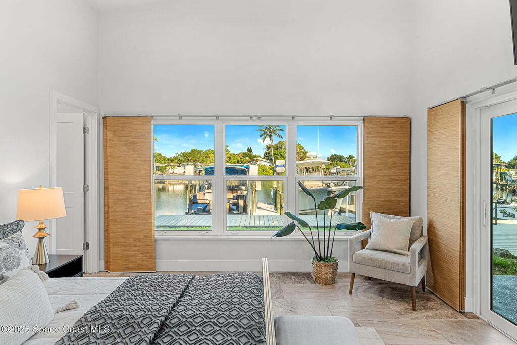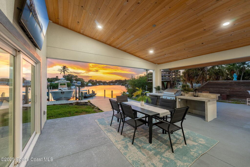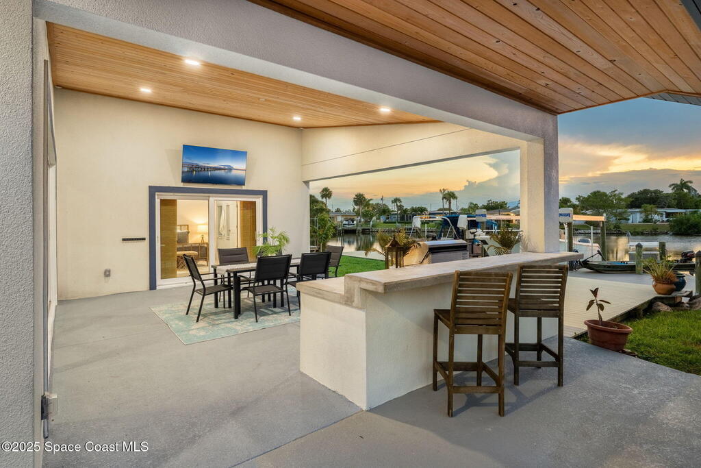 Experience waterfront living in this 2023 custom-built 5-bedroom, 5-bath home, located on a wide canal with stunning sunset views-- short walk to the beach, downtown Cocoa Beach, and a bike ride to the golf course. This luxury residence features a pool with full pool bath, and a 3-car garage with A/C, tall ceilings, and extra-high doors. The new dock includes water, electric, and two boat lifts. Inside, enjoy a chef's kitchen with 36'' gas range, pot filler, Bosch ultra-quiet dishwasher, tankless gas water heater, butler's pantry, and vaulted ceilings. The primary suite offers a spa-like bath with zero-entry shower, soaking tub, oversized closet. Additional highlights include illuminated mirrors in all baths, custom tongue-and-groove cypress ceilings, generator hookup, and a full solar system for $0 electric bills. A private 850 sq ft guest suite features its own kitchen, laundry, two queen beds, and a balcony--ideal for guests, income, or in-law living. Luxury, efficiency & location