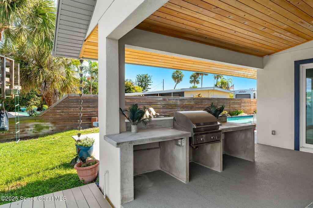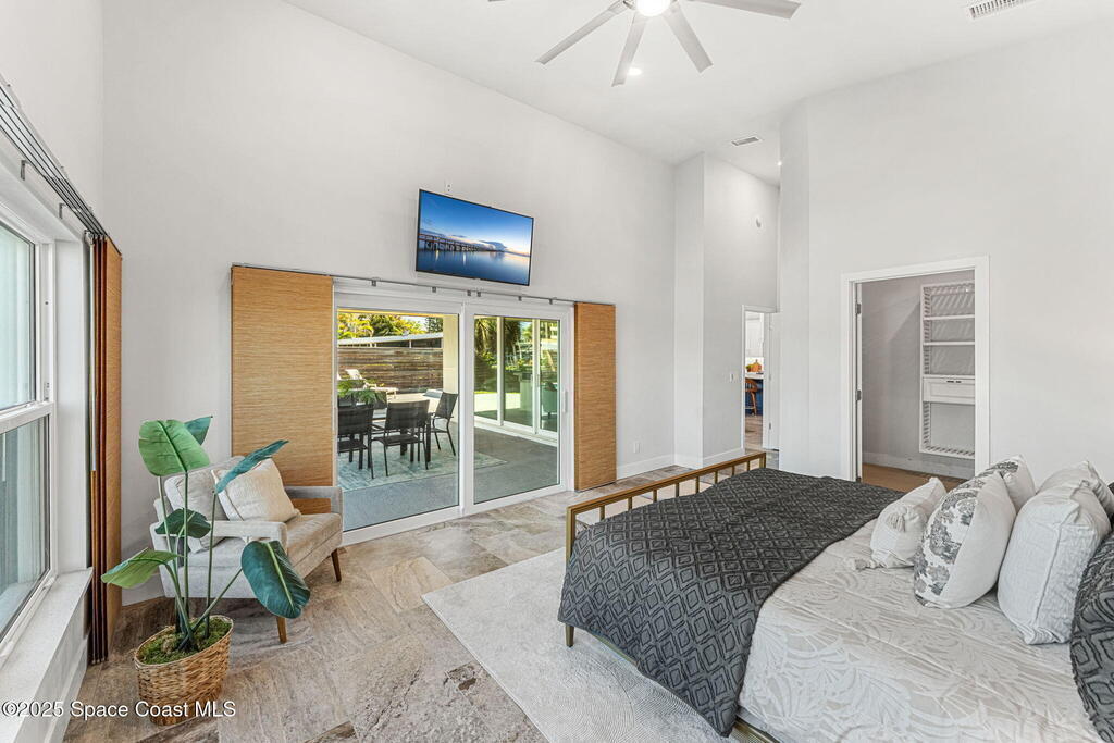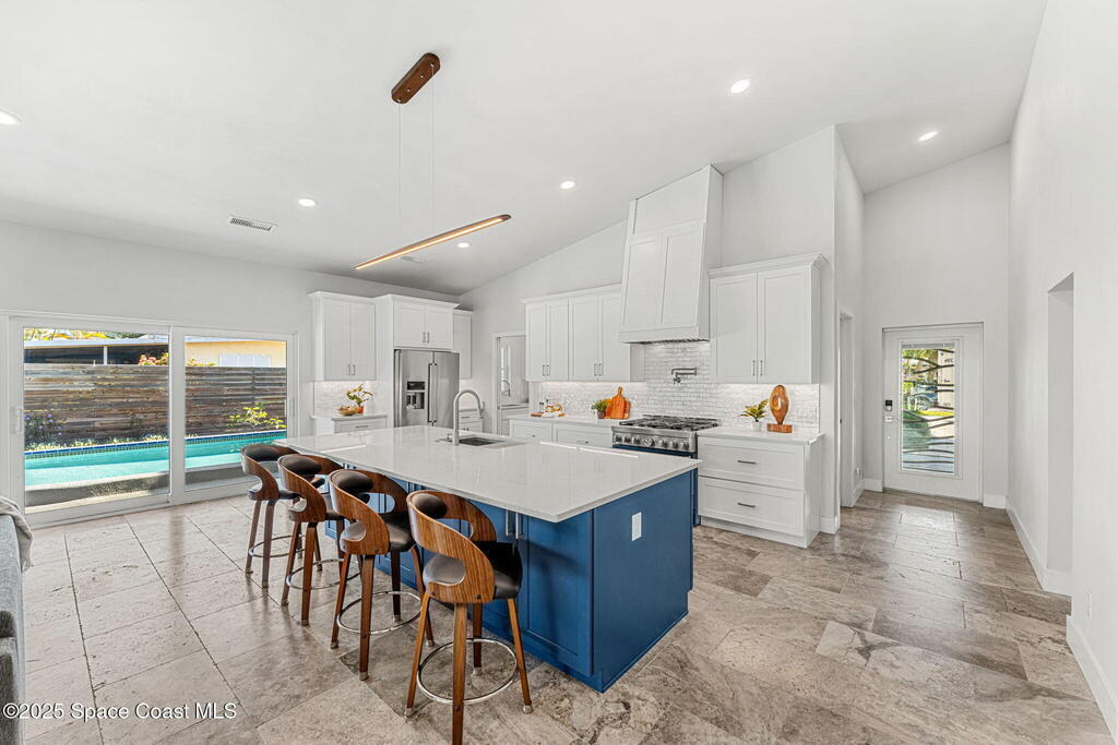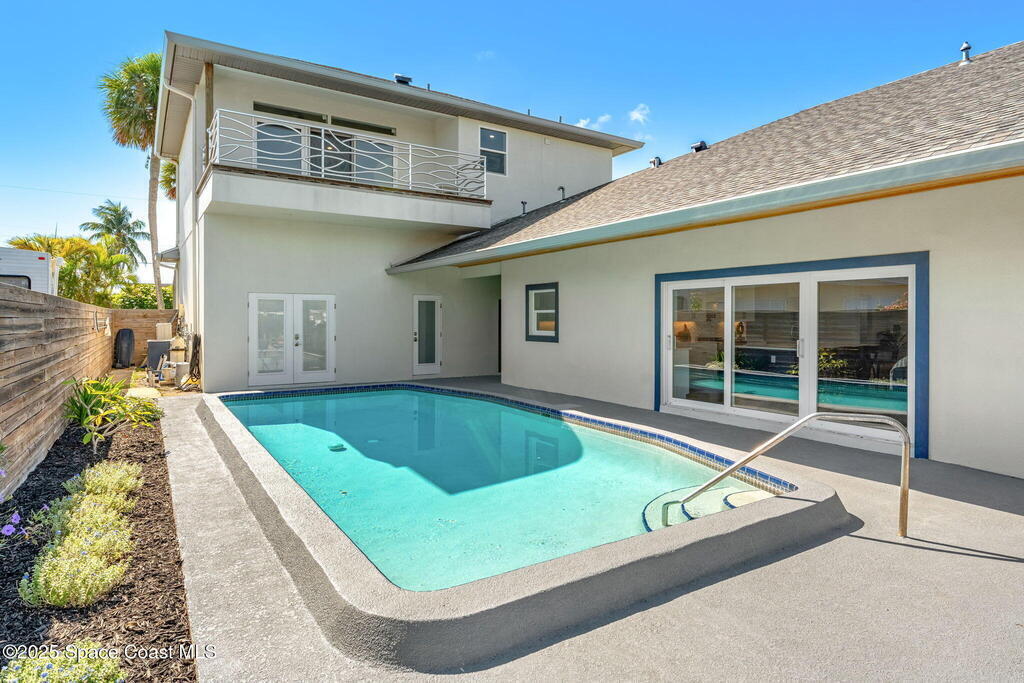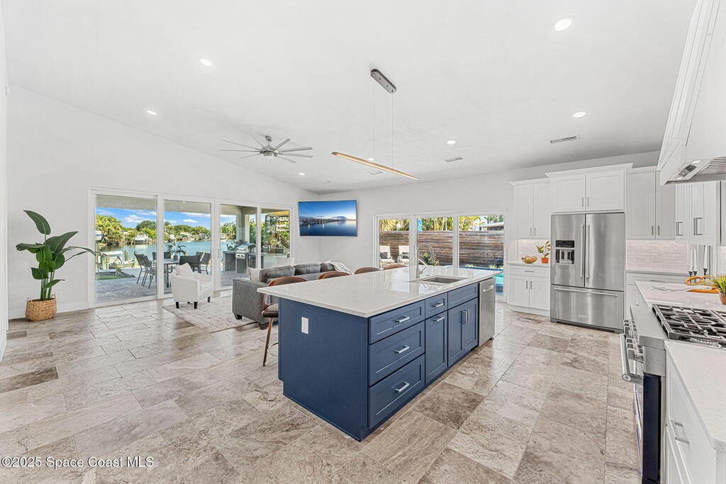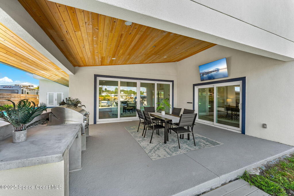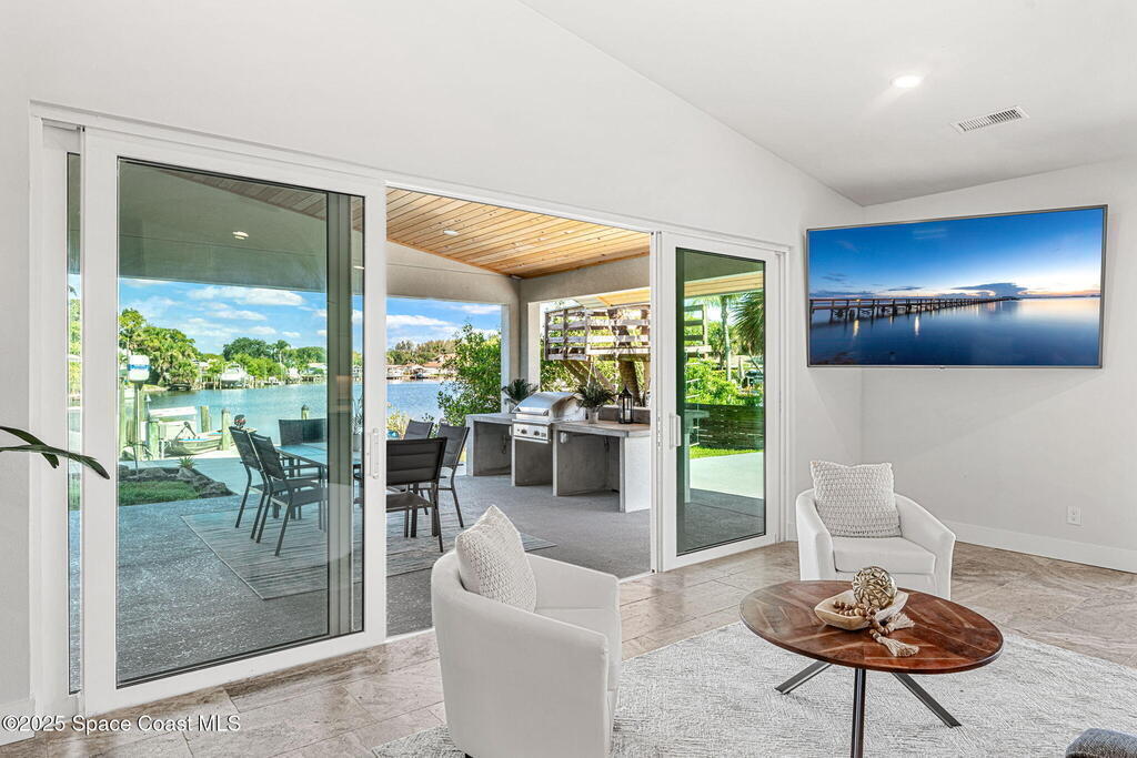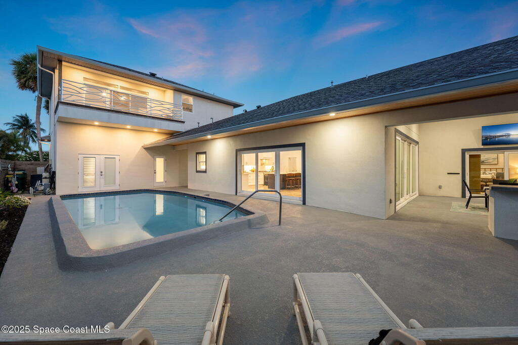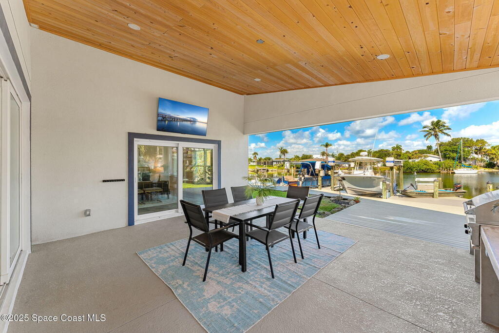 Experience waterfront living in this 2023 custom-built 5-bedroom, 5-bath home, located on a wide canal with stunning sunset views-- short walk to the beach, downtown Cocoa Beach, and a bike ride to the golf course. This luxury residence features a pool with full pool bath, and a 3-car garage with A/C, tall ceilings, and extra-high doors. The new dock includes water, electric, and two boat lifts. Inside, enjoy a chef's kitchen with 36'' gas range, pot filler, Bosch ultra-quiet dishwasher, tankless gas water heater, butler's pantry, and vaulted ceilings. The primary suite offers a spa-like bath with zero-entry shower, soaking tub, oversized closet. Additional highlights include illuminated mirrors in all baths, custom tongue-and-groove cypress ceilings, generator hookup, and a full solar system for $0 electric bills. A private 850 sq ft guest suite features its own kitchen, laundry, two queen beds, and a balcony--ideal for guests, income, or in-law living. Luxury, efficiency & location