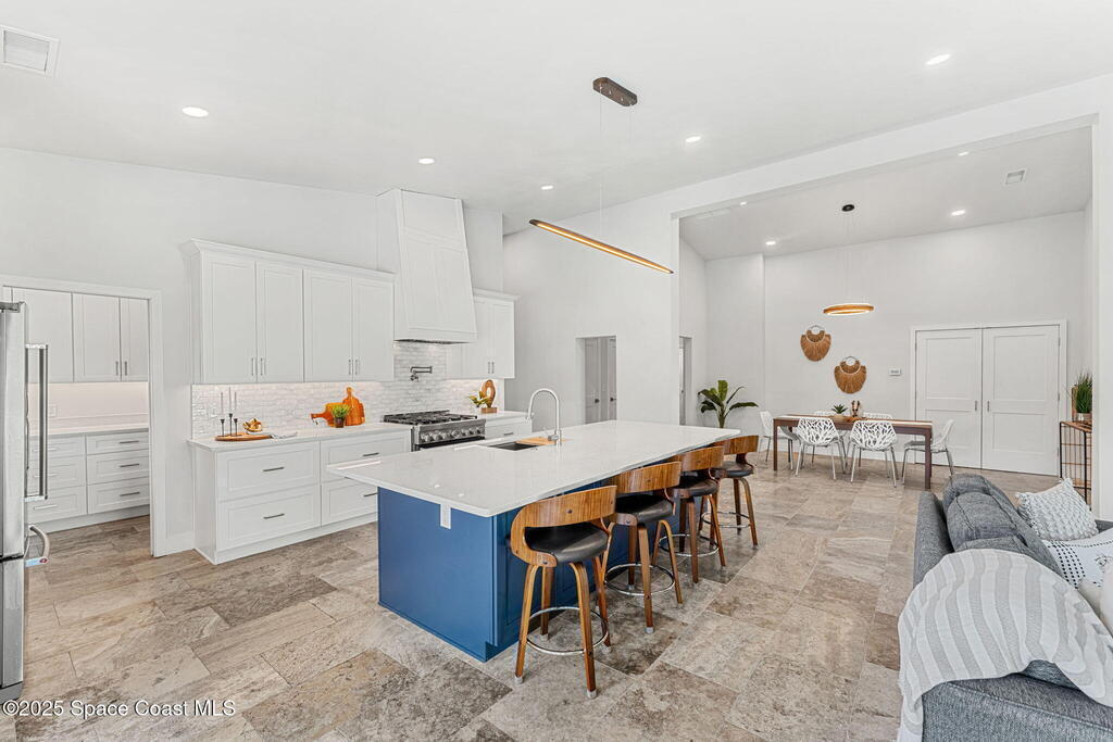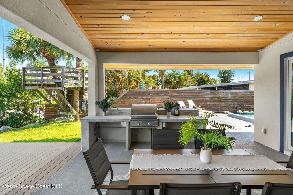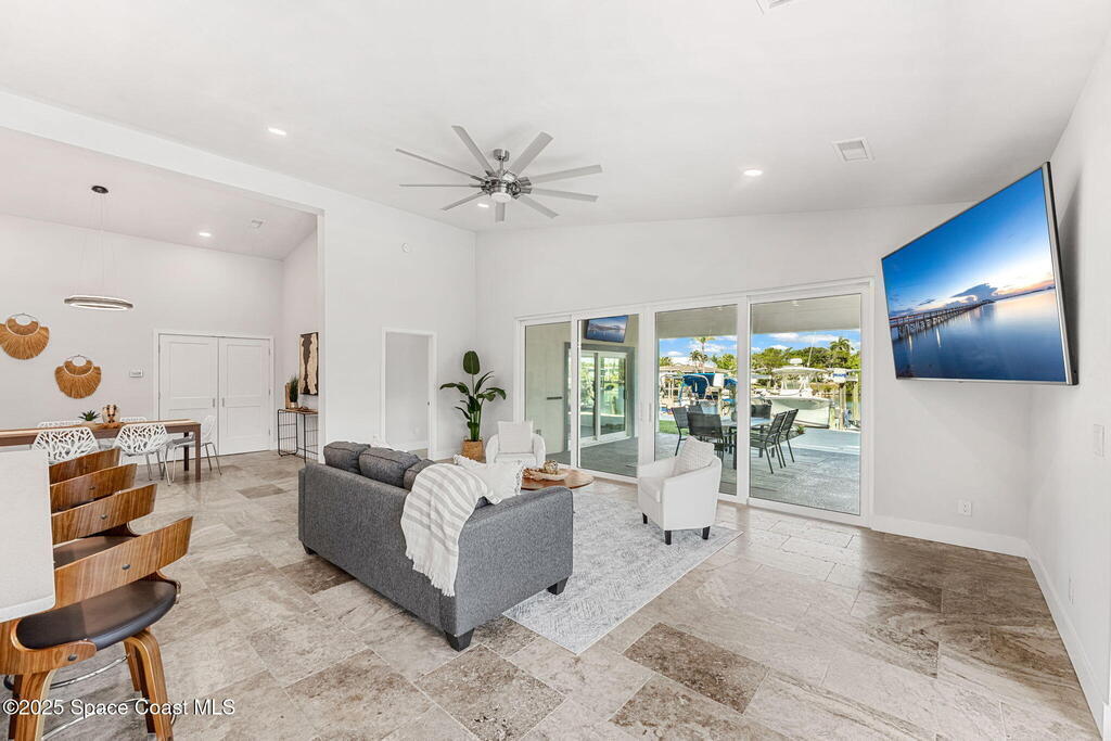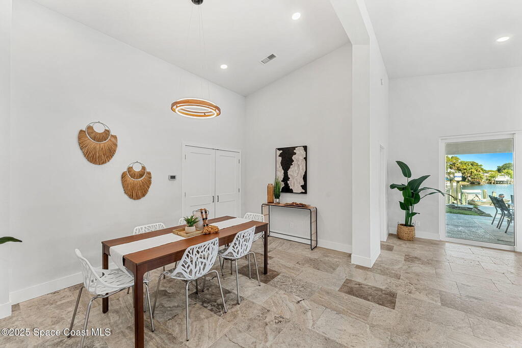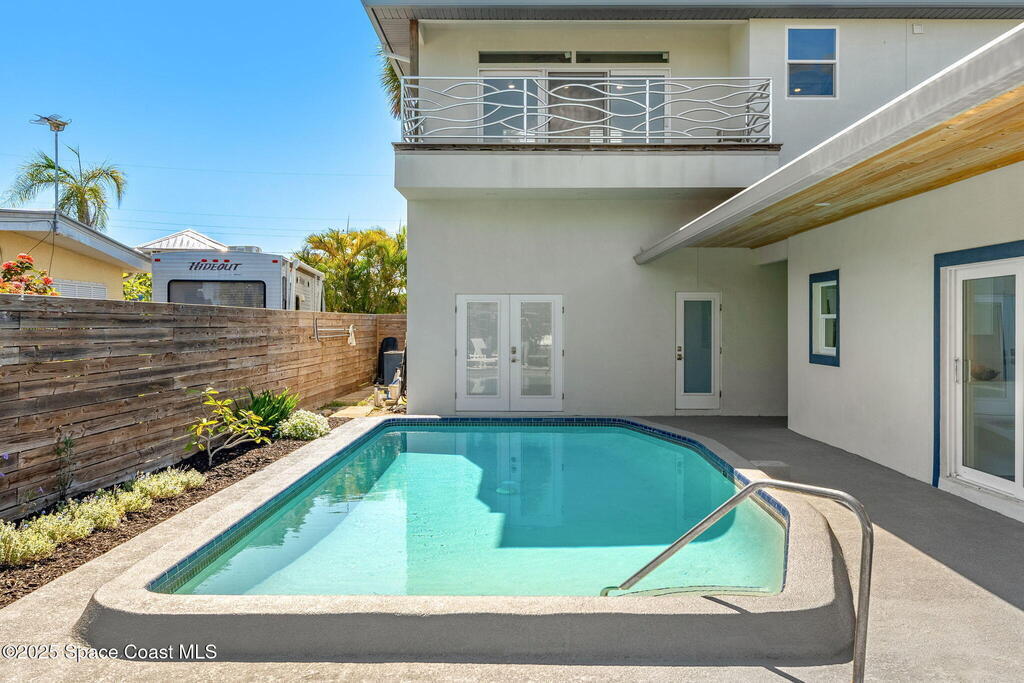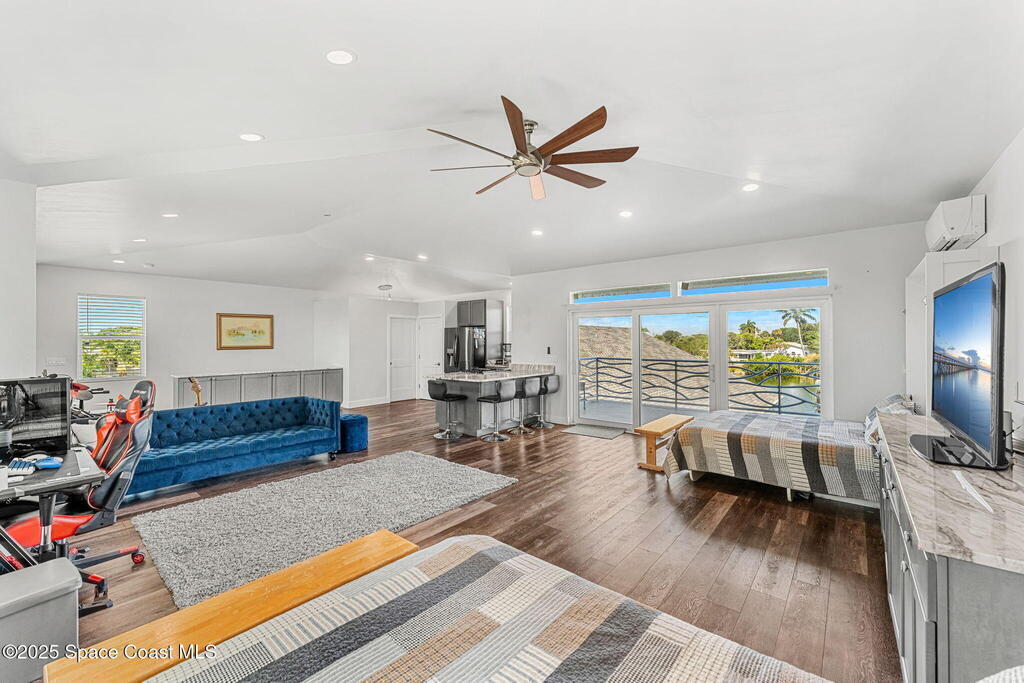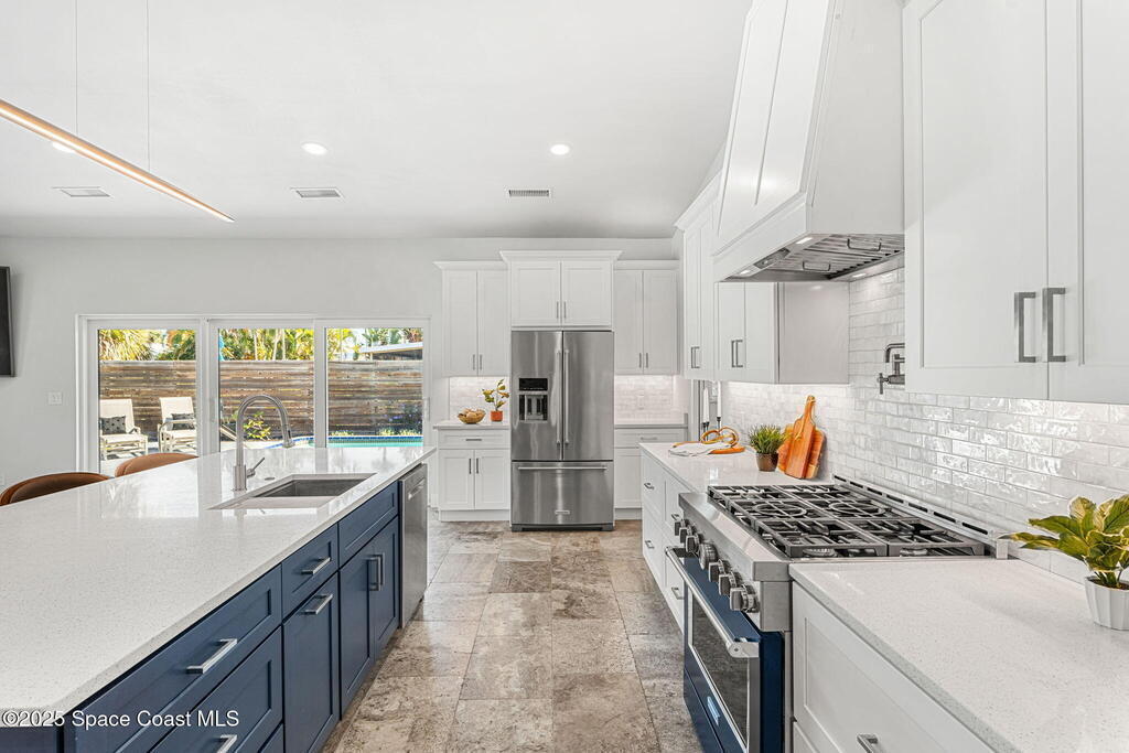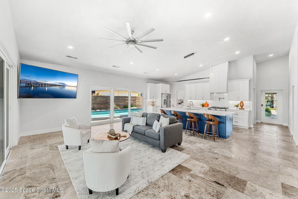 Experience waterfront living in this 2023 custom-built 5-bedroom, 5-bath home, located on a wide canal with stunning sunset views-- short walk to the beach, downtown Cocoa Beach, and a bike ride to the golf course. This luxury residence features a pool with full pool bath, and a 3-car garage with A/C, tall ceilings, and extra-high doors. The new dock includes water, electric, and two boat lifts. Inside, enjoy a chef's kitchen with 36'' gas range, pot filler, Bosch ultra-quiet dishwasher, tankless gas water heater, butler's pantry, and vaulted ceilings. The primary suite offers a spa-like bath with zero-entry shower, soaking tub, oversized closet. Additional highlights include illuminated mirrors in all baths, custom tongue-and-groove cypress ceilings, generator hookup, and a full solar system for $0 electric bills. A private 850 sq ft guest suite features its own kitchen, laundry, two queen beds, and a balcony--ideal for guests, income, or in-law living. Luxury, efficiency & location
