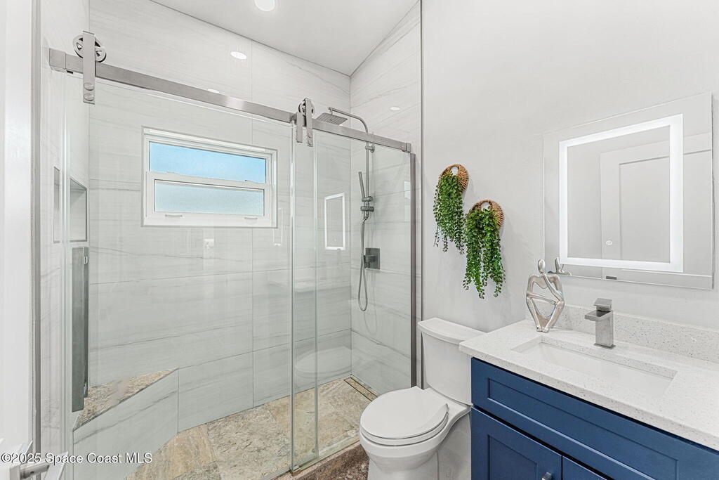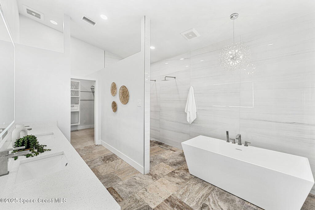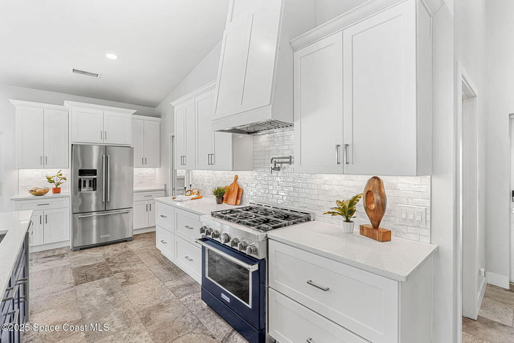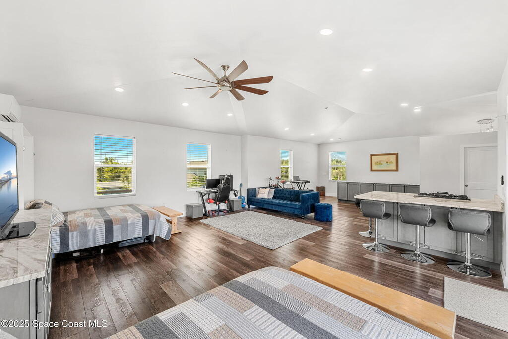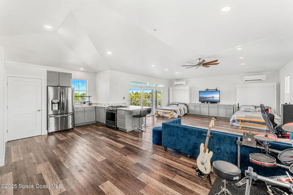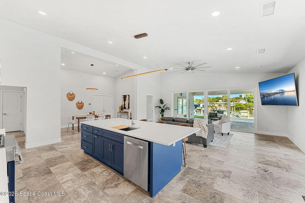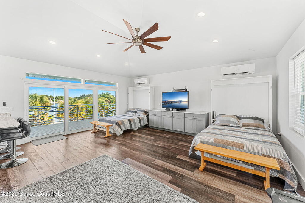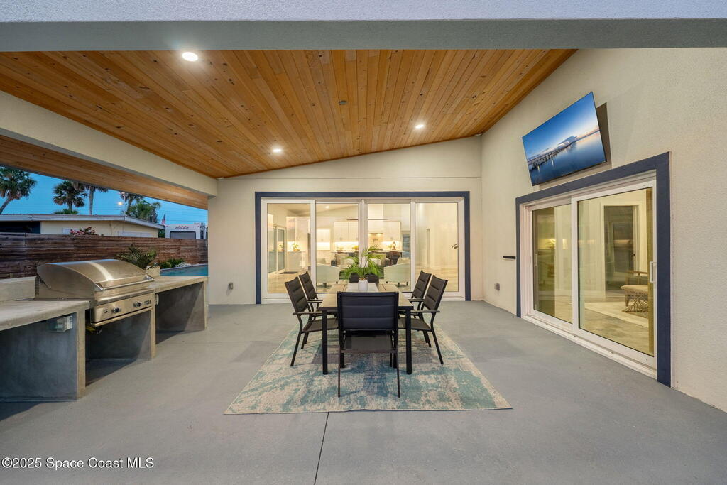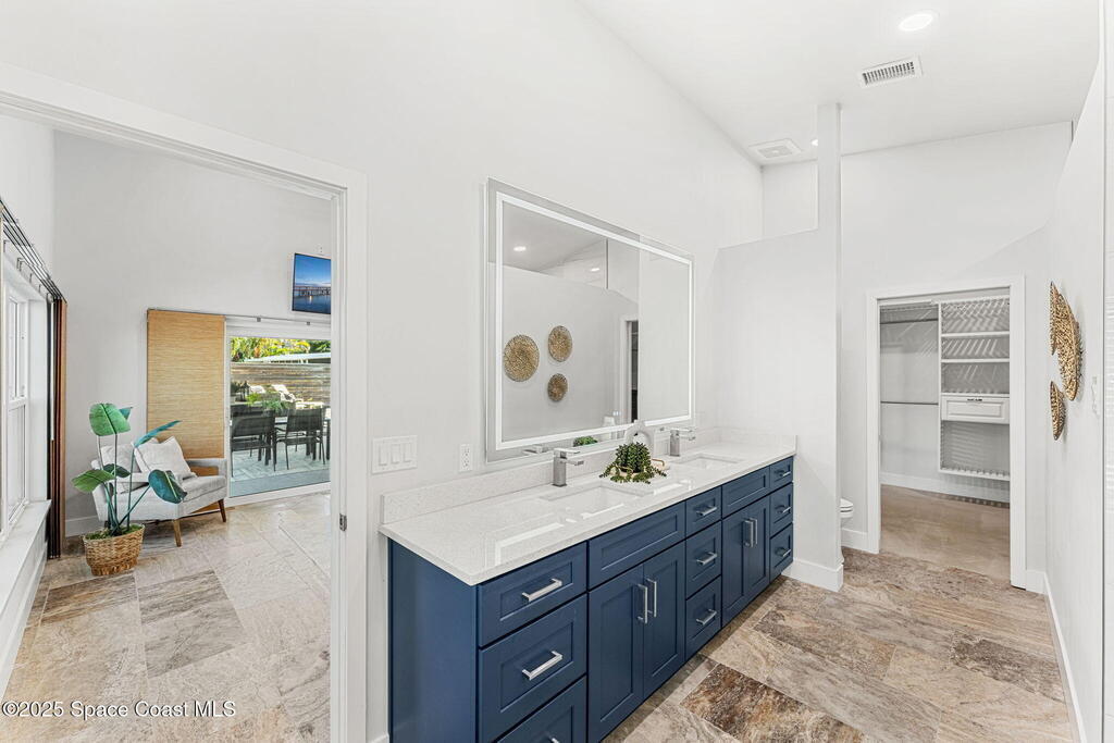 Experience waterfront living in this 2023 custom-built 5-bedroom, 5-bath home, located on a wide canal with stunning sunset views-- short walk to the beach, downtown Cocoa Beach, and a bike ride to the golf course. This luxury residence features a pool with full pool bath, and a 3-car garage with A/C, tall ceilings, and extra-high doors. The new dock includes water, electric, and two boat lifts. Inside, enjoy a chef's kitchen with 36'' gas range, pot filler, Bosch ultra-quiet dishwasher, tankless gas water heater, butler's pantry, and vaulted ceilings. The primary suite offers a spa-like bath with zero-entry shower, soaking tub, oversized closet. Additional highlights include illuminated mirrors in all baths, custom tongue-and-groove cypress ceilings, generator hookup, and a full solar system for $0 electric bills. A private 850 sq ft guest suite features its own kitchen, laundry, two queen beds, and a balcony--ideal for guests, income, or in-law living. Luxury, efficiency & location