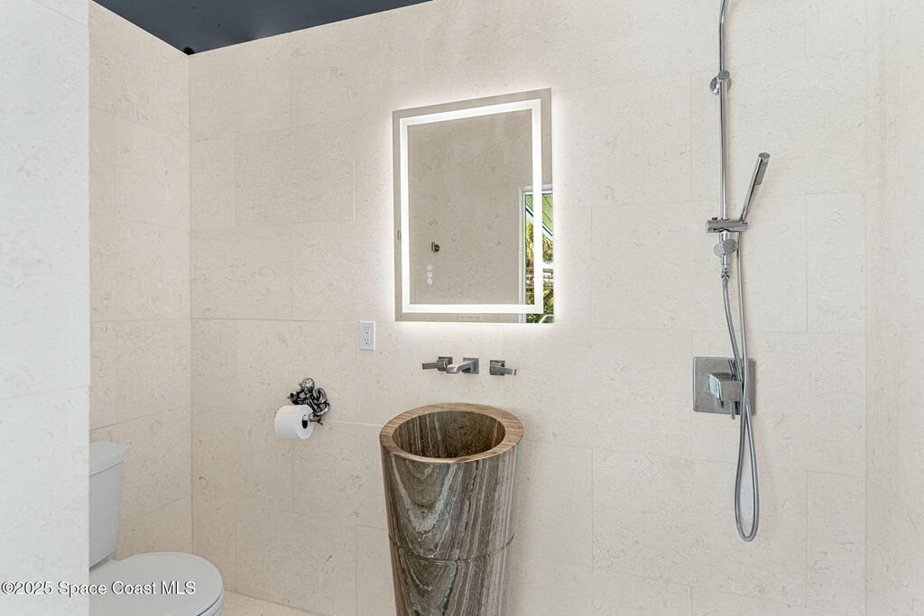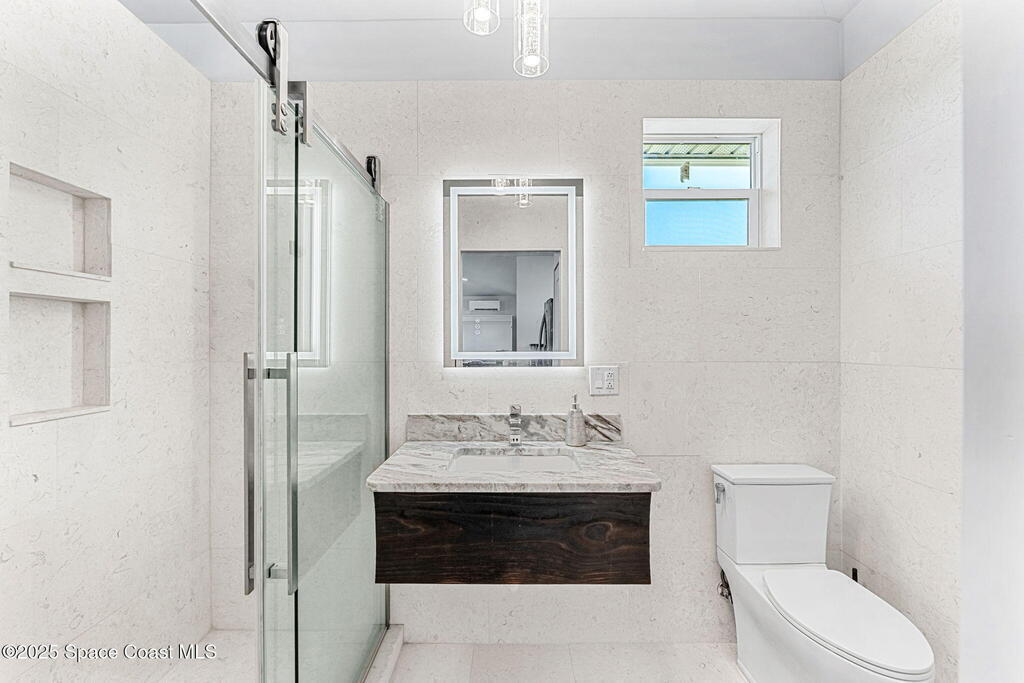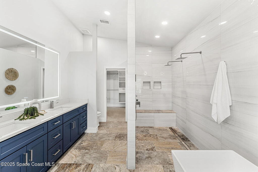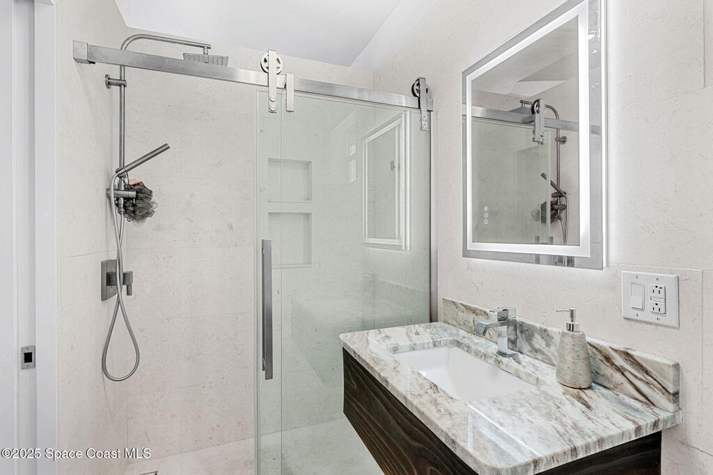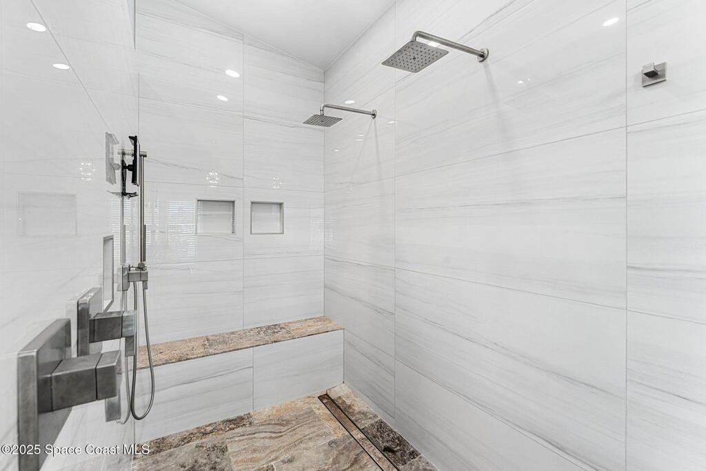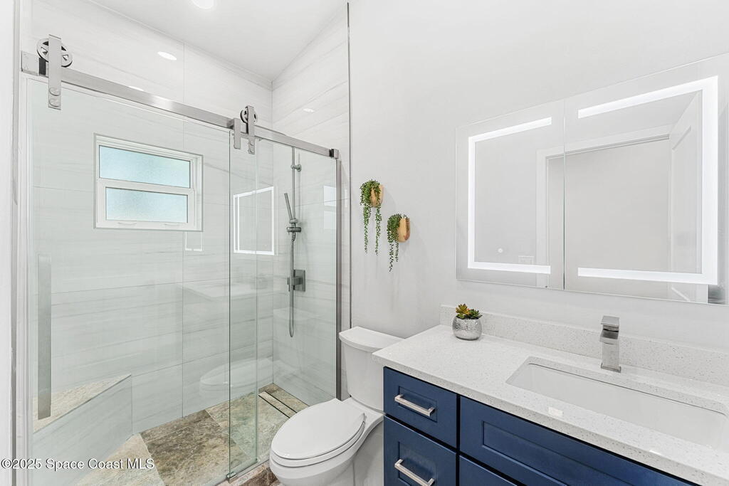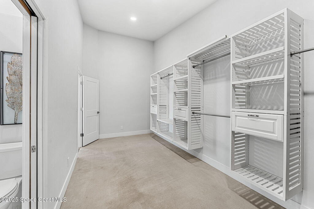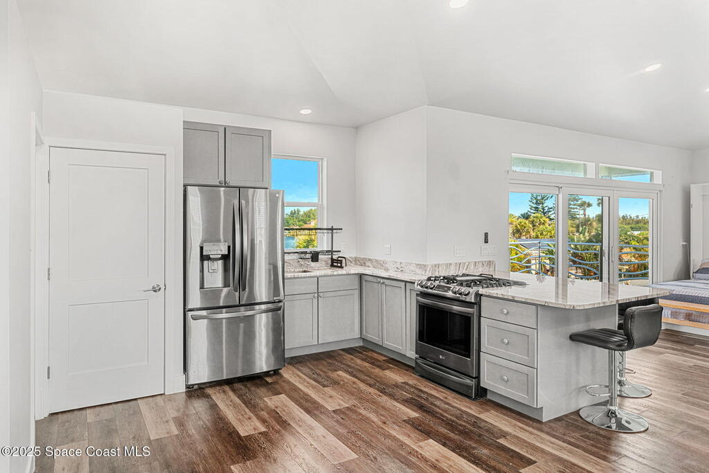 Experience waterfront living in this 2023 custom-built 5-bedroom, 5-bath home, located on a wide canal with stunning sunset views-- short walk to the beach, downtown Cocoa Beach, and a bike ride to the golf course. This luxury residence features a pool with full pool bath, and a 3-car garage with A/C, tall ceilings, and extra-high doors. The new dock includes water, electric, and two boat lifts. Inside, enjoy a chef's kitchen with 36'' gas range, pot filler, Bosch ultra-quiet dishwasher, tankless gas water heater, butler's pantry, and vaulted ceilings. The primary suite offers a spa-like bath with zero-entry shower, soaking tub, oversized closet. Additional highlights include illuminated mirrors in all baths, custom tongue-and-groove cypress ceilings, generator hookup, and a full solar system for $0 electric bills. A private 850 sq ft guest suite features its own kitchen, laundry, two queen beds, and a balcony--ideal for guests, income, or in-law living. Luxury, efficiency & location