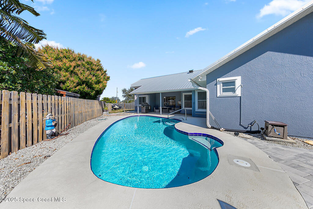 Check out this Canal Front home on this quiet street featuring 4 bedrooms, 3 full baths, heated pool & fenced yard. As you enter the double doors the Living room boasts Cathedral Ceilings where the split plan has 3 bedrooms (one of them a suite that leads out to the pool deck) and 2 baths on one side and the master on the other. This home has been well cared for and maintained with A/C just 2 years old, New Hot Water Heater, Paver Driveway, New Metal Roof, New Exterior Paint, Hurricane Shutters, recently renovated pool. This wide corner lot offers access to store an RV, Trailer etc behind the double gates. You'll enjoy the peaceful back yard as the pool & back deck are perfectly positioned with an elevated long view of the canal. The low maintenance Coquina Rock Seawall & 2 floating docks (one for a 16' boat & 1 jet ski) await your new water toys where you can explore the Indian River. Don't let this opportunity to live beachside on the water pass you by.
