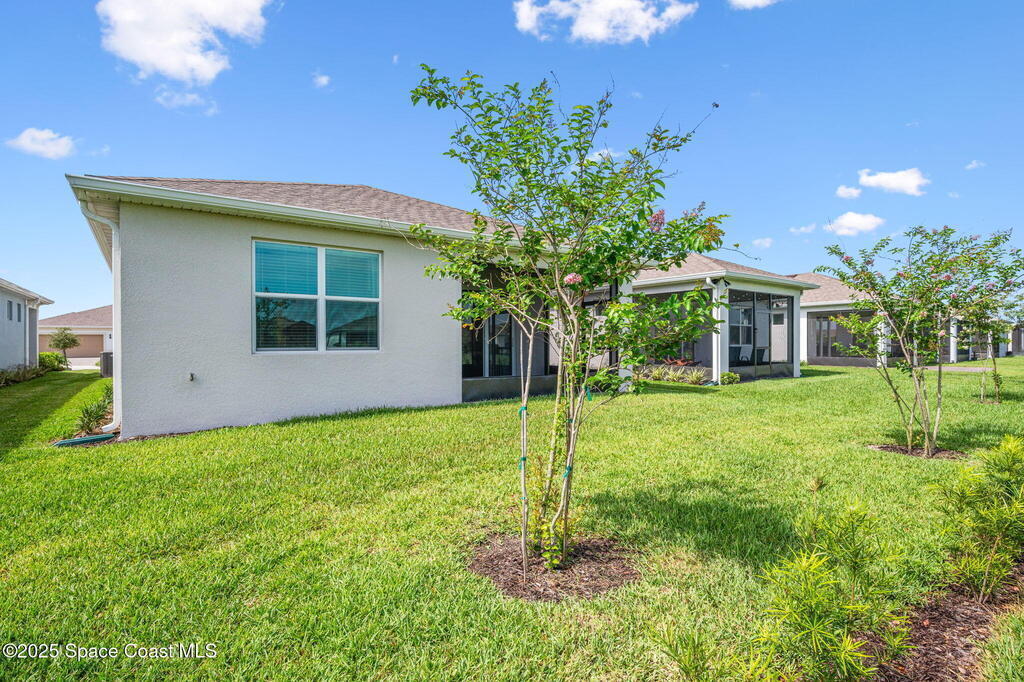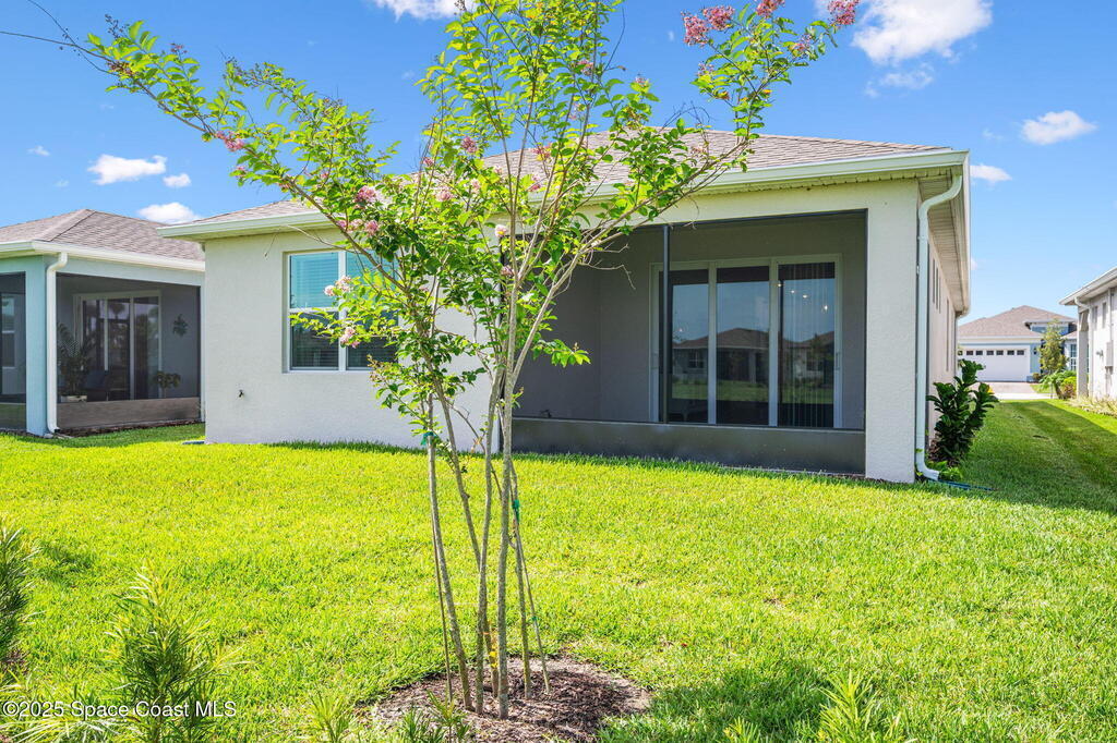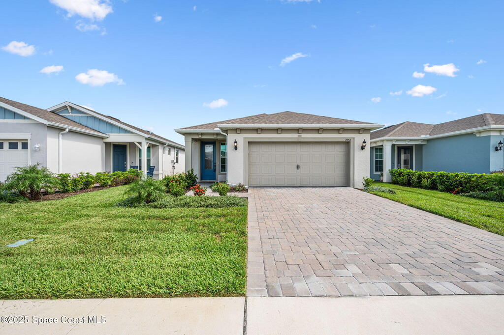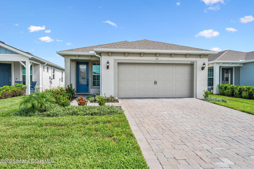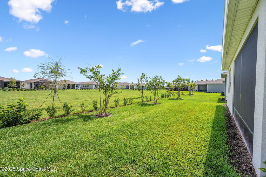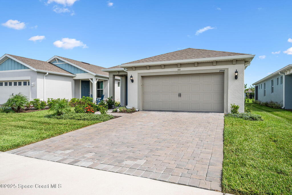 HUGE price Reduction! Stunning 2023 built property in the 55+ premier gated community of Del Webb at Viera. This property features a gourmet kitchen with white 42'' soft-close Aristrokraft cabinets, gas cooktop, stainless appliances, quartz island seating, pantry. The spacious primary suite features a walk-in closet, large walk-in shower, and double sinks. Walk-in shower at secondary bath. Triple sliding doors open to a screened-in covered lanai with beautiful garden views. IMPACT WINDOWS, attic storage w/pull down stairs, glass insert at front door, utility sink in garage, gutters, and paver driveway. Enjoy great lifestyle here at Del Webb as your all-inclusive landscaping & irrigation are included in your monthly HOA fees. There is a Lifestyle House for use as temporary Amenity Center. Also your monthly fee includes complimentary unlimited ''family membership'' at Duran Golf Club on the Par Three Course to each adult resident member of the lot & full time lifestyle coordinato