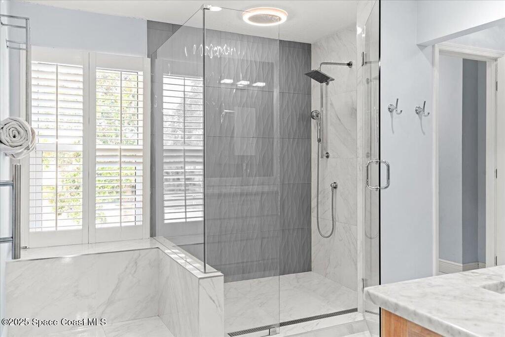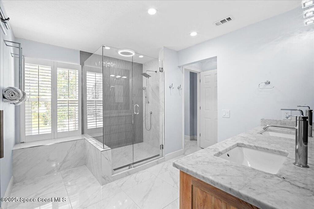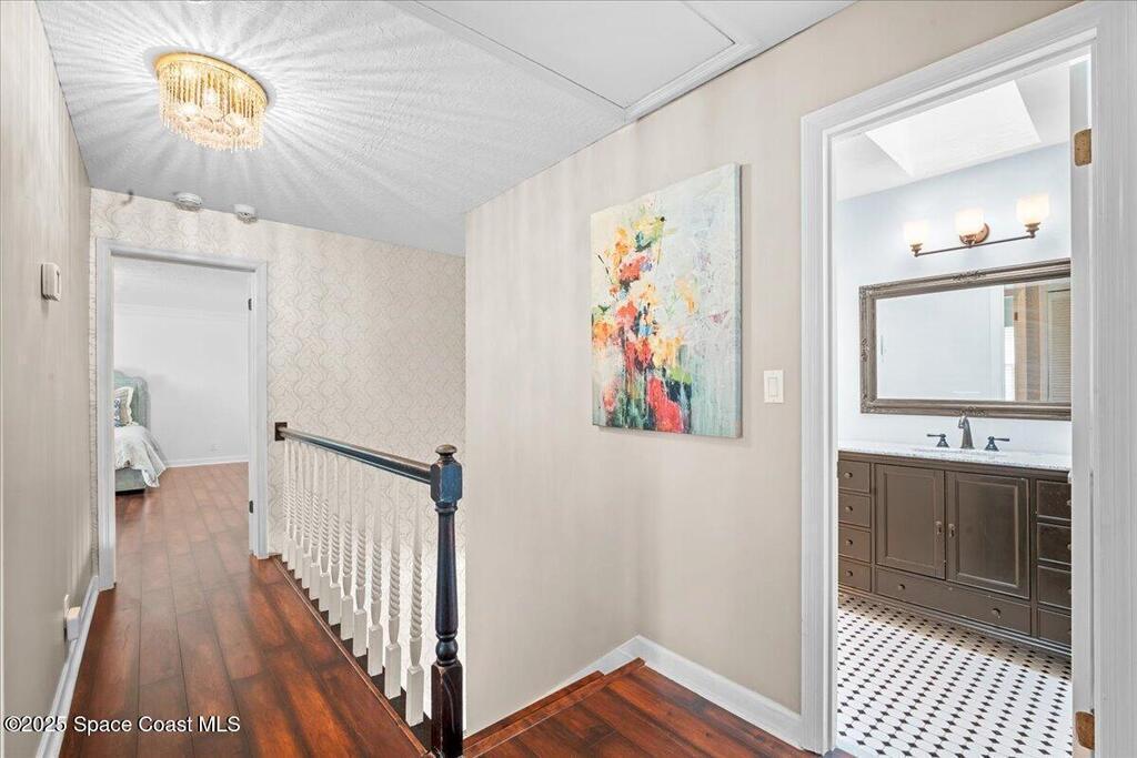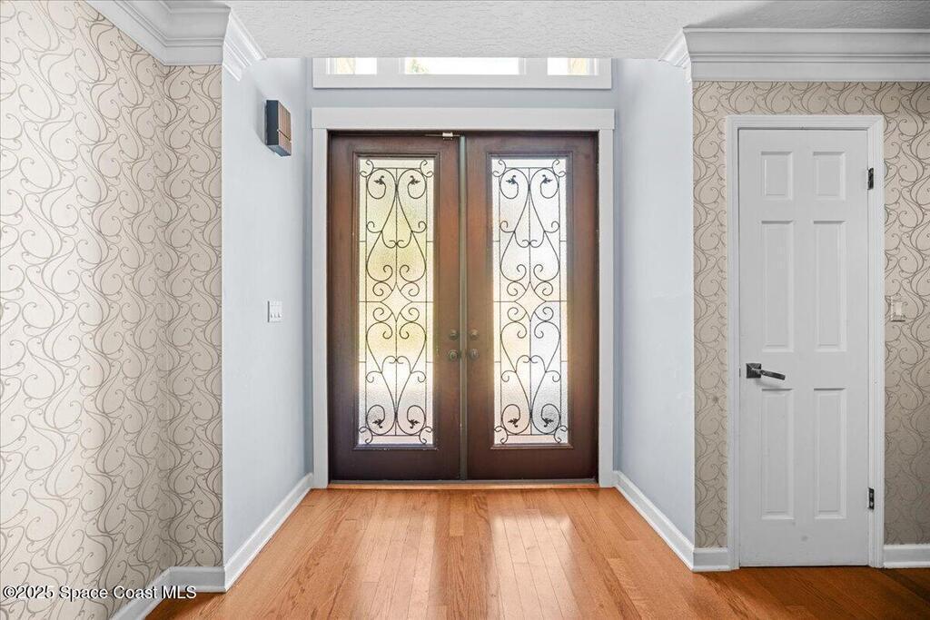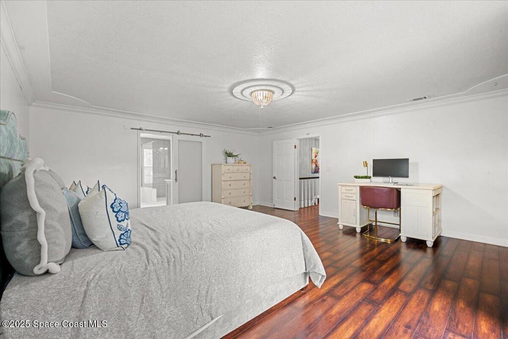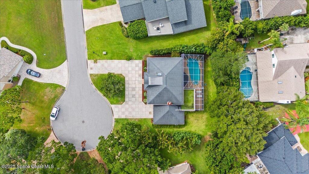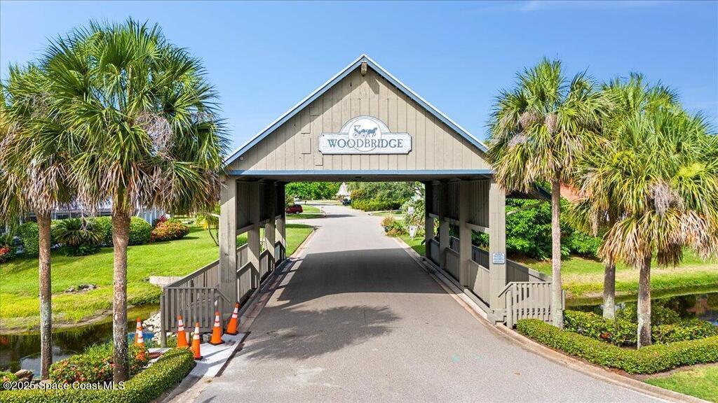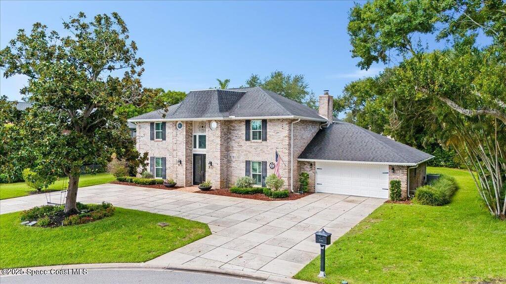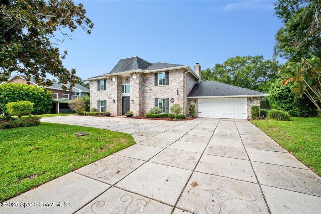 Welcome to Woodbridge, one of Suntree's most exclusive communities, known for its charming covered bridge entrance and custom estates. This unique 2-story French Provincial brick home features a circular drive with large concrete pavers and a mature magnolia, leading to an oversized 2-car garage with golf cart space. Inside, 8' French doors open to hardwood floors, travertine tile, and a chef's kitchen with solid wood cabinetry, quartz counters, induction cooktop, double ovens, and center island. Entertaining is easy with a 200-bottle wine fridge and built-in kegerator. Upstairs, the primary suite offers 4 custom closets, a beautifully updated bath with walk-in shower, dual vanities, and private turf-covered balcony overlooking the heated pool, spa, and waterfall. Enjoy the spacious lanai with covered seating and grill area. Roof 2015, HVACs 2020/2010, WH 2016, impact windows 2018, foam attic insulation, hurricane shutters, and Vivint security system.