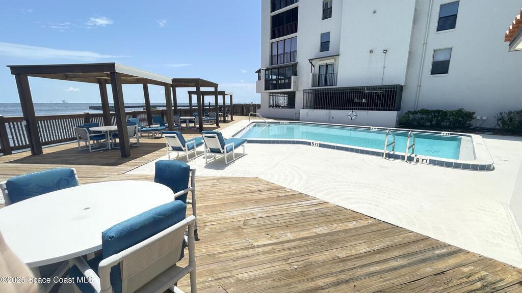 Start your new waterfront condo living at Kennedy Point! 4th floor unit provide stellar views of the Indian River and the Kennedy Space Center. Watch dolphins swim by everyday.Well maintained unit with spacious living room and generous sized master bedroom.Low HOA fee includes secured entry and parking, cable, internet, water, sewer, and heated pool in the winter. State mandated Milestone Study completed with no deficiencies!