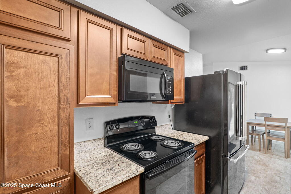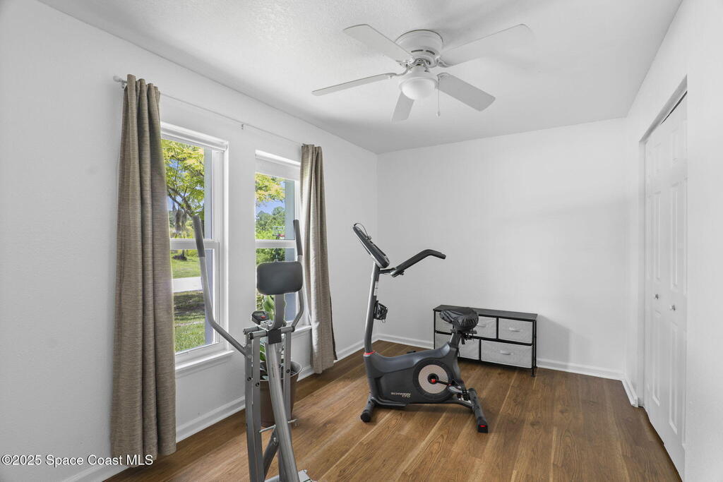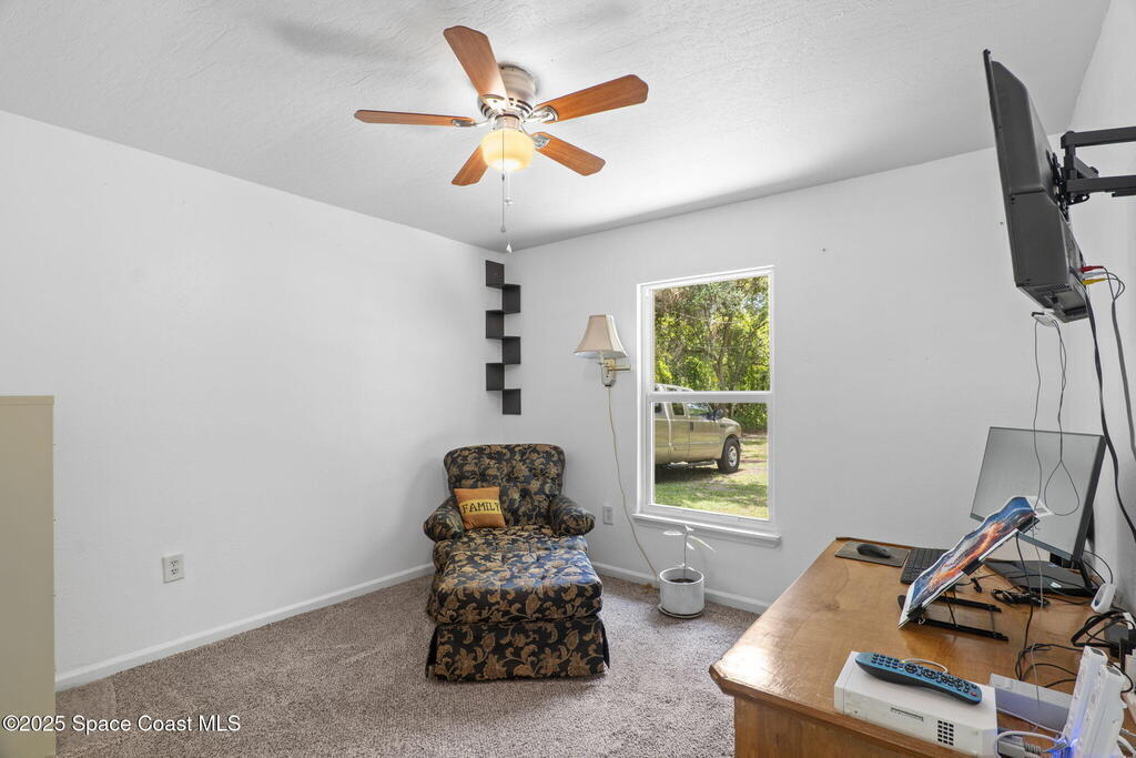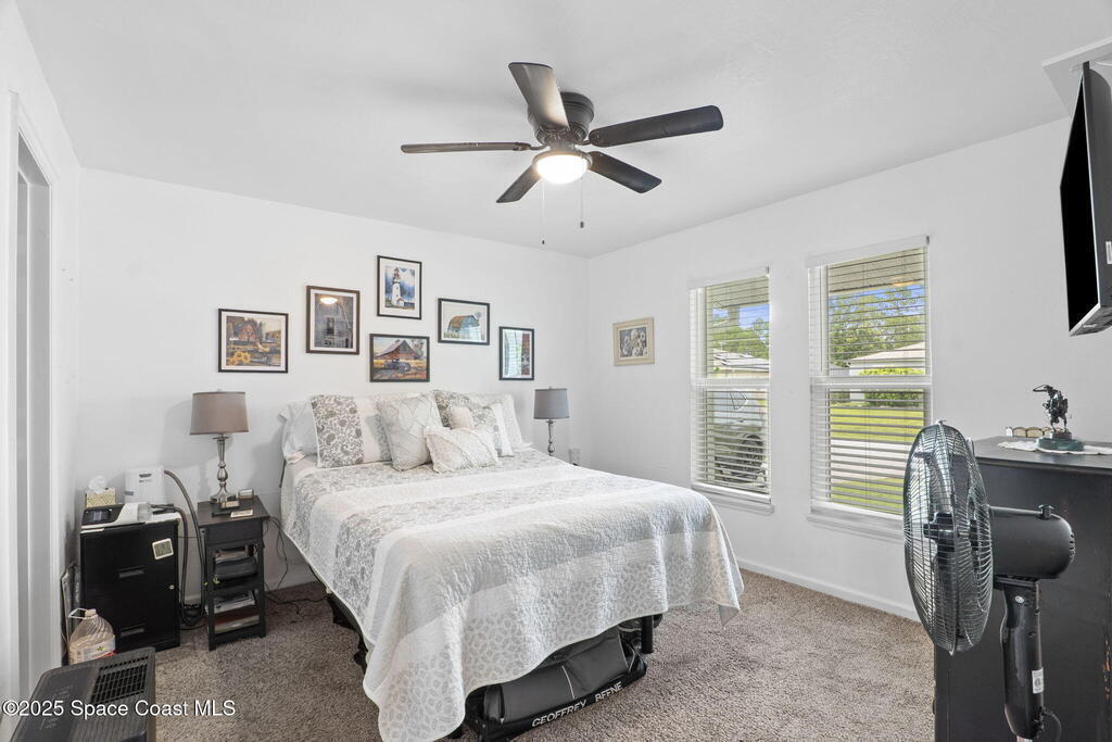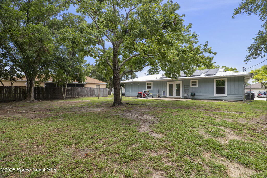 Wanting to live in the Space Coast? This MOVE IN READY home offers new windows in 2023 Updated kitchen features solid wood cabinets, granite countertops and newer appliances. The main areas have ceramic tile floors while the bedrooms have either carpet or luxury vinyl plank flooring. The glass French doors open to the patio while allowing plenty of light to fill the dining area. The metal roof was installed in 2016 and a new HVAC in 2017. The backyard is very roomy with mature shade trees. Solar panels installed in 2023 (monthly payment is $164 a month). Electric bills run $40-$80 per month.