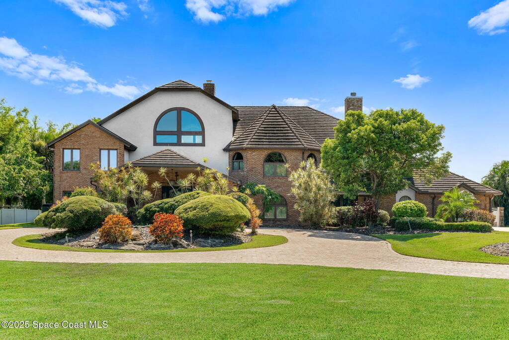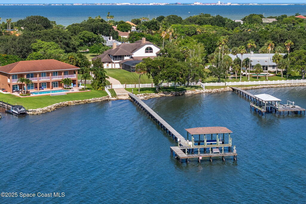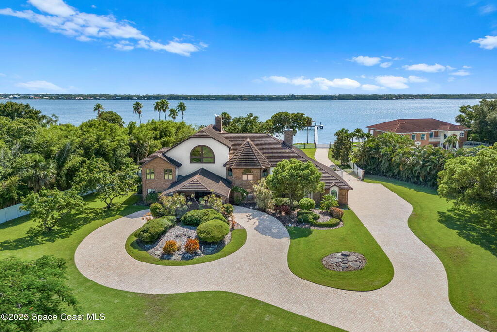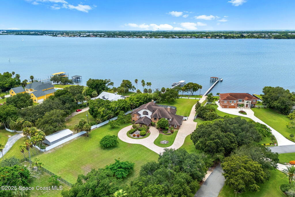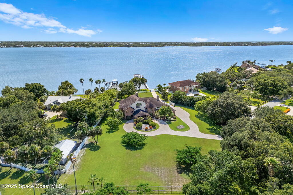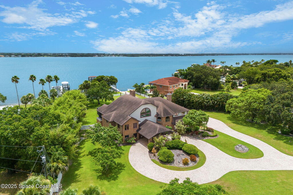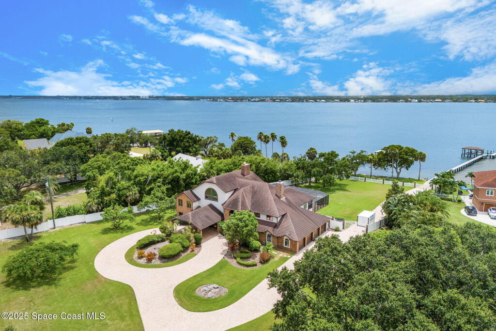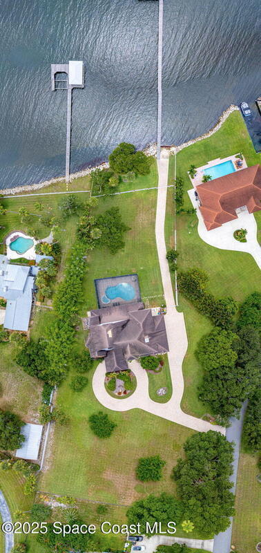 This extraordinary 6-bedroom, 5.5-bath riverfront estate is a private retreat on over 2 lush acres in the heart of Merritt Island. With 105 feet of shoreline and more than 6,600 sq. ft. of interior space, this property was designed for entertaining, multigenerational living, and serene waterfront enjoyment.A rare private boat ramp, 300-foot dock with double slips, 10,000-lb lift, and direct access to the Indian River make this a true boater's dream. Watch rocket launches from your own backyard or unwind beside the deep, heated pool and spa. The outdoor kitchen includes a grill, smoker, fridge, and covered lounge space ideal for entertaining. The backyard feels incredibly private, framed by mature landscaping that creates a peaceful sanctuary.Inside, a dramatic two-story foyer opens to refined living areas with wood and tile floors, two fireplaces, and a wet bar.
