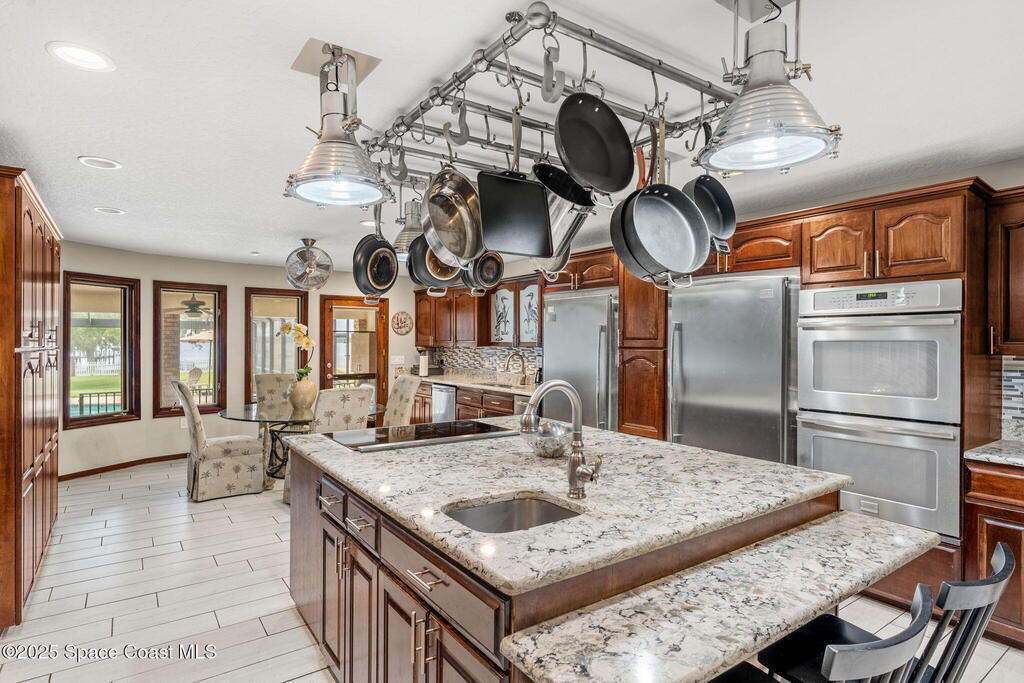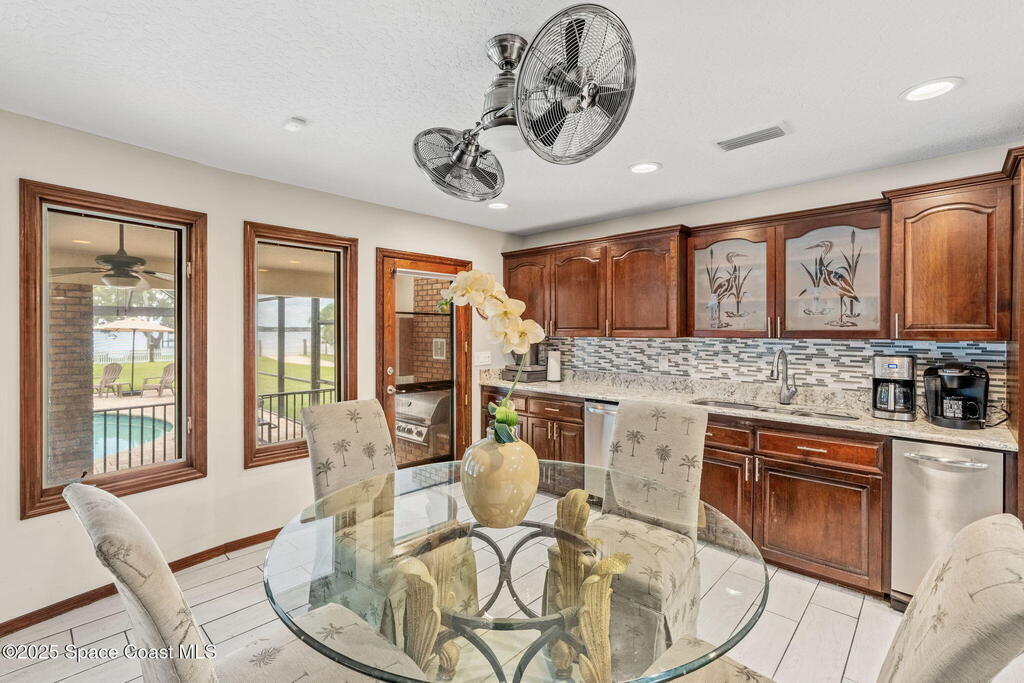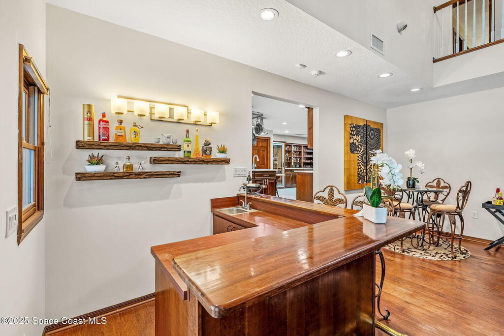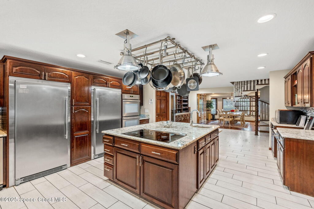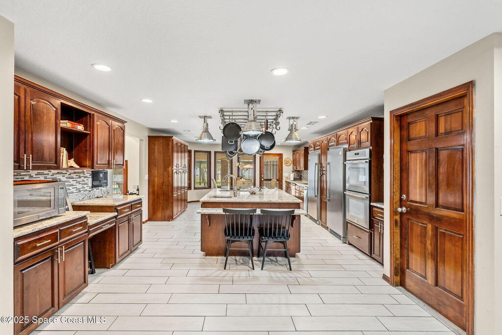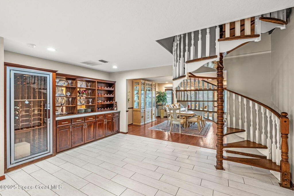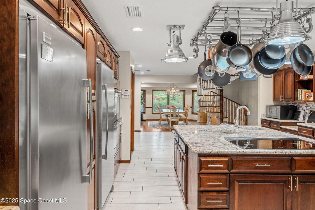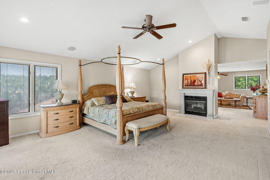 This extraordinary 6-bedroom, 5.5-bath riverfront estate is a private retreat on over 2 lush acres in the heart of Merritt Island. With 105 feet of shoreline and more than 6,600 sq. ft. of interior space, this property was designed for entertaining, multigenerational living, and serene waterfront enjoyment.A rare private boat ramp, 300-foot dock with double slips, 10,000-lb lift, and direct access to the Indian River make this a true boater's dream. Watch rocket launches from your own backyard or unwind beside the deep, heated pool and spa. The outdoor kitchen includes a grill, smoker, fridge, and covered lounge space ideal for entertaining. The backyard feels incredibly private, framed by mature landscaping that creates a peaceful sanctuary.Inside, a dramatic two-story foyer opens to refined living areas with wood and tile floors, two fireplaces, and a wet bar.