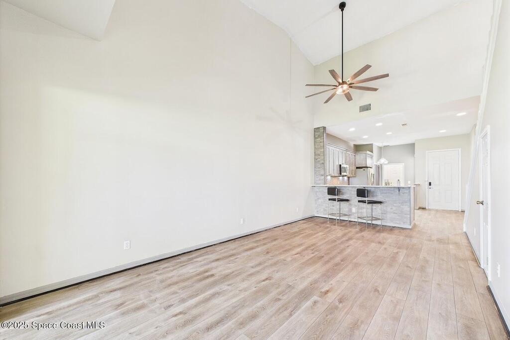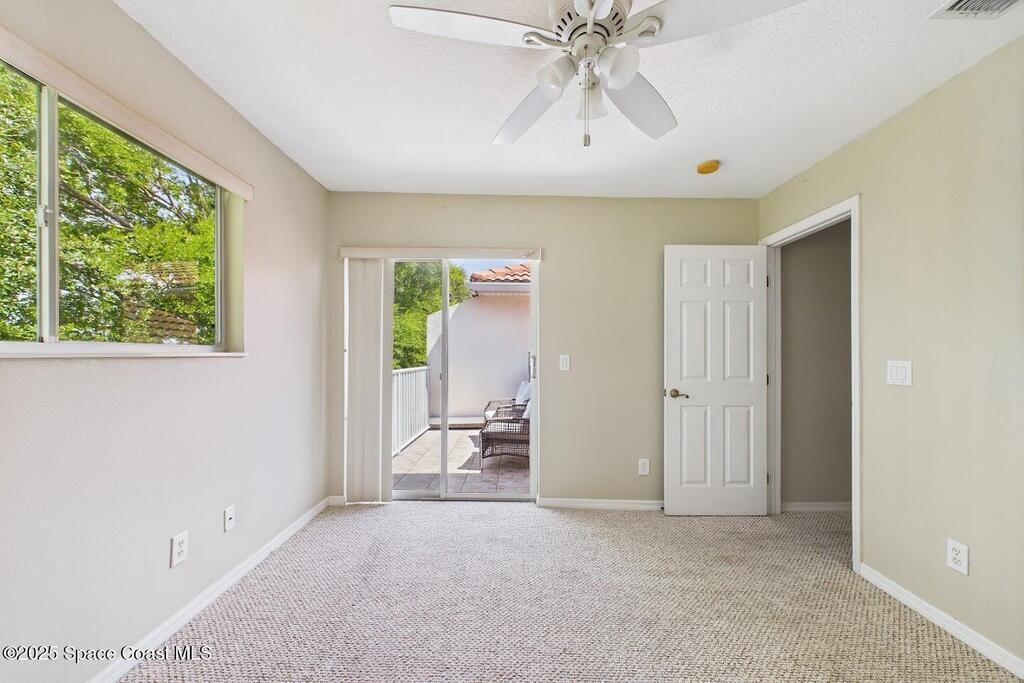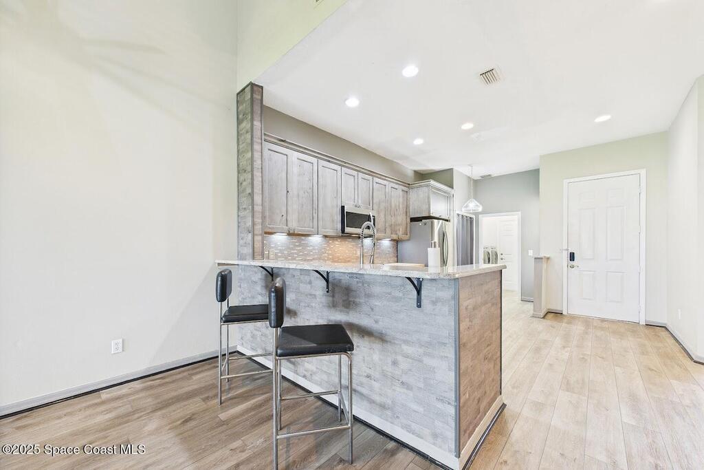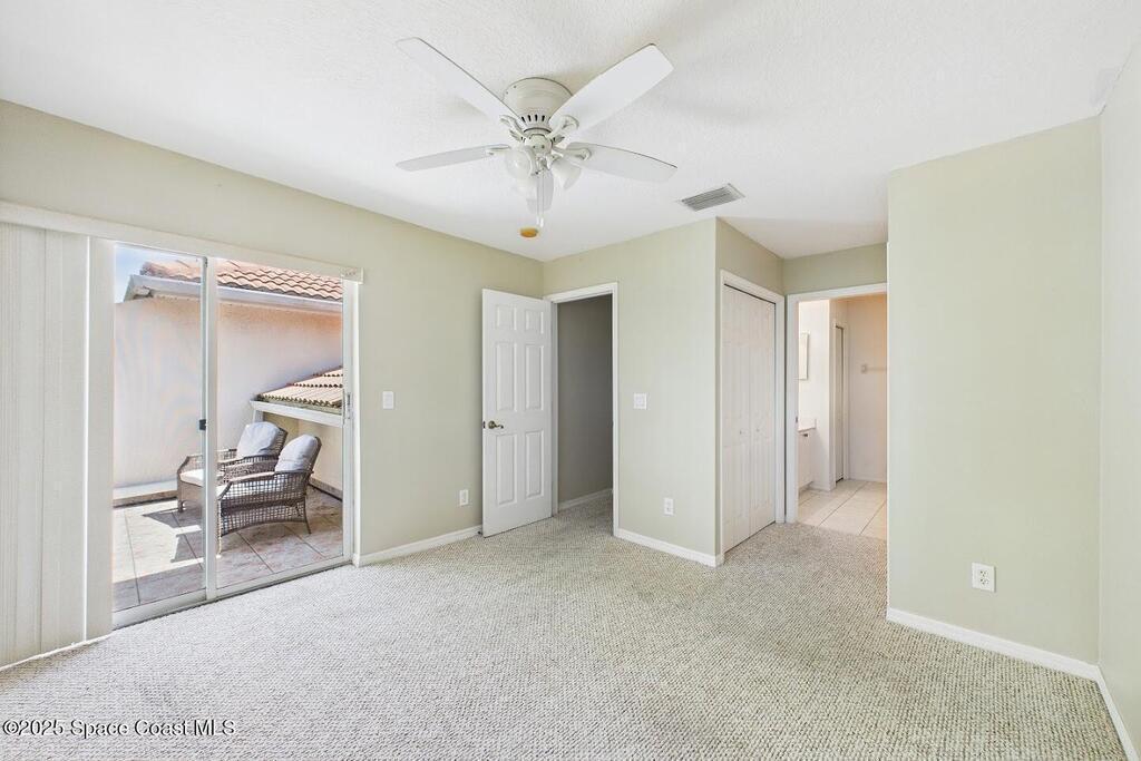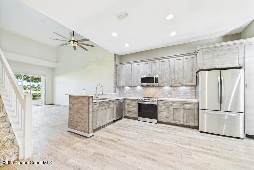 Have you been dreaming of an affordable, updated home on the Cocoa Beach Golf Course? Look no further! This spacious 3 bedroom, 3 FULL BATH, 2 CAR GARAGE with golf course views has everything you want! The renovated kitchen features stainless steel appliances, granite counter tops and new cabinetry. A butcher block counter provides a warm contrast. Beautiful vinyl plank flooring flows throughout the kitchen and living area. The sizable primary suite creates the perfect everyday retreat with dual sinks, shower and separate tub. Plenty of room to relax after a day of golfing. There is a large 3rd bedroom upstairs with a full bath and a secluded balcony. Perfect for enjoying a cocktail and watching sunsets. You will appreciate the ample storage and closet space. This quiet 8 unit complex is minutes from downtown Cocoa Beach, schools and the Country Club.
