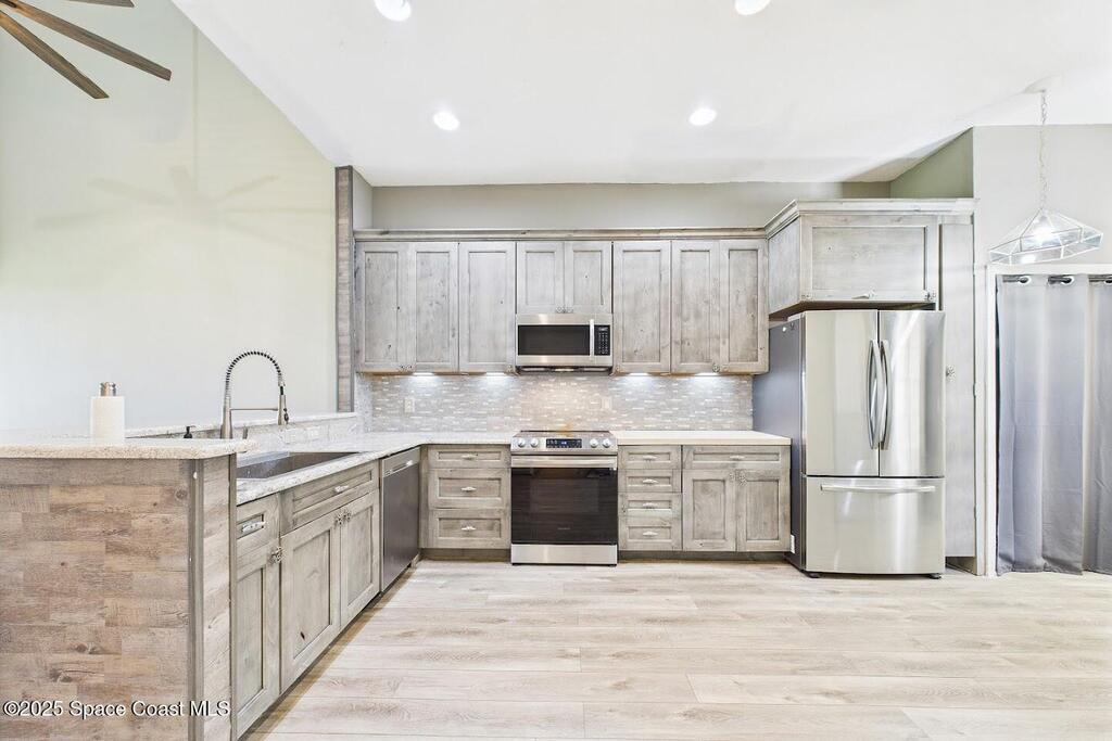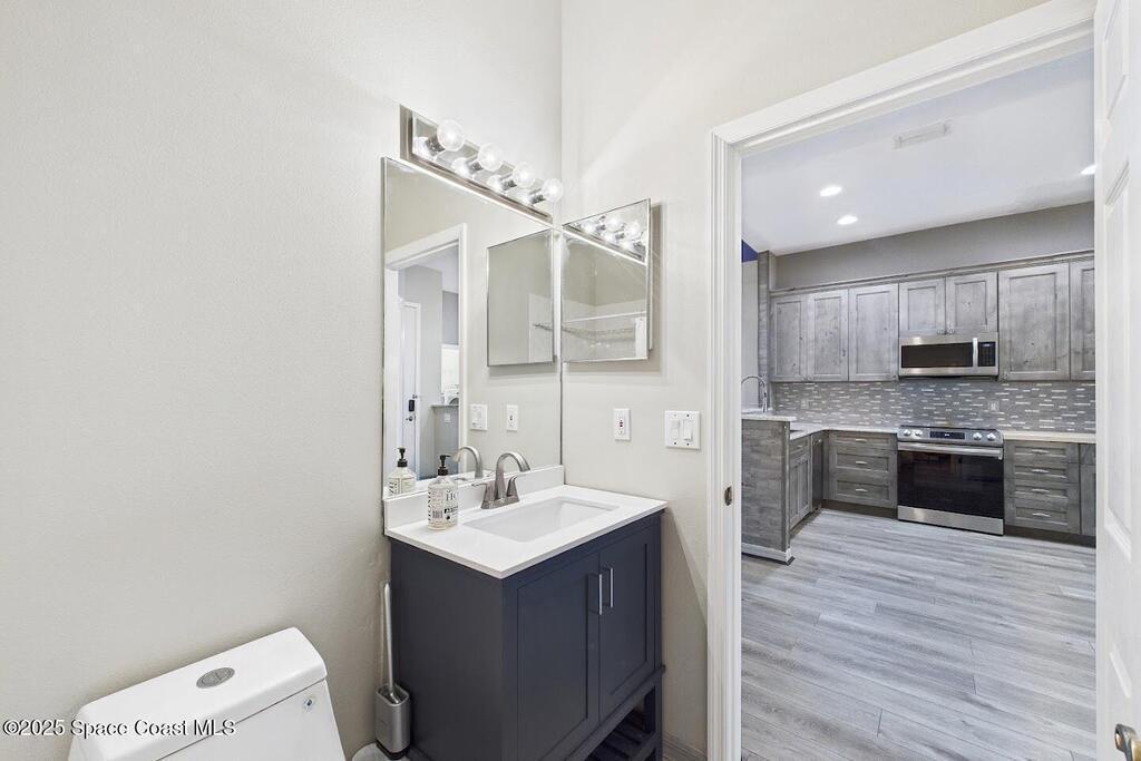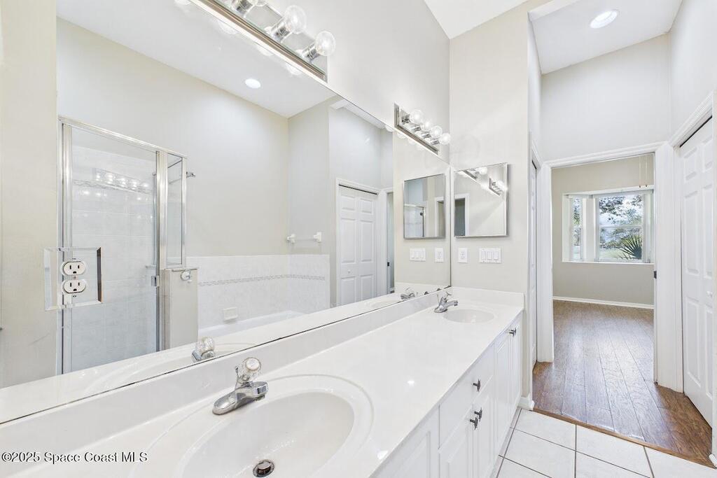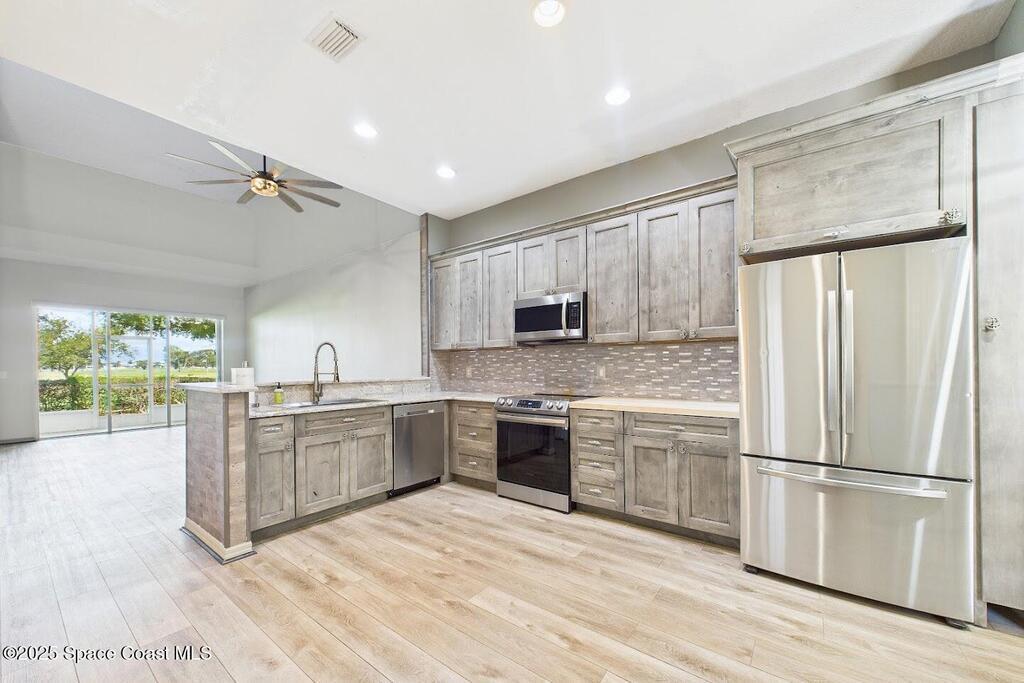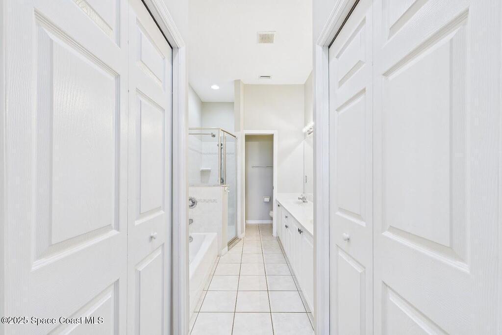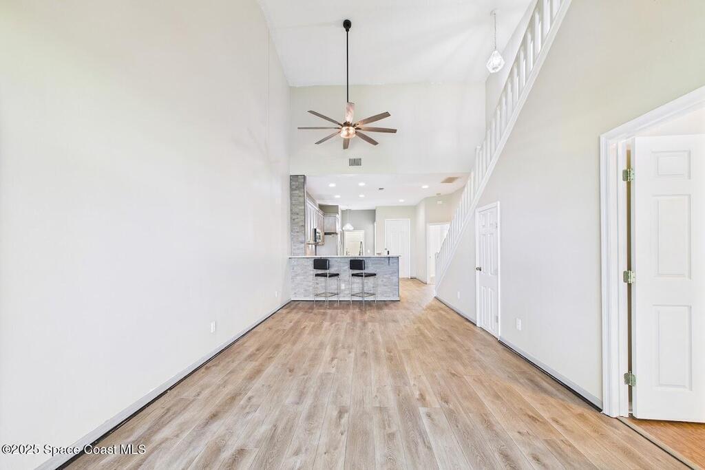 Have you been dreaming of an affordable, updated home on the Cocoa Beach Golf Course? Look no further! This spacious 3 bedroom, 3 FULL BATH, 2 CAR GARAGE with golf course views has everything you want! The renovated kitchen features stainless steel appliances, granite counter tops and new cabinetry. A butcher block counter provides a warm contrast. Beautiful vinyl plank flooring flows throughout the kitchen and living area. The sizable primary suite creates the perfect everyday retreat with dual sinks, shower and separate tub. Plenty of room to relax after a day of golfing. There is a large 3rd bedroom upstairs with a full bath and a secluded balcony. Perfect for enjoying a cocktail and watching sunsets. You will appreciate the ample storage and closet space. This quiet 8 unit complex is minutes from downtown Cocoa Beach, schools and the Country Club.