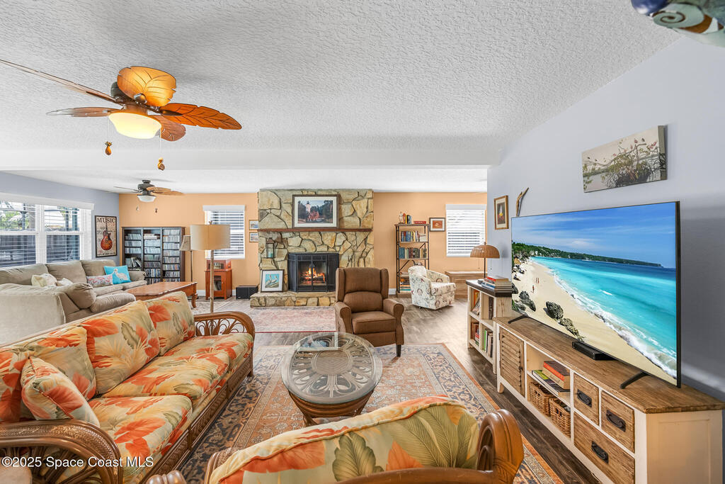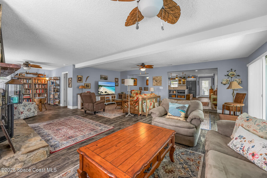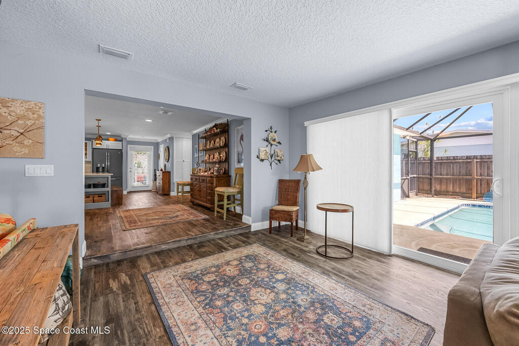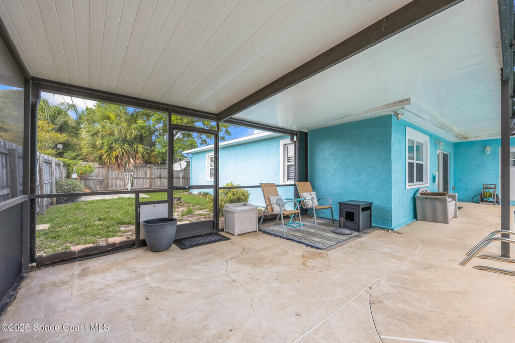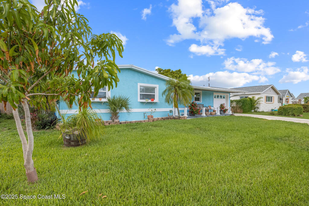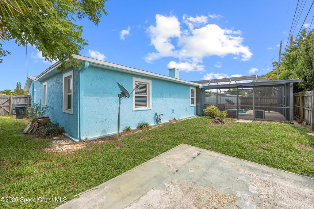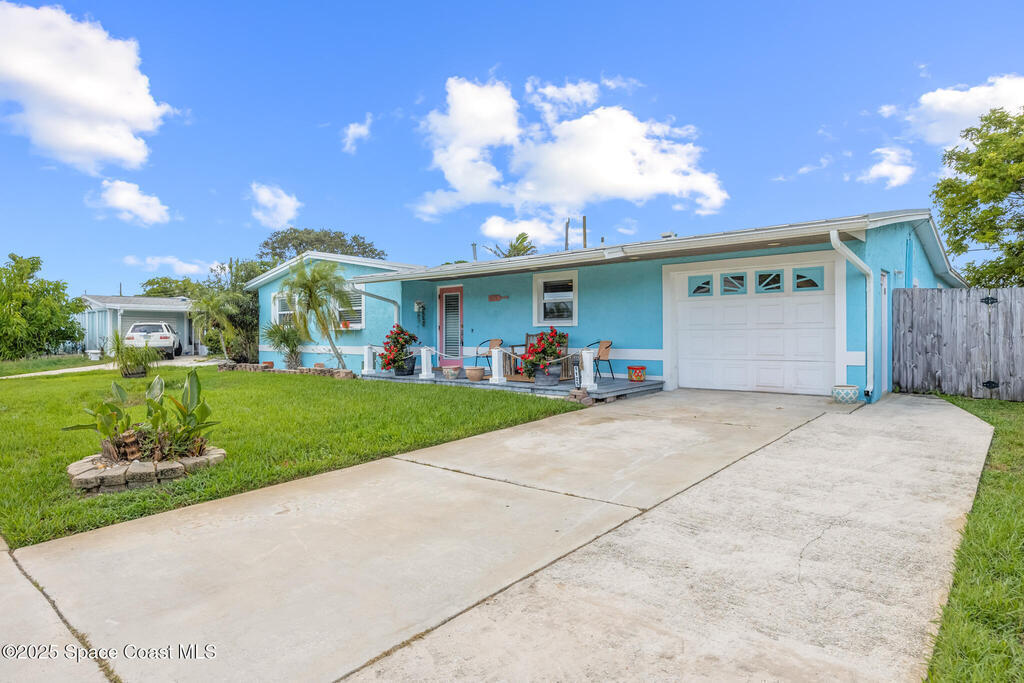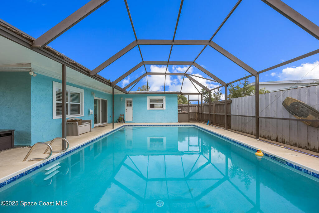 Just under 2,000 square feet and completely remodeled in 2017 with PVC drain lines (no cast iron), updated electrical, trusses, metal roof, ductwork, insulation, drywall, flooring, baseboards, interior doors, fixtures, hardware, trim, modern kitchen including farmhouse sink, granite, slate appliances. Tankless water heater installed in 2024. The fenced-in backyard boasts a pool with lanai. Close drive to beaches, Port Canaveral, and Kennedy Space Center. Watch rocket launches from your extended front porch!