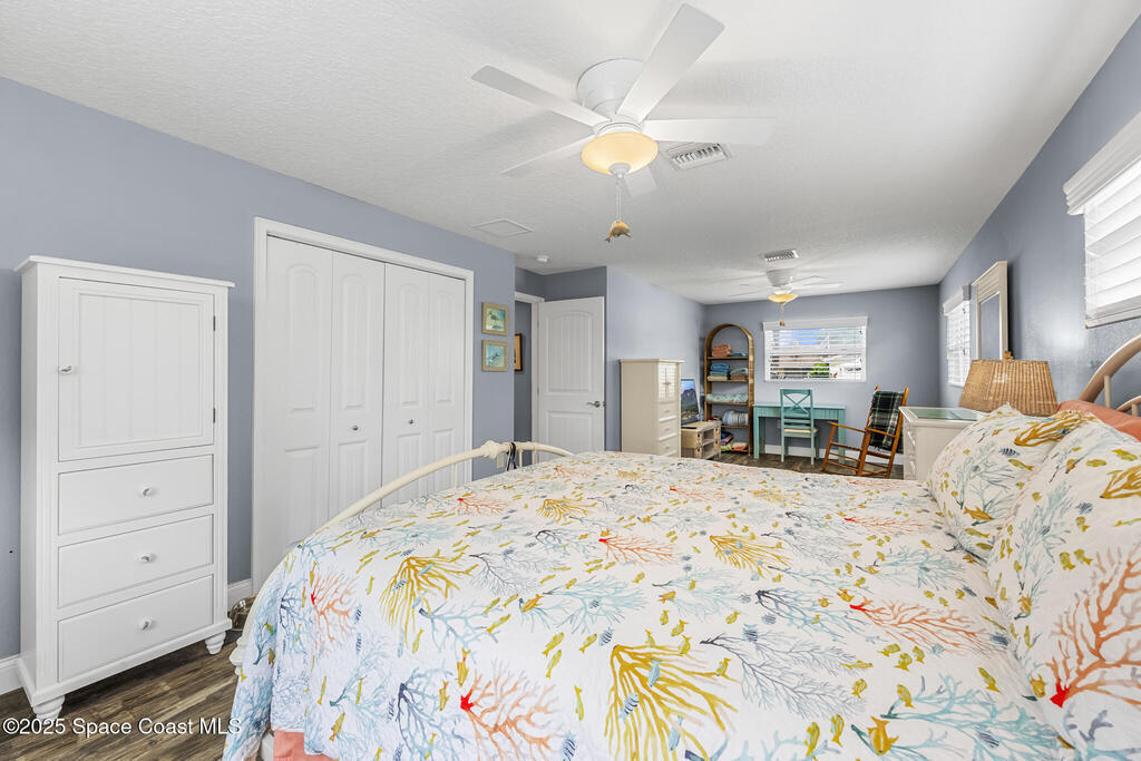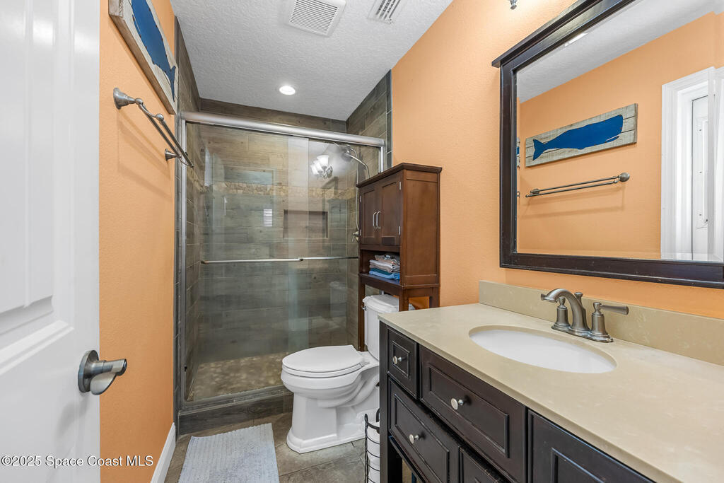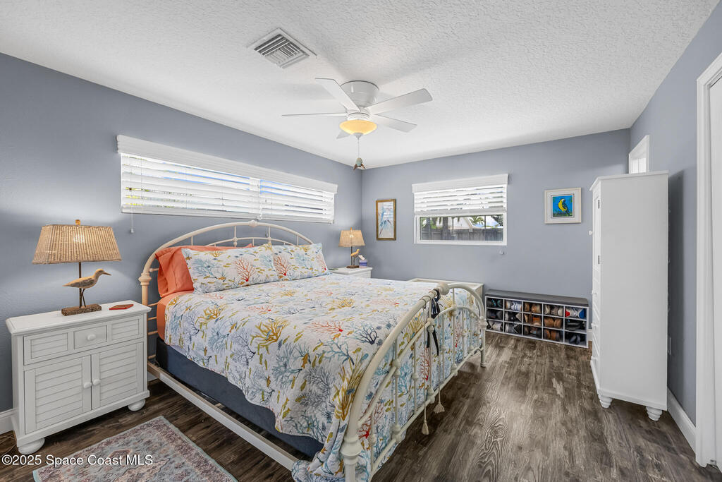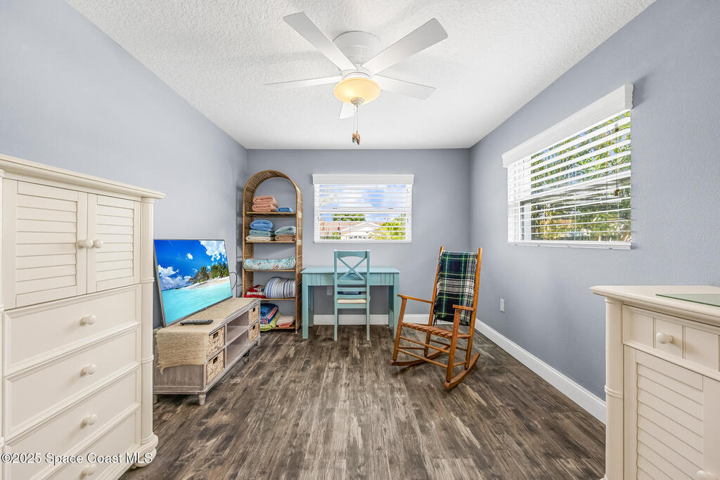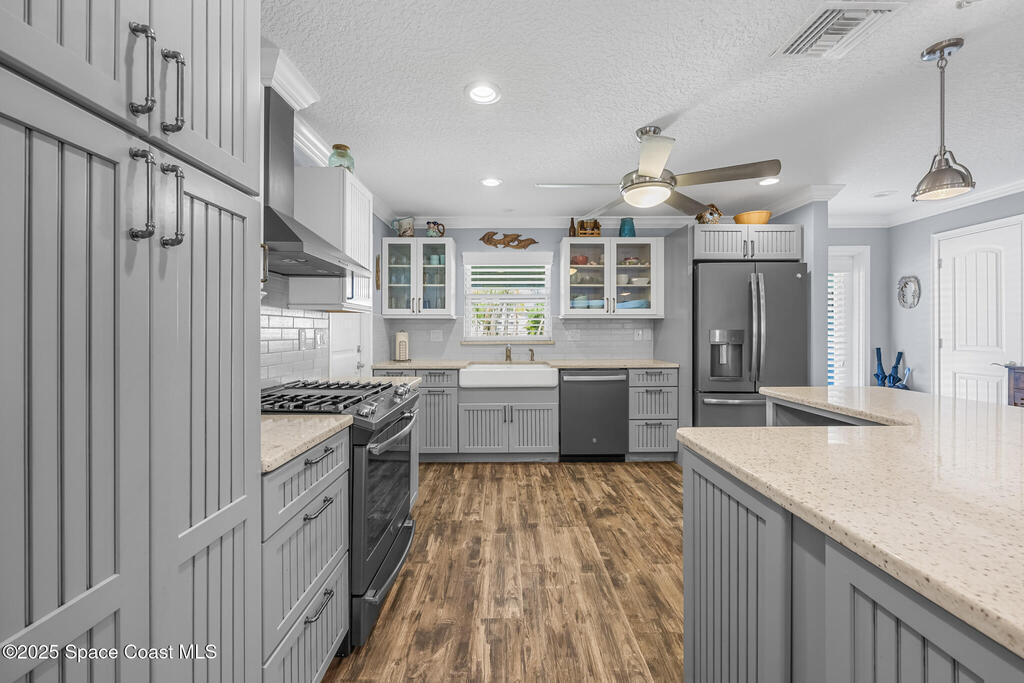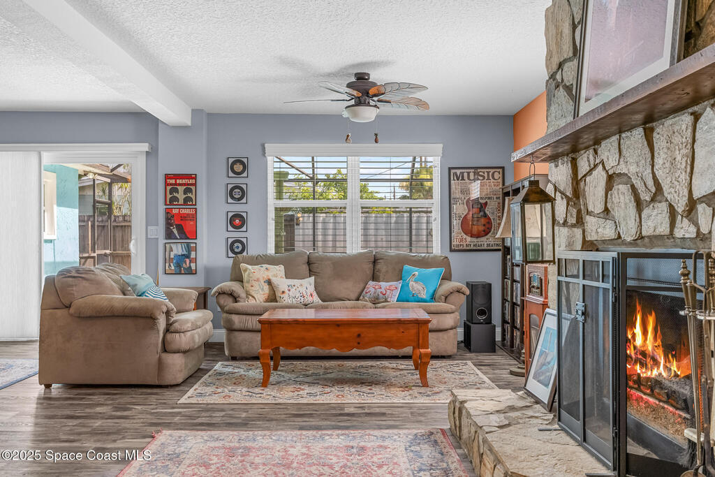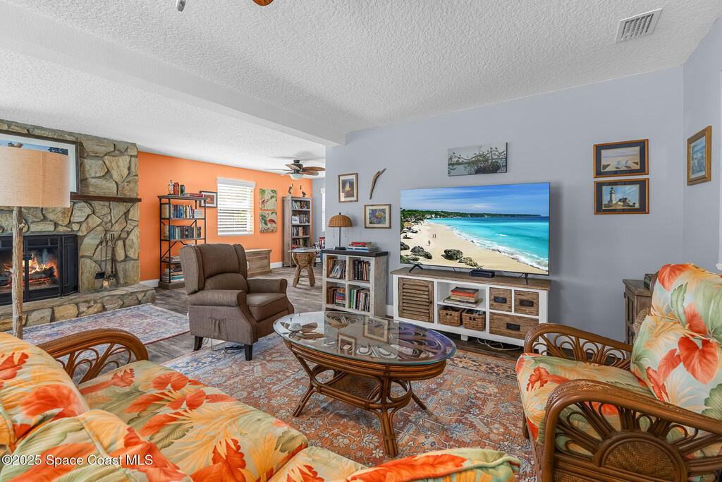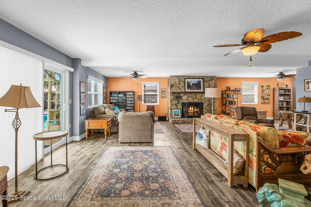 Just under 2,000 square feet and completely remodeled in 2017 with PVC drain lines (no cast iron), updated electrical, trusses, metal roof, ductwork, insulation, drywall, flooring, baseboards, interior doors, fixtures, hardware, trim, modern kitchen including farmhouse sink, granite, slate appliances. Tankless water heater installed in 2024. The fenced-in backyard boasts a pool with lanai. Close drive to beaches, Port Canaveral, and Kennedy Space Center. Watch rocket launches from your extended front porch!