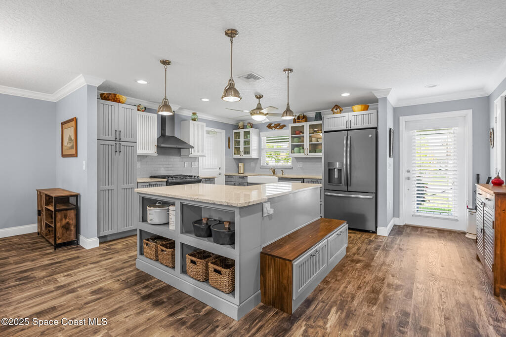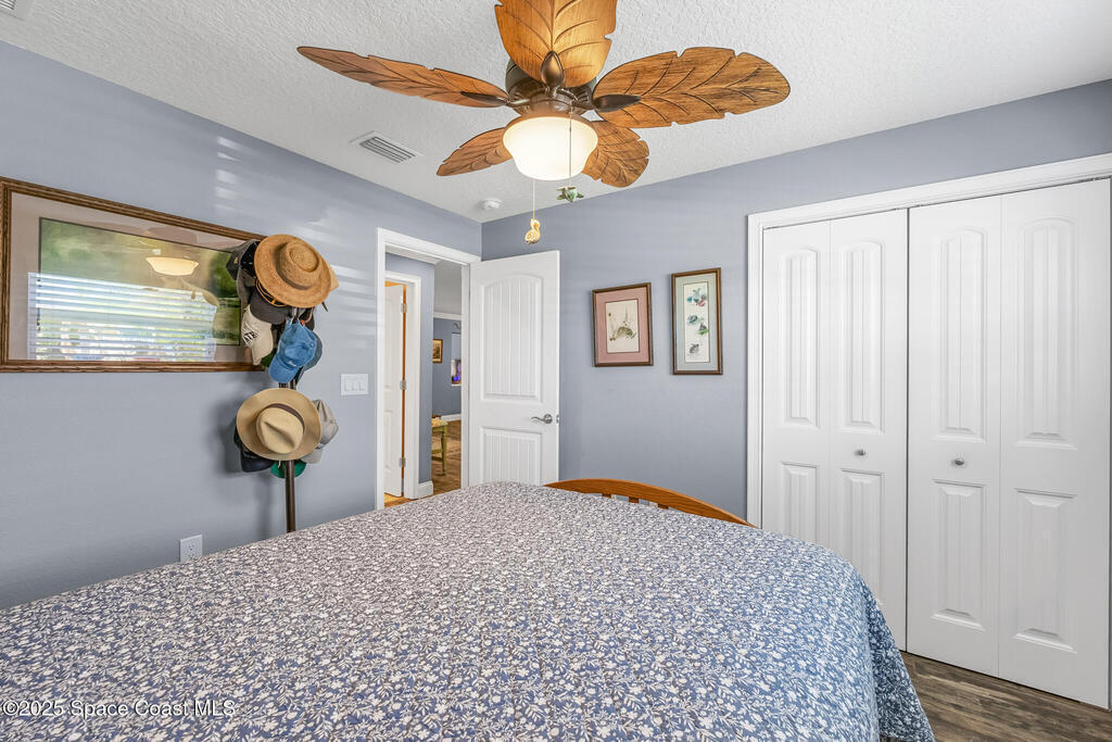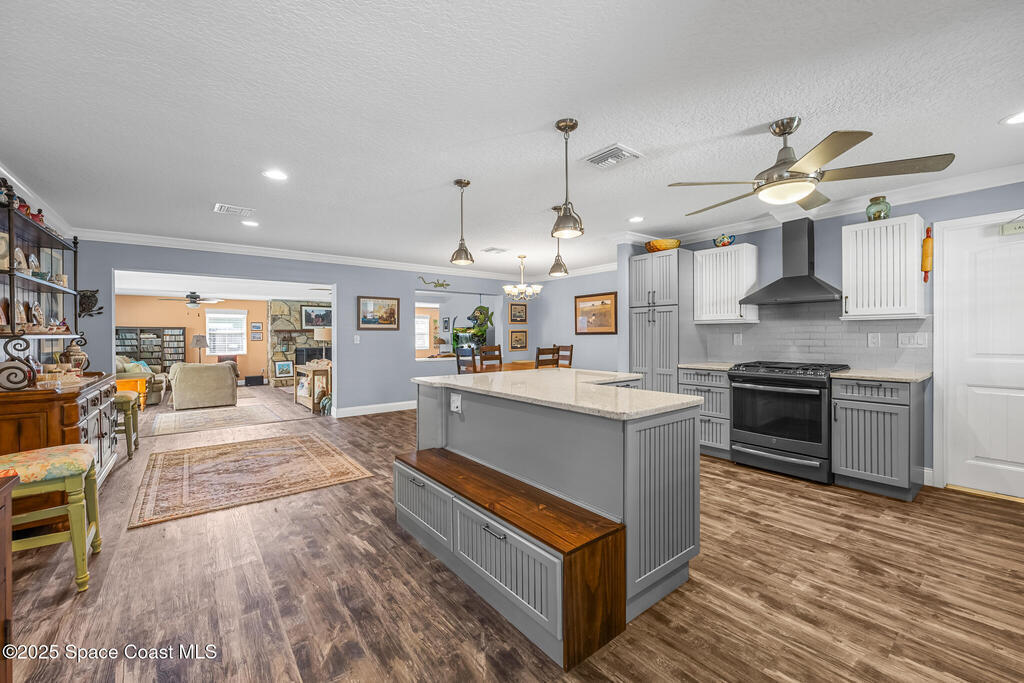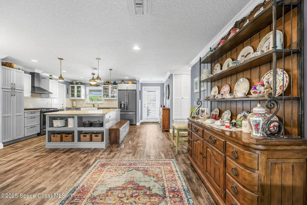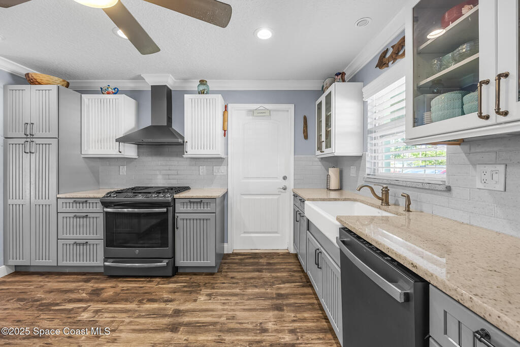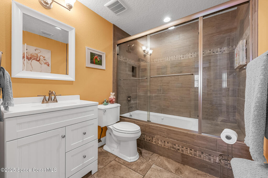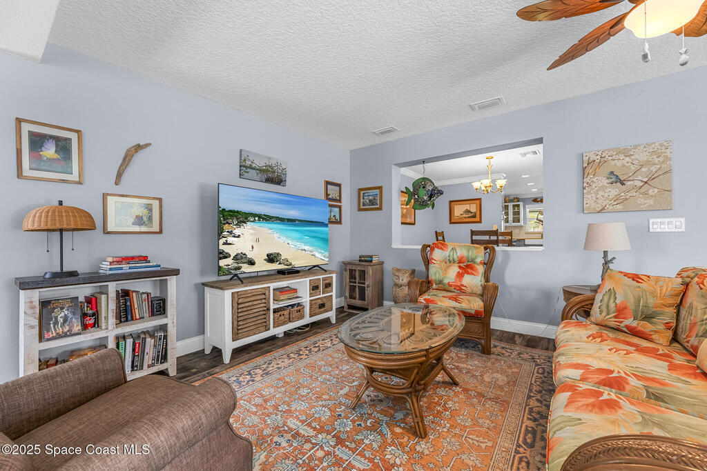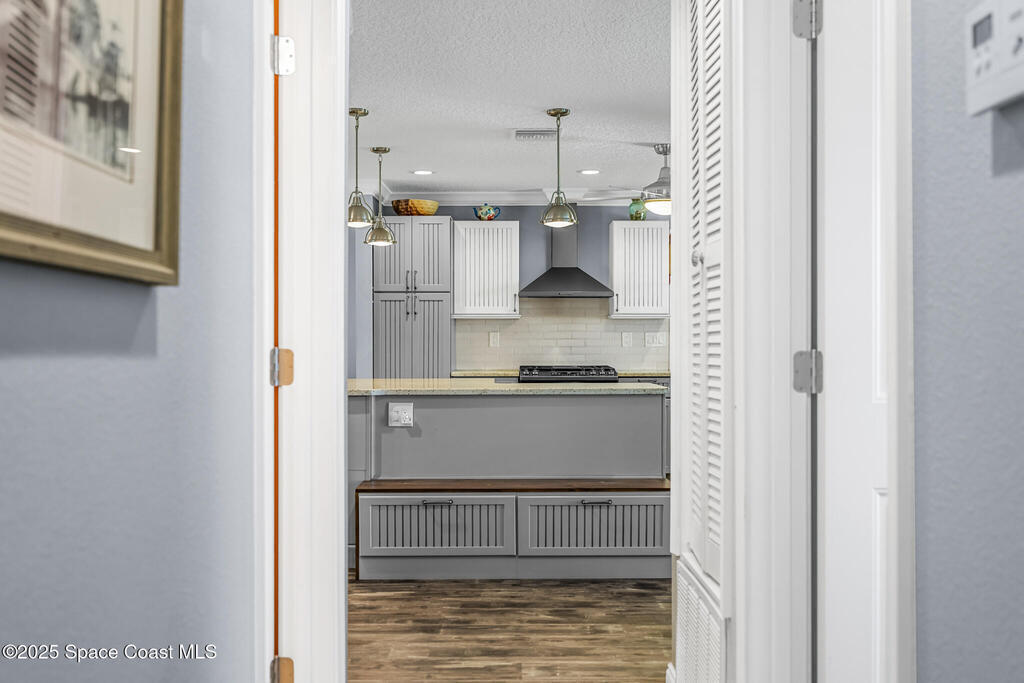 Just under 2,000 square feet and completely remodeled in 2017 with PVC drain lines (no cast iron), updated electrical, trusses, metal roof, ductwork, insulation, drywall, flooring, baseboards, interior doors, fixtures, hardware, trim, modern kitchen including farmhouse sink, granite, slate appliances. Tankless water heater installed in 2024. The fenced-in backyard boasts a pool with lanai. Close drive to beaches, Port Canaveral, and Kennedy Space Center. Watch rocket launches from your extended front porch!