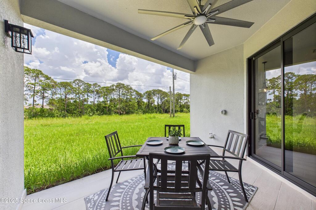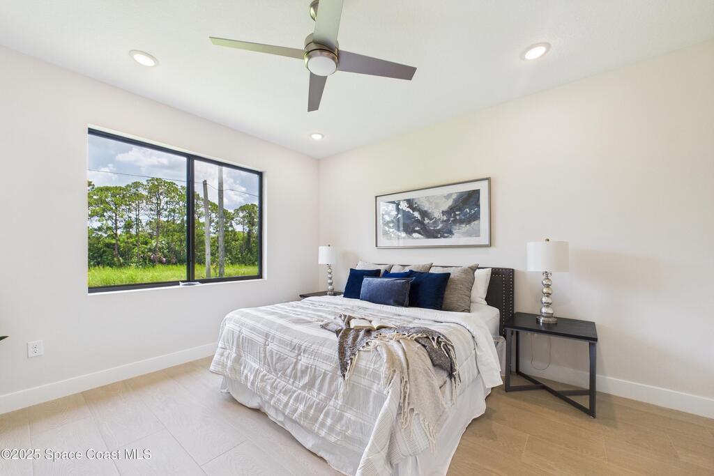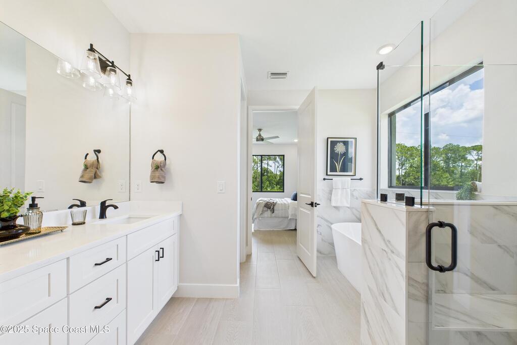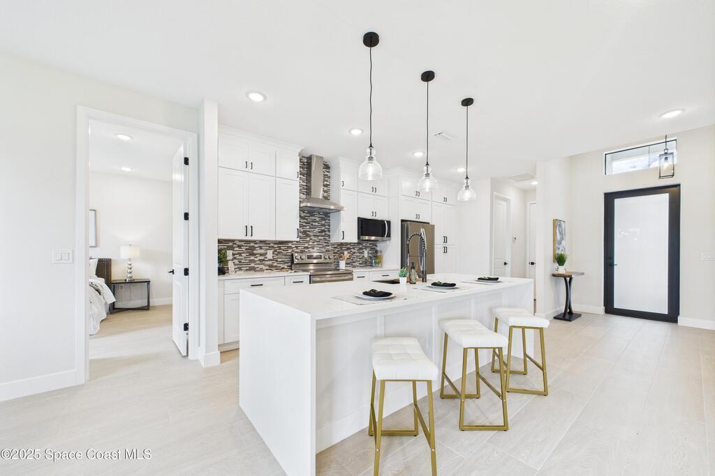 SELLER OFFERING $10K IN CONCESSIONS and an upgraded appliance package including washer and dryer. This home is perfect for multigenerational living, featuring a separate entry and private bathroom en suite, ensuring both privacy and comfort. Discover modern luxury living in Palm Bay's desirable Bayside area, close to shopping, dining, and more. This new build features 4 bedrooms, 3 full baths, and 2,108 sq ft under air. The sleek kitchen boasts a 9'x4' granite island with dual waterfall edges, Stainless steel appliances, and custom soft-close cabinets. The open floor plan flows into the dining and living areas, perfect for entertaining. 9.4' ceilings and elegant porcelain tile flooring (no carpet or vinyl) add a spacious feel. The primary suite includes double sinks, a tub, a walk-in shower, and a walk-in closet. Enjoy a covered rear patio with outdoor kitchen utilities ready. This home also includes a 2-car garage, 1-year builder warranty, and 10-year structural warranty.
