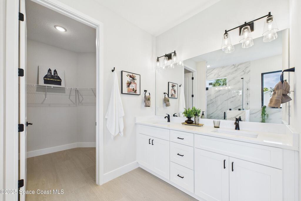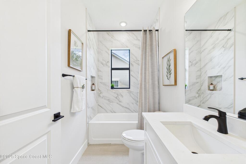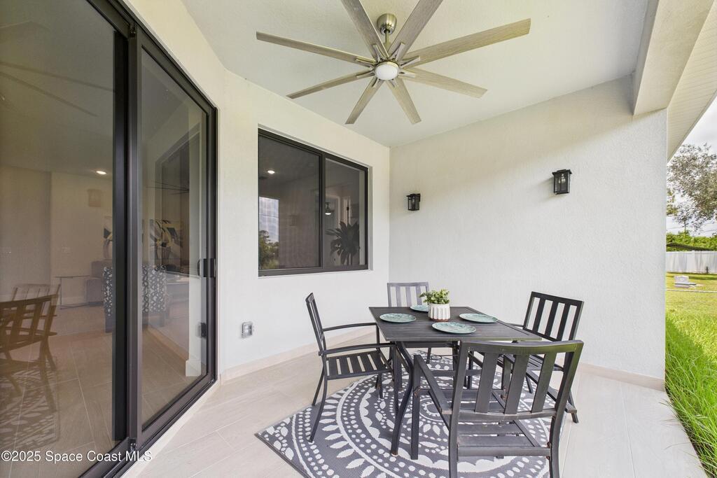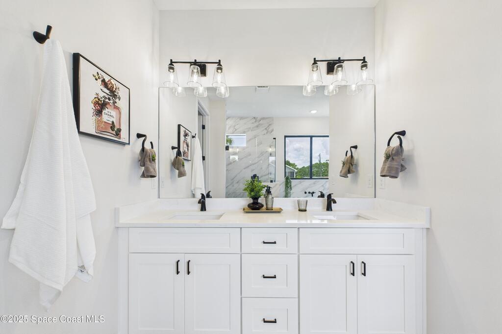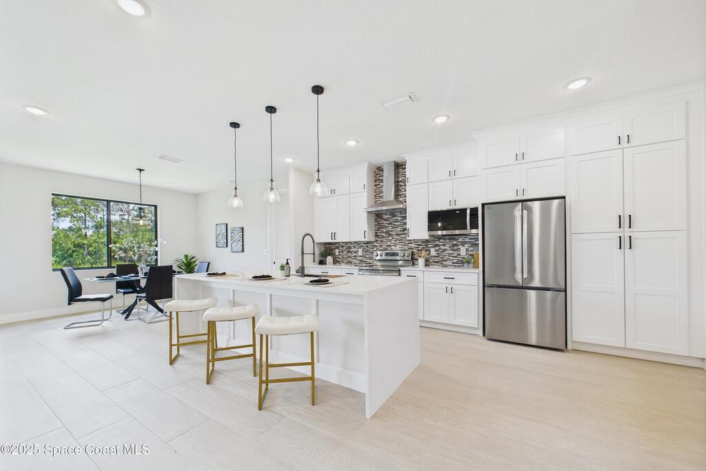 SELLER OFFERING $10K IN CONCESSIONS and an upgraded appliance package including washer and dryer. This home is perfect for multigenerational living, featuring a separate entry and private bathroom en suite, ensuring both privacy and comfort. Discover modern luxury living in Palm Bay's desirable Bayside area, close to shopping, dining, and more. This new build features 4 bedrooms, 3 full baths, and 2,108 sq ft under air. The sleek kitchen boasts a 9'x4' granite island with dual waterfall edges, Stainless steel appliances, and custom soft-close cabinets. The open floor plan flows into the dining and living areas, perfect for entertaining. 9.4' ceilings and elegant porcelain tile flooring (no carpet or vinyl) add a spacious feel. The primary suite includes double sinks, a tub, a walk-in shower, and a walk-in closet. Enjoy a covered rear patio with outdoor kitchen utilities ready. This home also includes a 2-car garage, 1-year builder warranty, and 10-year structural warranty.
