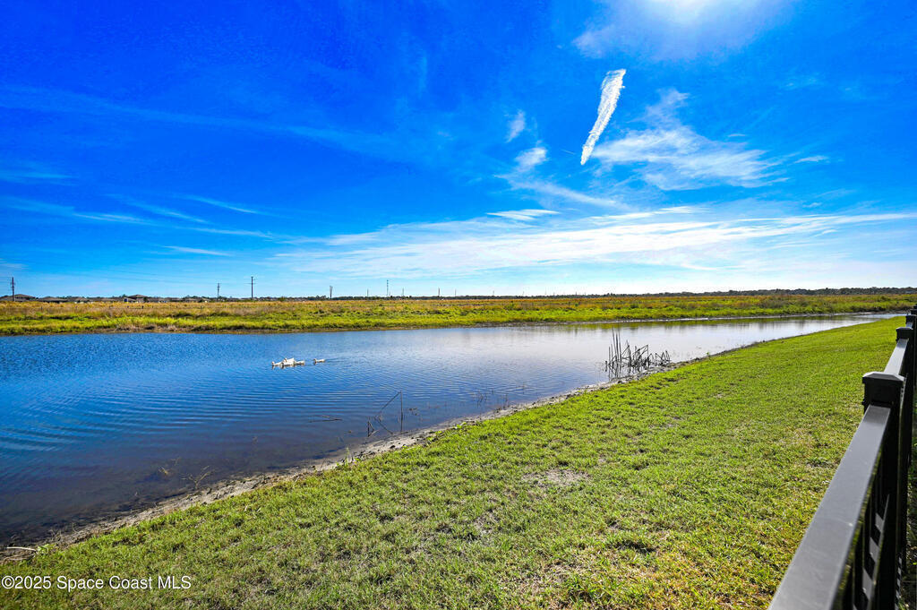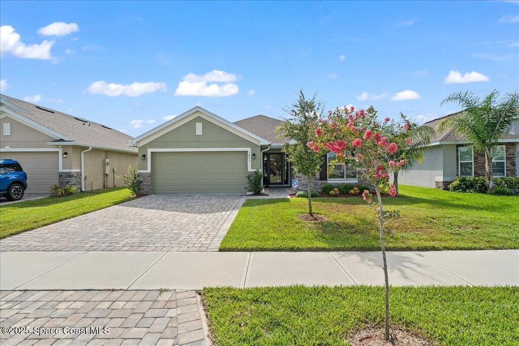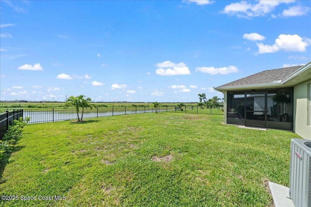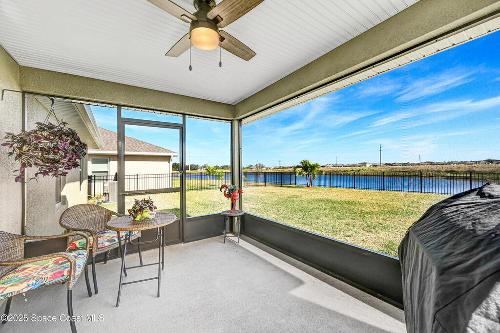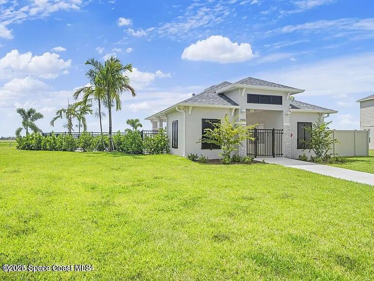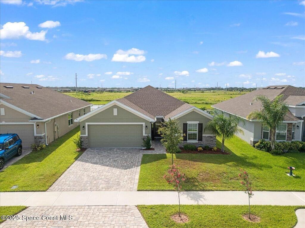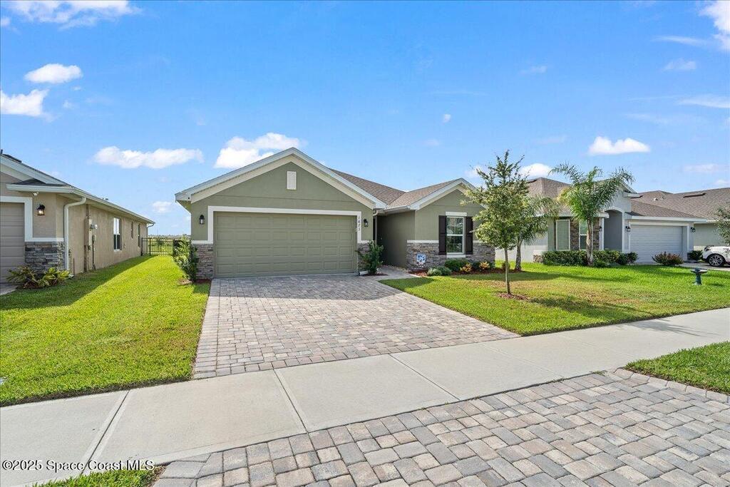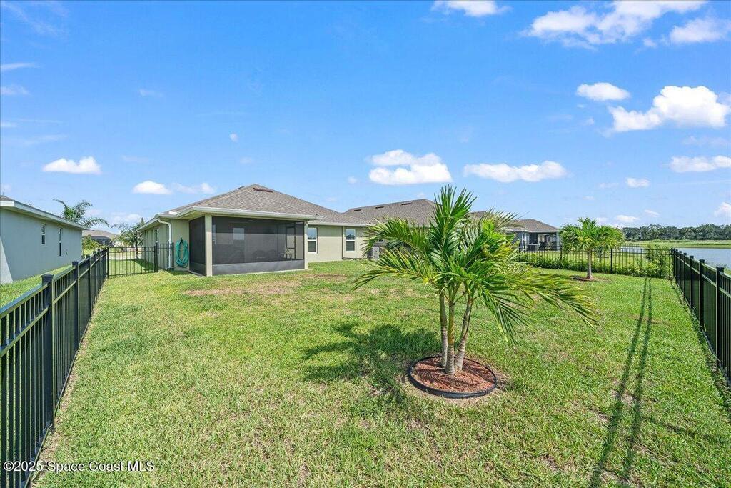 Welcome to The Courtyards at Waterstone! This beautiful Lakefront 2023 Built 3-bedroom, 2-bath home offers the perfect blend of comfort and style in a desirable gated community featuring a sparkling community pool, scenic surroundings, and low HOA fees. This well-maintained ''one owner'' home still shows like a model and is less than two years old. Recent upgrades include: Screened in Patio, Fenced in Yard, Ceiling Fans and window treatments. Step inside to an open floorplan with 10' vaulted ceilings, creating a bright and airy living space. Enjoy stunning sunrise views from your relaxing backyard, perfect for entertaining guests! The kitchen features designer all-wood coastal color cabinets with crown molding, Moen faucets, stainless steel appliances, recessed lighting and an oversized island ideal for meal prep and gatherings and is open to dining / family room. Retreat to the relaxing owners suite, complete with large walk-in closet and nice owners bathroom with 5' walk in shower.