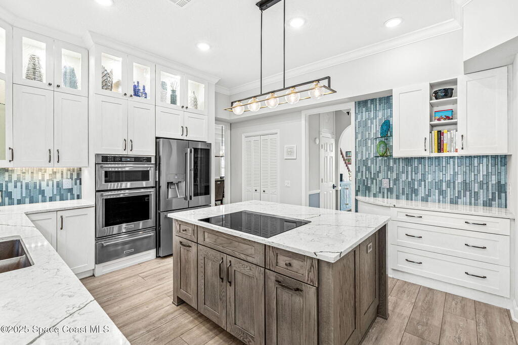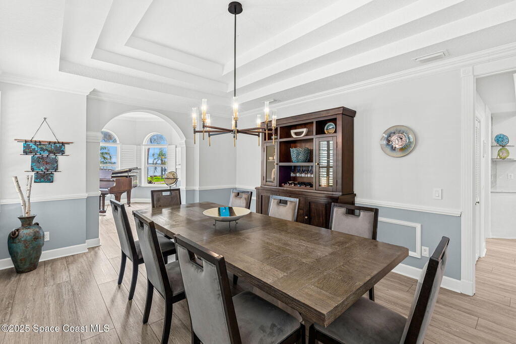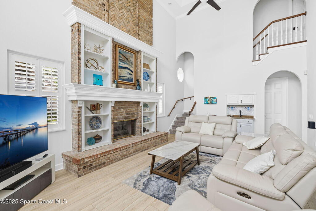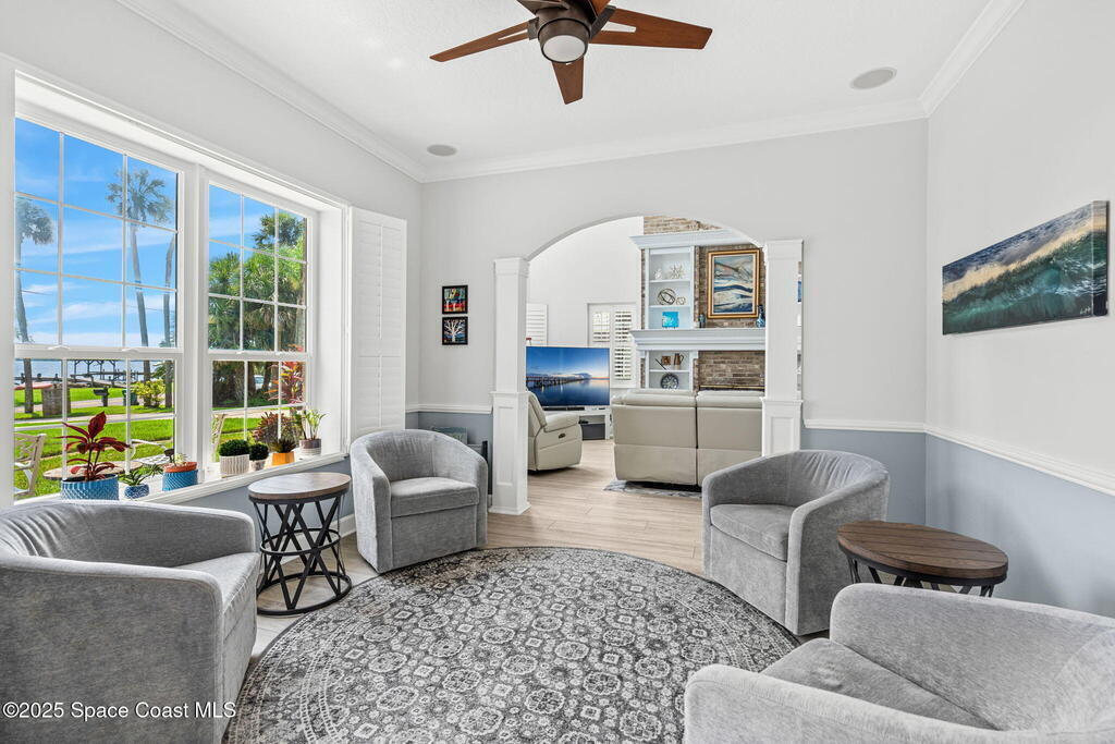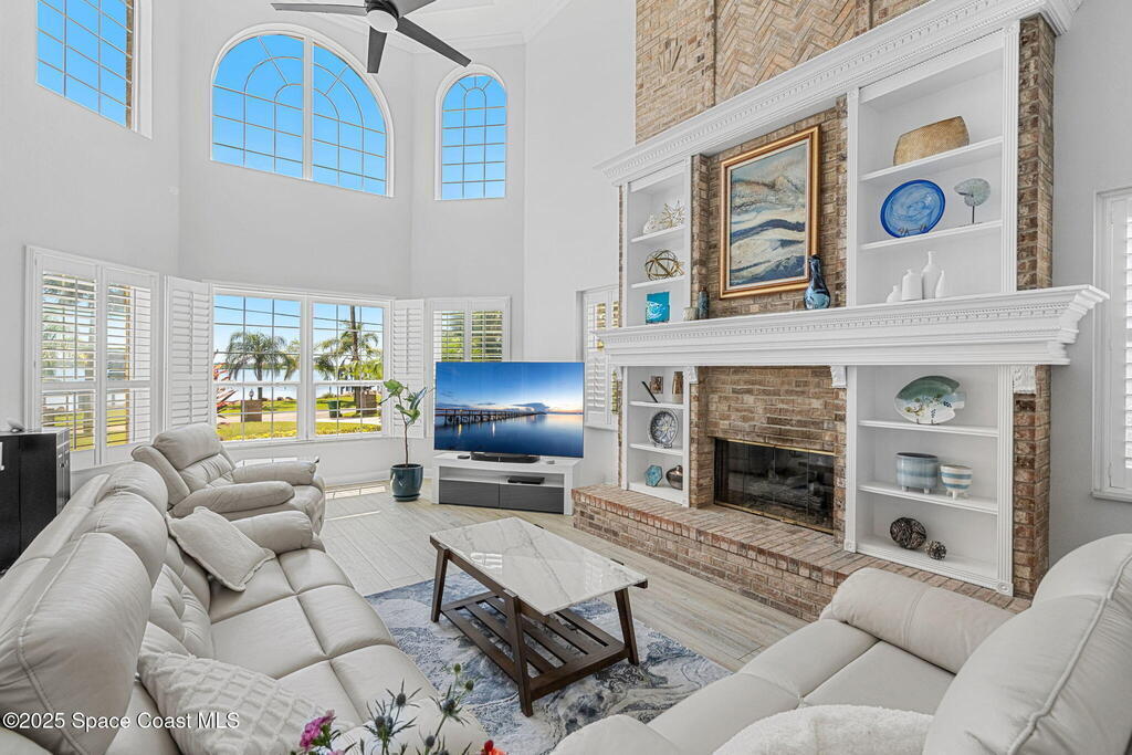 Priced BELOW appraised value! The appraisal came in HIGHER than our list price!Offering sweeping Indian River views and a resort-style lifestyle, this meticulously maintained and beautifully updated 4-bedroom, 3-bathroom brick estate seamlessly blends timeless charm with modern elegance. Spanning a generous 3,820 sq ft of thoughtfully designed living space, this turn-key waterfront home is tailored for family living, entertaining, and the ultimate Florida boating lifestyle.Step inside to discover a light-filled interior with multiple living areas including a great room, sitting room, den, and a flex/music room--all enhanced by high-end finishes such as Coretec luxury flooring, rich wood floors, plantation shutters, tray ceilings, and a warm gas brick fireplace. The expansive gourmet kitchen, completely remodeled in 2022, showcases custom solid maple cabinetry with soft-close doors, quartz countertops, glass tile accents, a built-in china hutch,