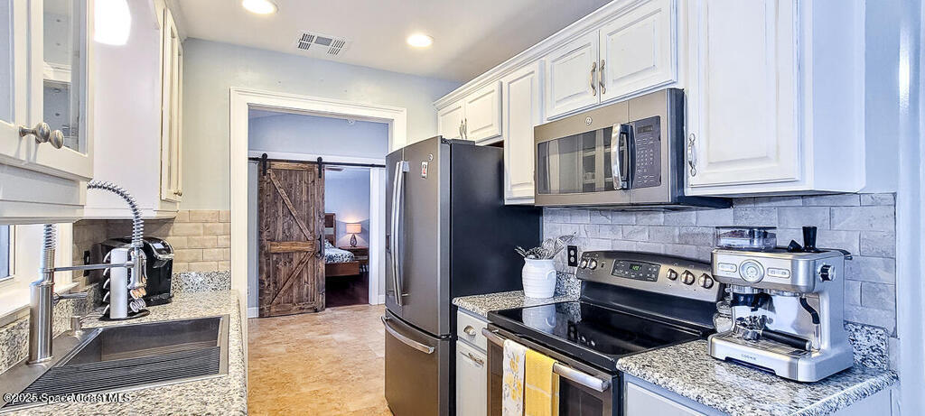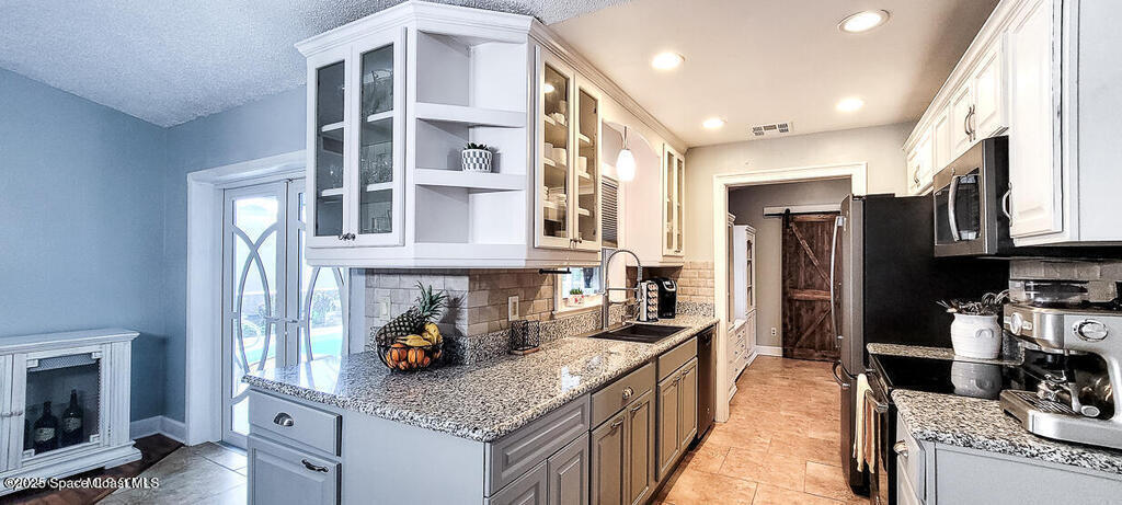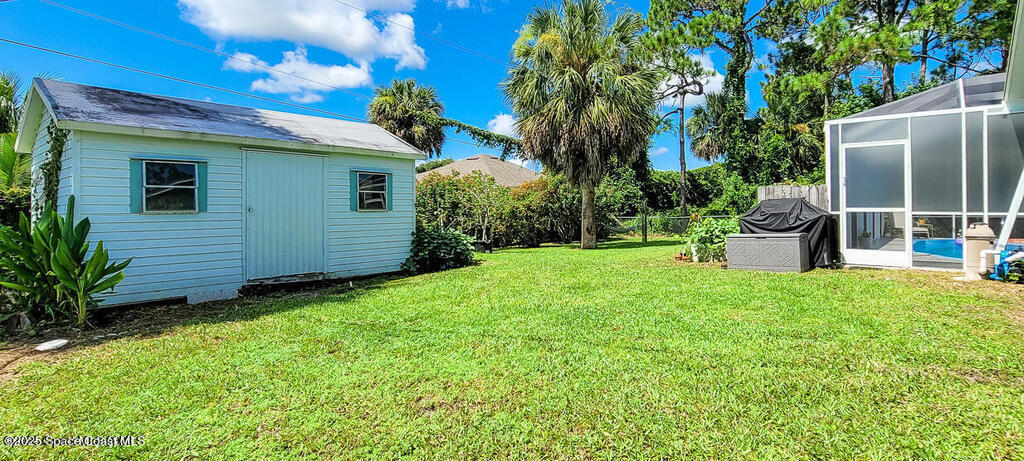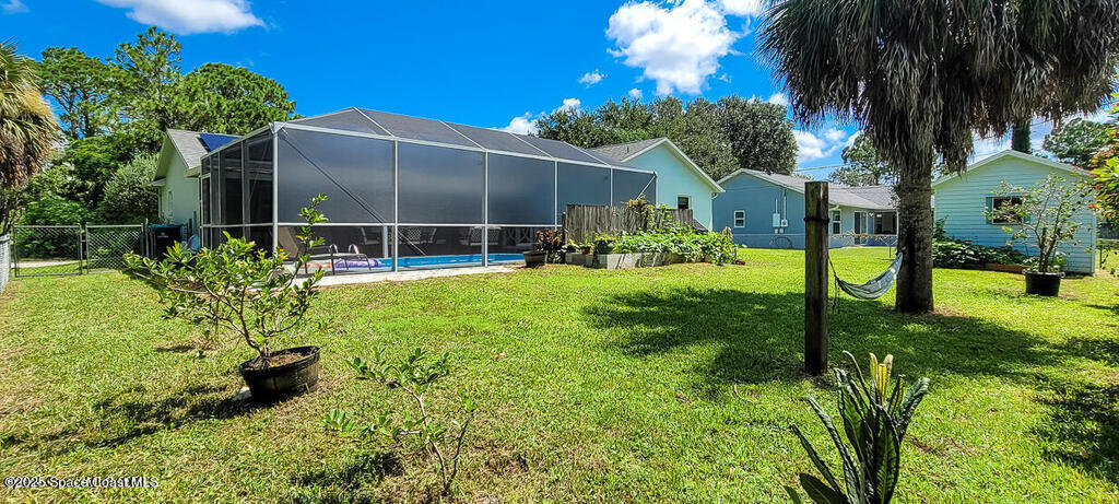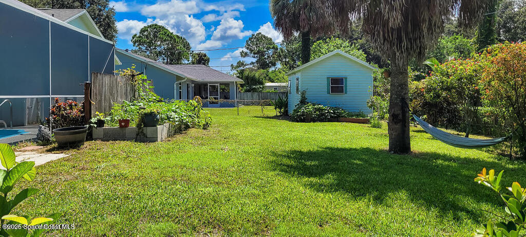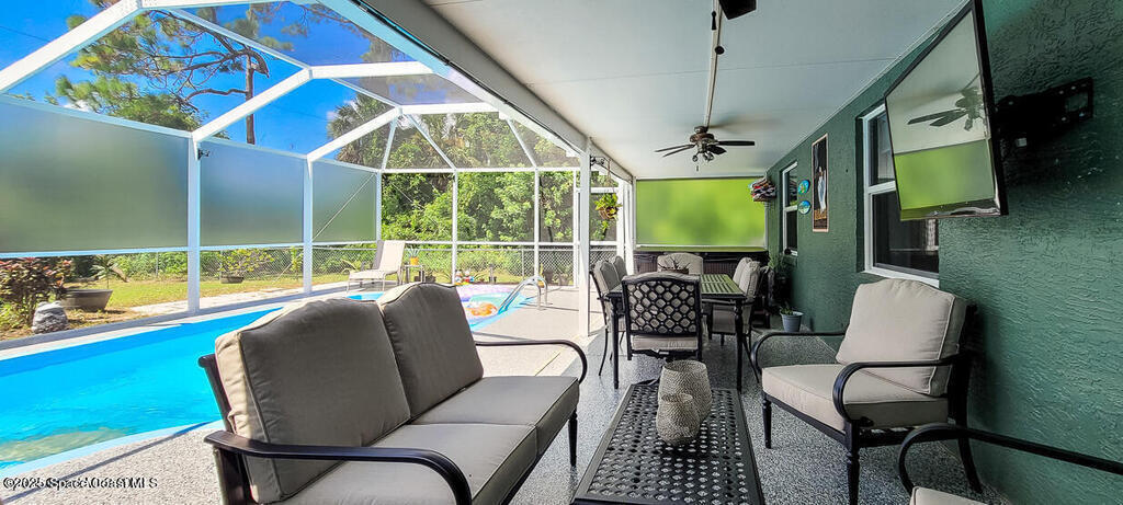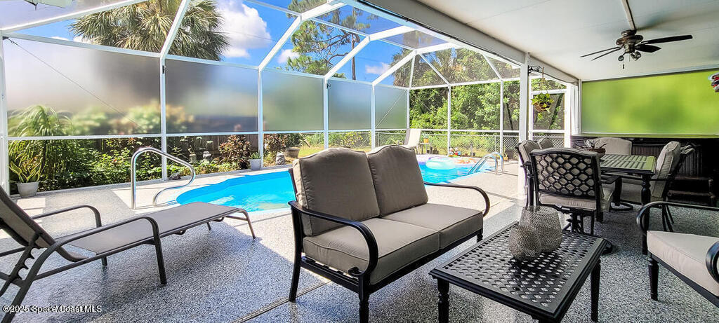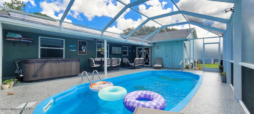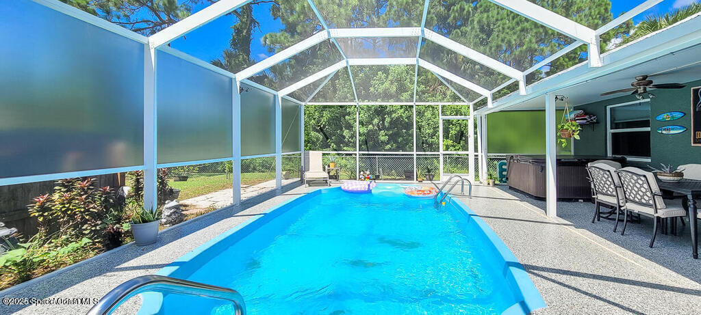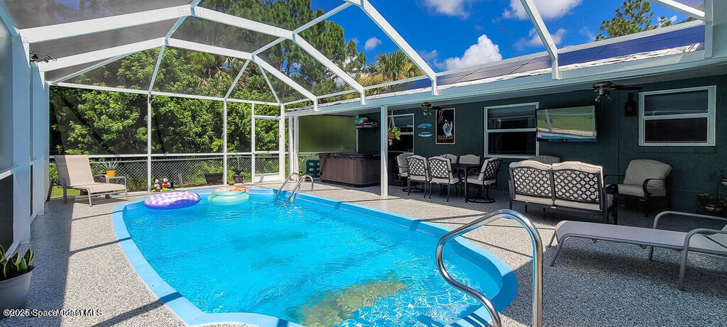 Back on market after buyer financing fell through--seller is highly motivated! This beautifully upgraded 3-bed, 2-bath pool home offers paid-off solar panels, hurricane-impact windows/doors, and solid block construction for long-term value and efficiency. Features include a newer roof (2022), granite kitchen with farmhouse sink, screened patios front and back, French doors leading to pool, jacuzzi, and resurfaced deck in a fully fenced yard. Enjoy city water, 2019 water heater, 2018 HVAC, shed with power, and security cameras. Convenient to I-95 and major shopping.