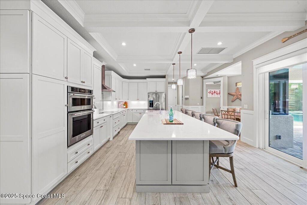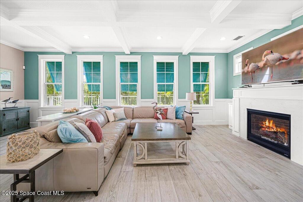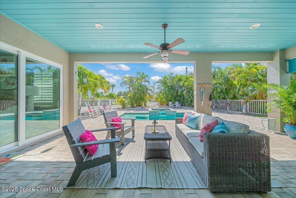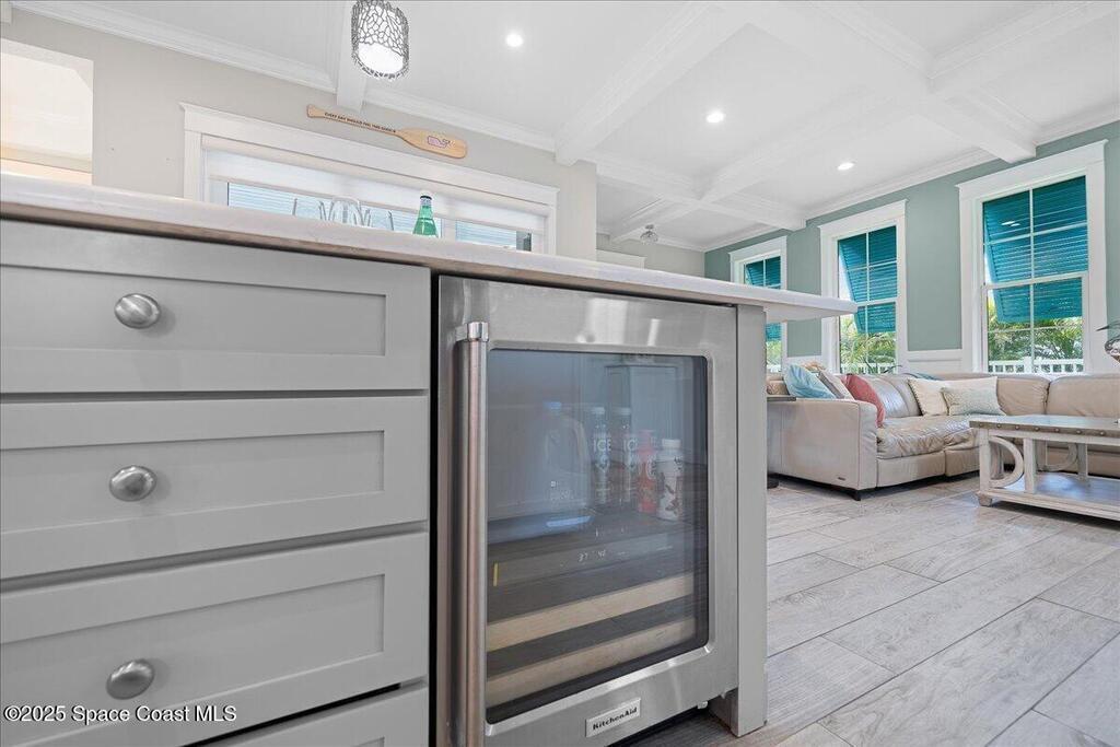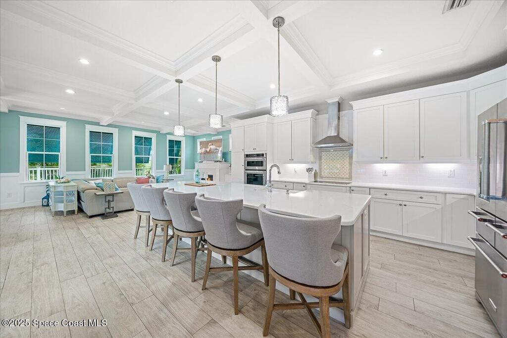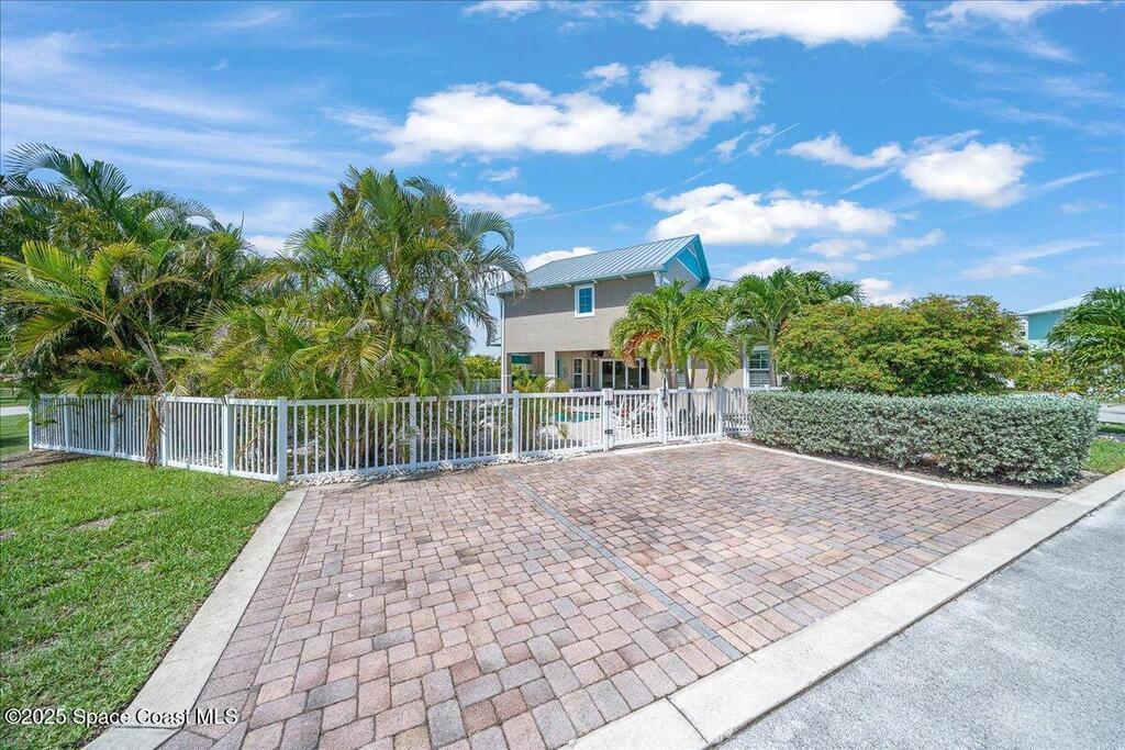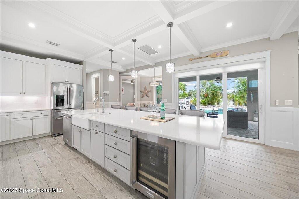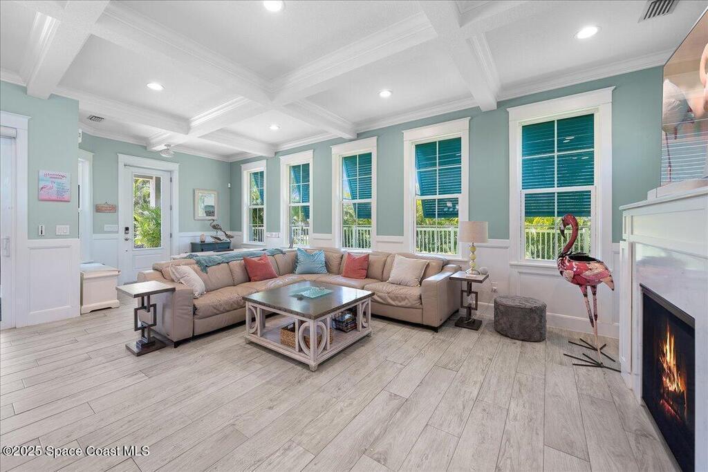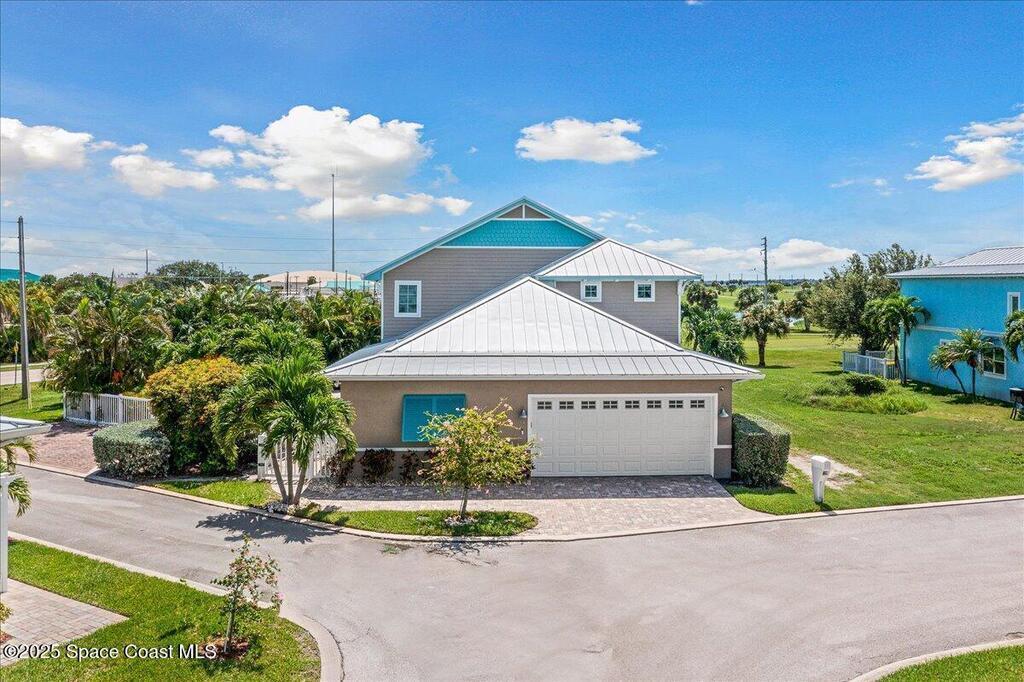 Welcome to this Key West-style custom stunner in the coveted Golf Cottages at Cocoa Beach. Built in 2017, this 2,863 sq. ft. residence sits on a 0.21-acre lot along the Cocoa Beach Golf Course and was designed with comfort, style, and multigenerational living in mind.Inside, you'll find 3 bedrooms and 3.5 baths, including two en suites--one on the main level and another upstairs paired with a second living area and a third bedroom. The soaring custom ceilings include coffered, vaulted, and tongue-and-groove finishes, adding to the home's character and craftsmanship.The gourmet kitchen is a chef's dream, boasting high-end stainless steel appliances including a convection cooktop, double oven, beverage refrigerator, farmhouse sink, and a large quartz island. Its crisp all-white cabinetry is beautifully accented with tan and turquoise design touches that echo Cocoa Beach's coastal charm.Step outside to your own tropical oasis: a saltwater pool with heated spa, surrounded by mature