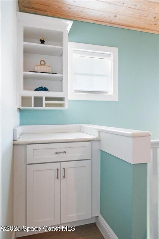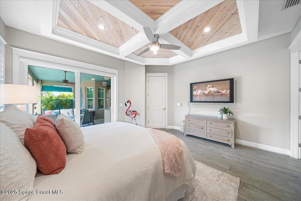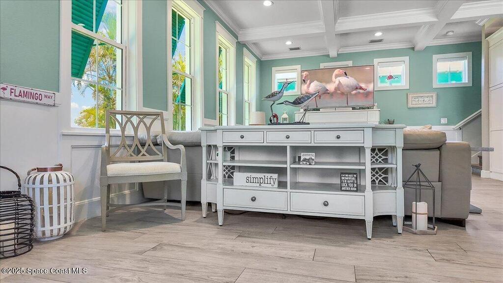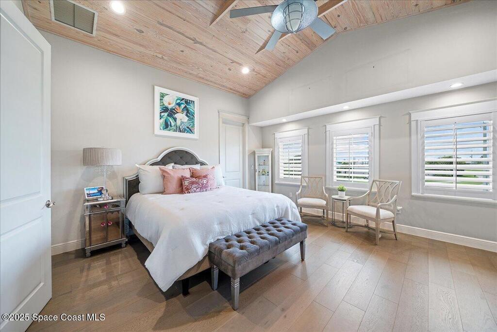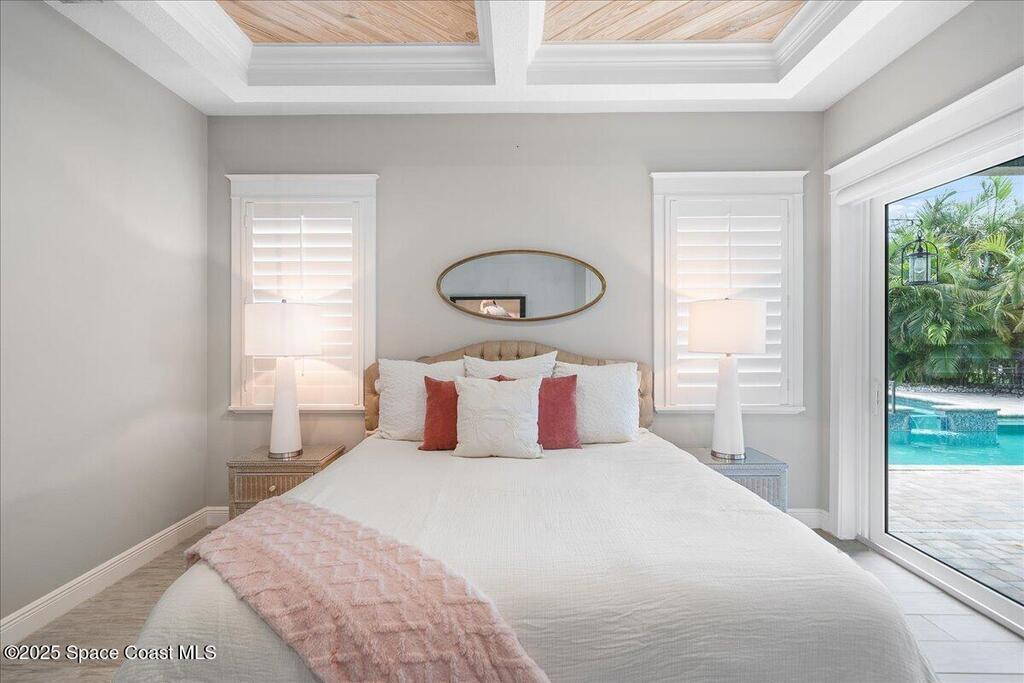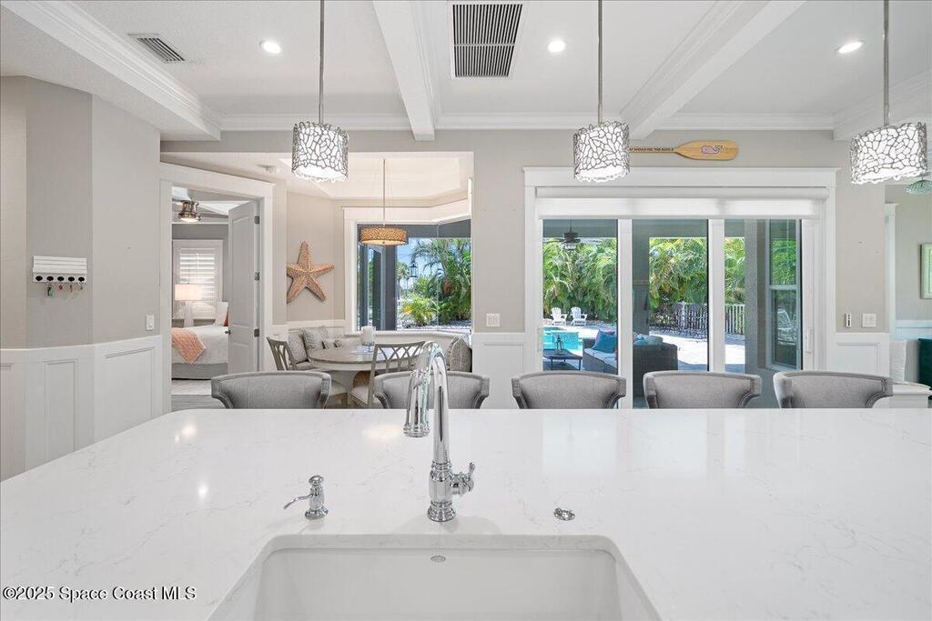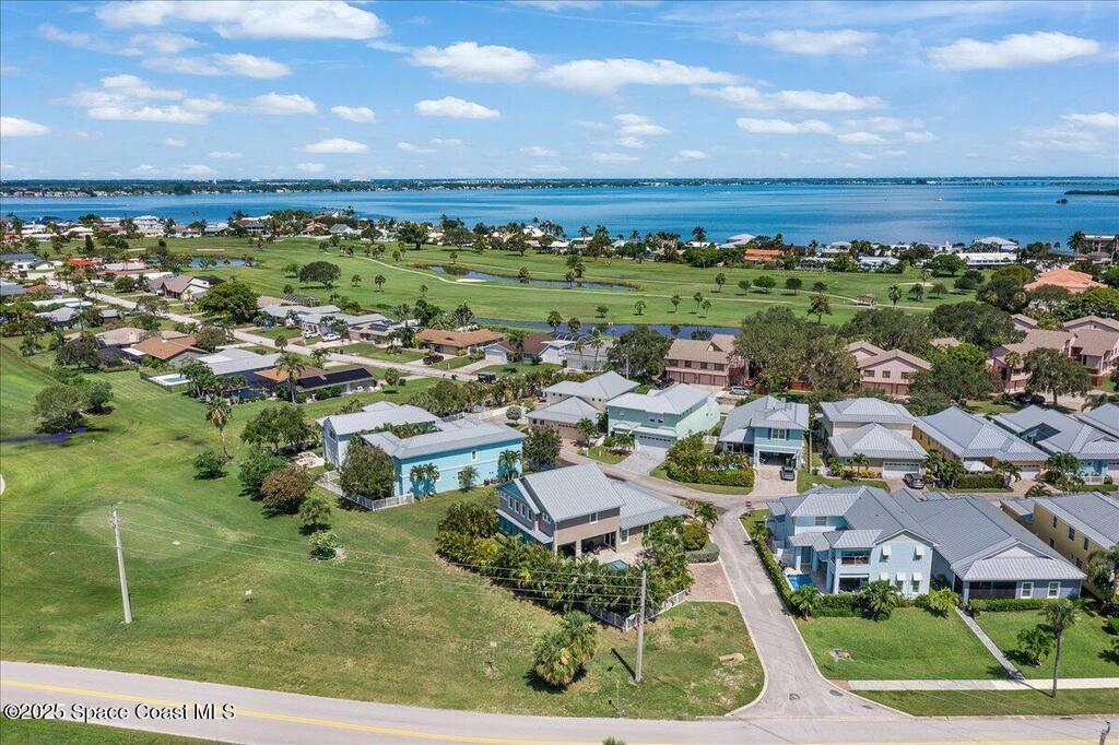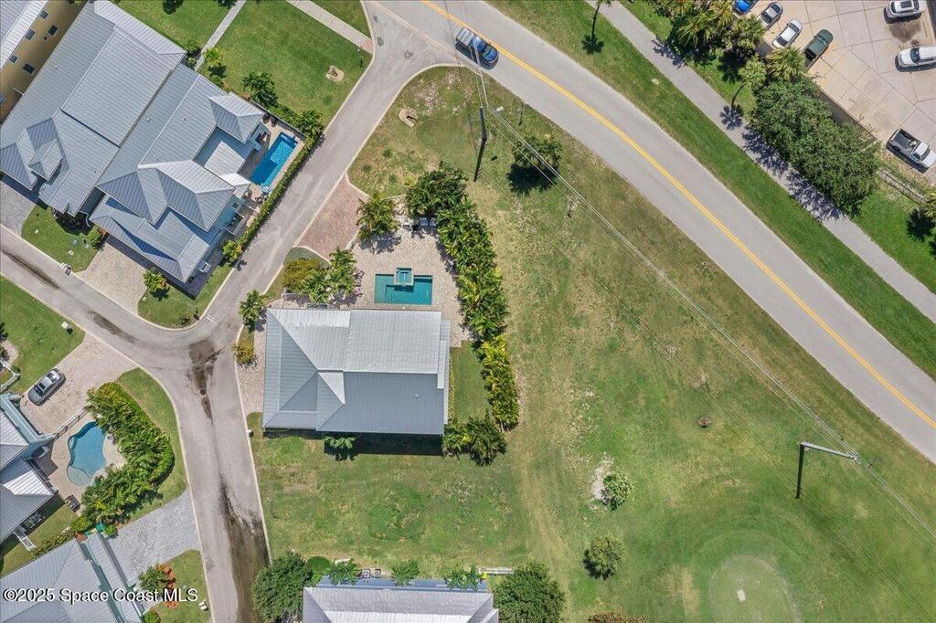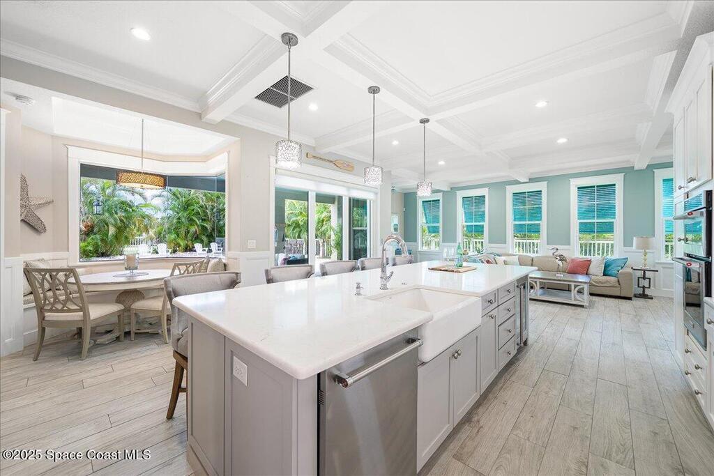 Welcome to this Key West-style custom stunner in the coveted Golf Cottages at Cocoa Beach. Built in 2017, this 2,863 sq. ft. residence sits on a 0.21-acre lot along the Cocoa Beach Golf Course and was designed with comfort, style, and multigenerational living in mind.Inside, you'll find 3 bedrooms and 3.5 baths, including two en suites--one on the main level and another upstairs paired with a second living area and a third bedroom. The soaring custom ceilings include coffered, vaulted, and tongue-and-groove finishes, adding to the home's character and craftsmanship.The gourmet kitchen is a chef's dream, boasting high-end stainless steel appliances including a convection cooktop, double oven, beverage refrigerator, farmhouse sink, and a large quartz island. Its crisp all-white cabinetry is beautifully accented with tan and turquoise design touches that echo Cocoa Beach's coastal charm.Step outside to your own tropical oasis: a saltwater pool with heated spa, surrounded by mature