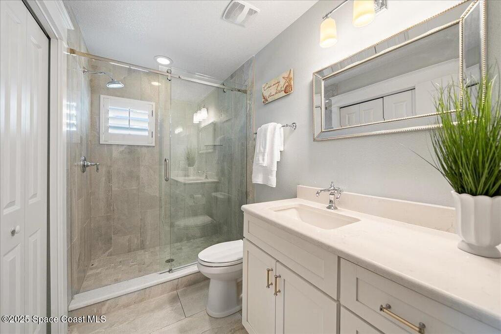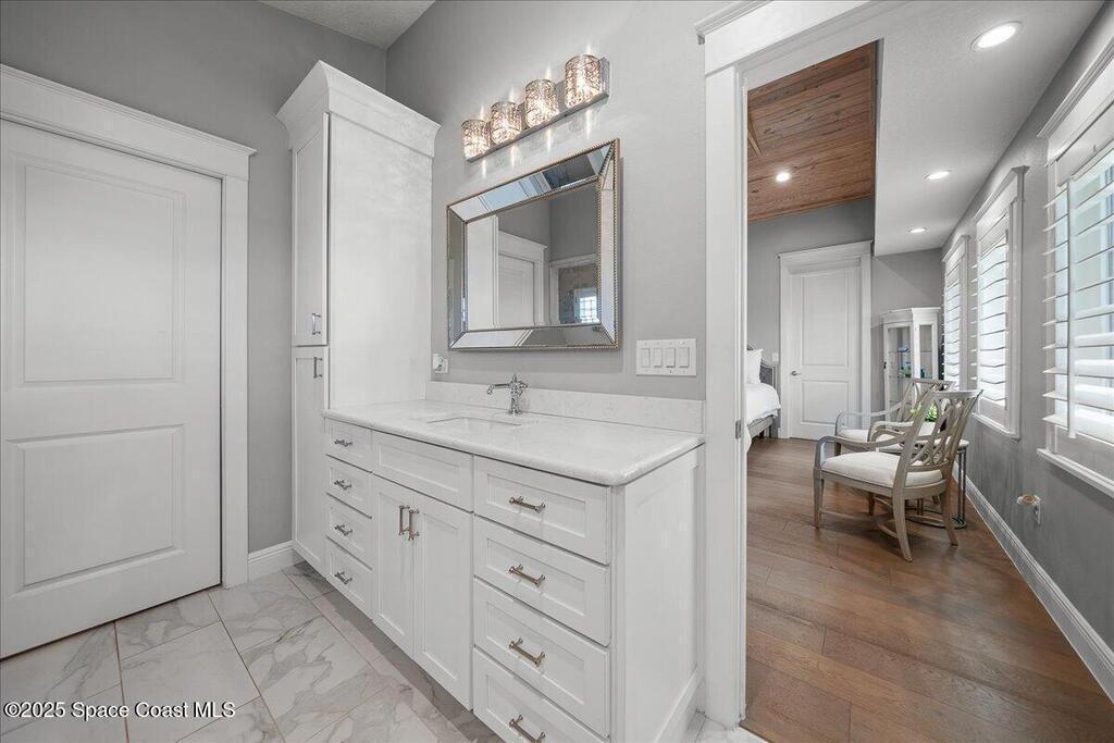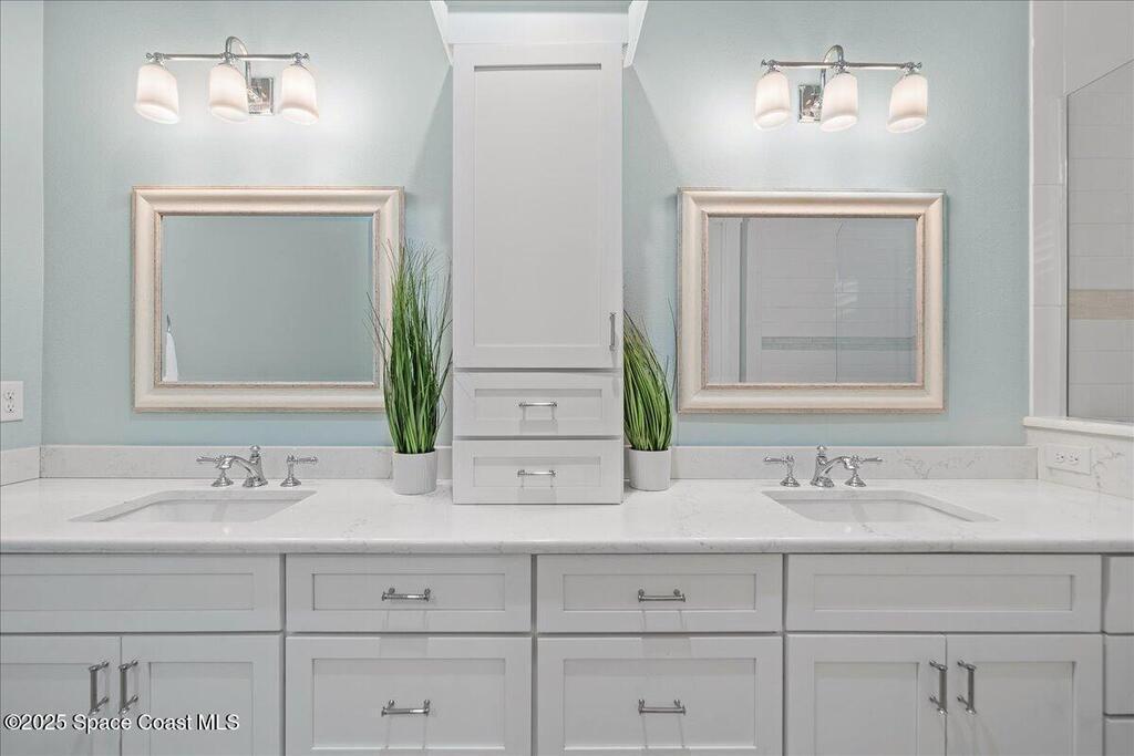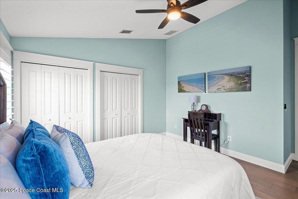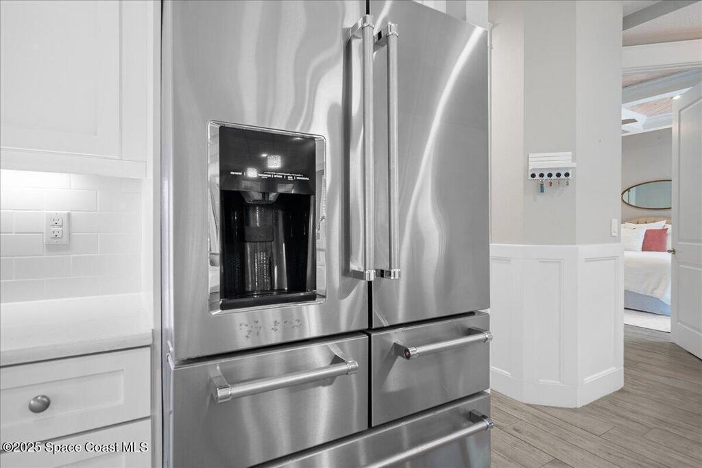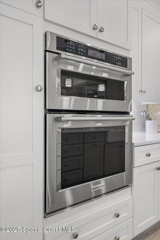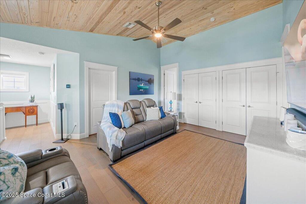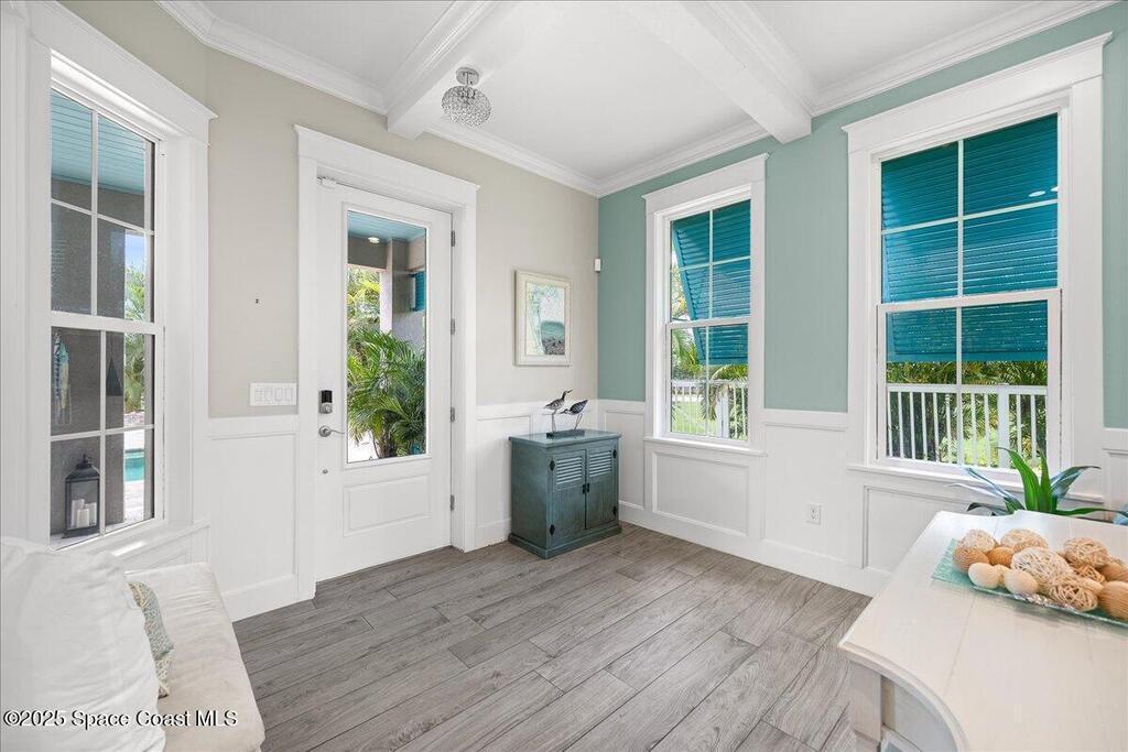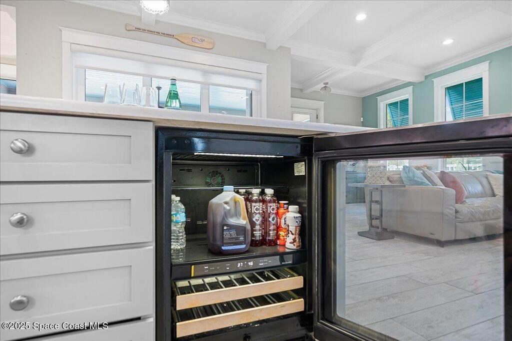 Welcome to this Key West-style custom stunner in the coveted Golf Cottages at Cocoa Beach. Built in 2017, this 2,863 sq. ft. residence sits on a 0.21-acre lot along the Cocoa Beach Golf Course and was designed with comfort, style, and multigenerational living in mind.Inside, you'll find 3 bedrooms and 3.5 baths, including two en suites--one on the main level and another upstairs paired with a second living area and a third bedroom. The soaring custom ceilings include coffered, vaulted, and tongue-and-groove finishes, adding to the home's character and craftsmanship.The gourmet kitchen is a chef's dream, boasting high-end stainless steel appliances including a convection cooktop, double oven, beverage refrigerator, farmhouse sink, and a large quartz island. Its crisp all-white cabinetry is beautifully accented with tan and turquoise design touches that echo Cocoa Beach's coastal charm.Step outside to your own tropical oasis: a saltwater pool with heated spa, surrounded by mature