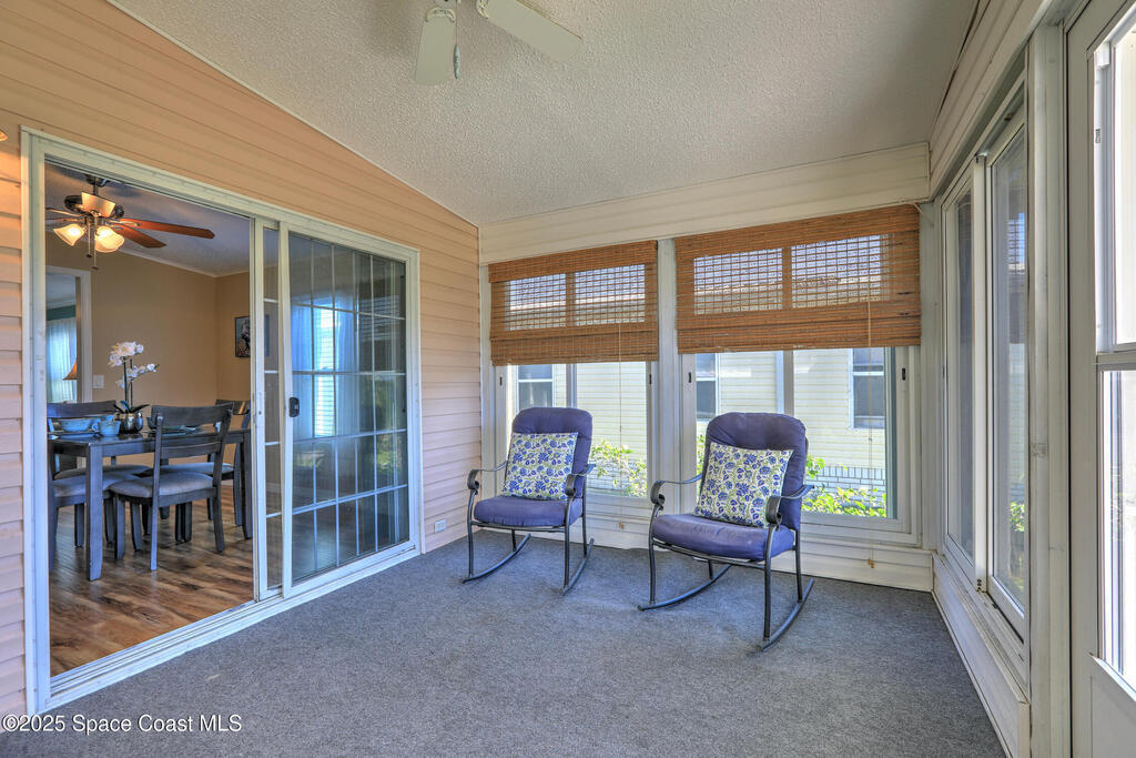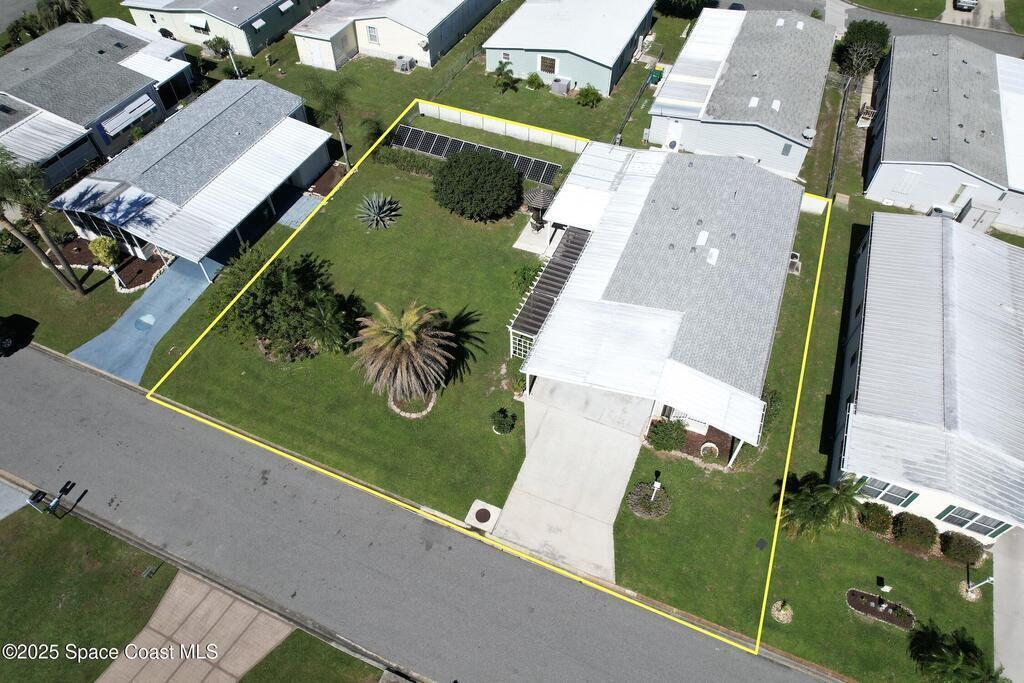 This beautifully maintained home sits on a huge double lot with the benefit of only one maintenance fee. Enjoy energy savings with solar panels discreetly located behind the fence and a new roof (2022) for added peace of mind. The interior features tile and plank flooring throughout the living areas, while the updated kitchen boasts an abundance of attractive wood cabinetry, tile backsplash, and ample countertop space. The split-bedroom floor plan provides privacy, and both bathrooms offer walk-in tiled showers. Relax or entertain in the enclosed Florida room or on the spacious patio overlooking the double lot. Additional highlights include accordion shutters for storm protection, two storage sheds, and a double carport.