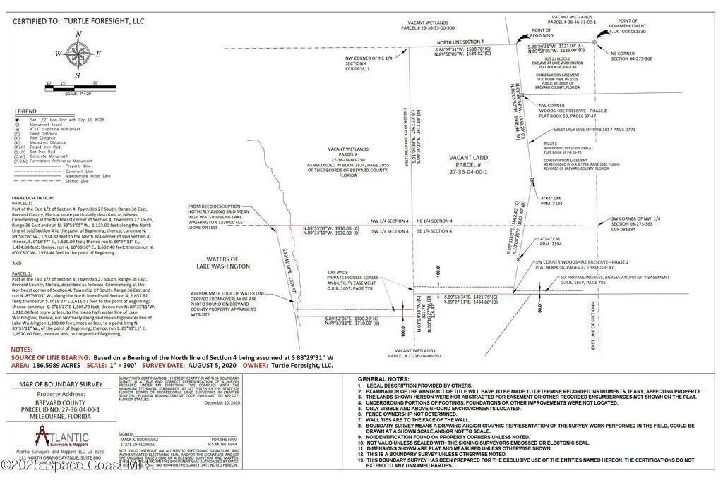 Discover a rare opportunity to own 186.59 acres (per survey) of untouched Florida wetlands along the serene shores of Lake Washington. This expansive parcel offers incredible natural beauty, privacy, and ecological value, making it ideal for conservation, or mitigation banking. With direct access to Lake Washington, the property features diverse native vegetation, wildlife habitat, and stunning water views.