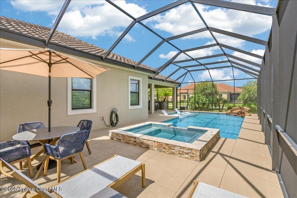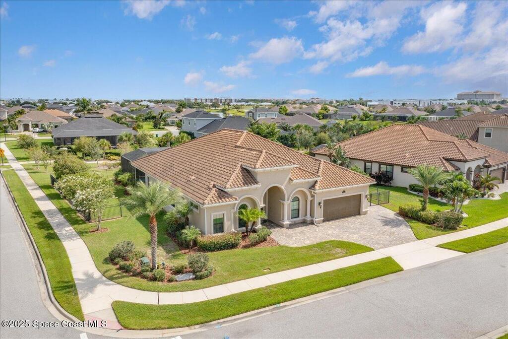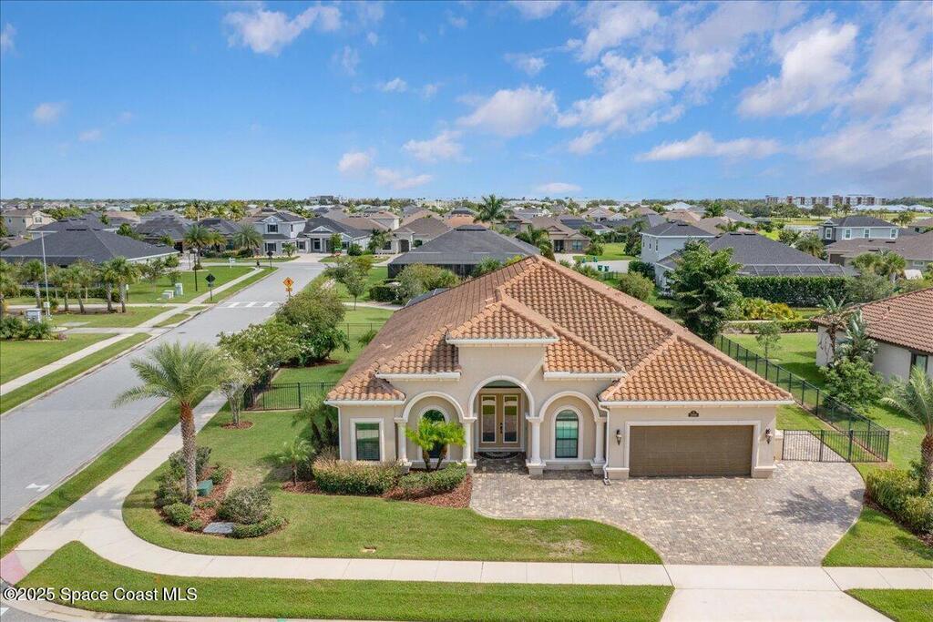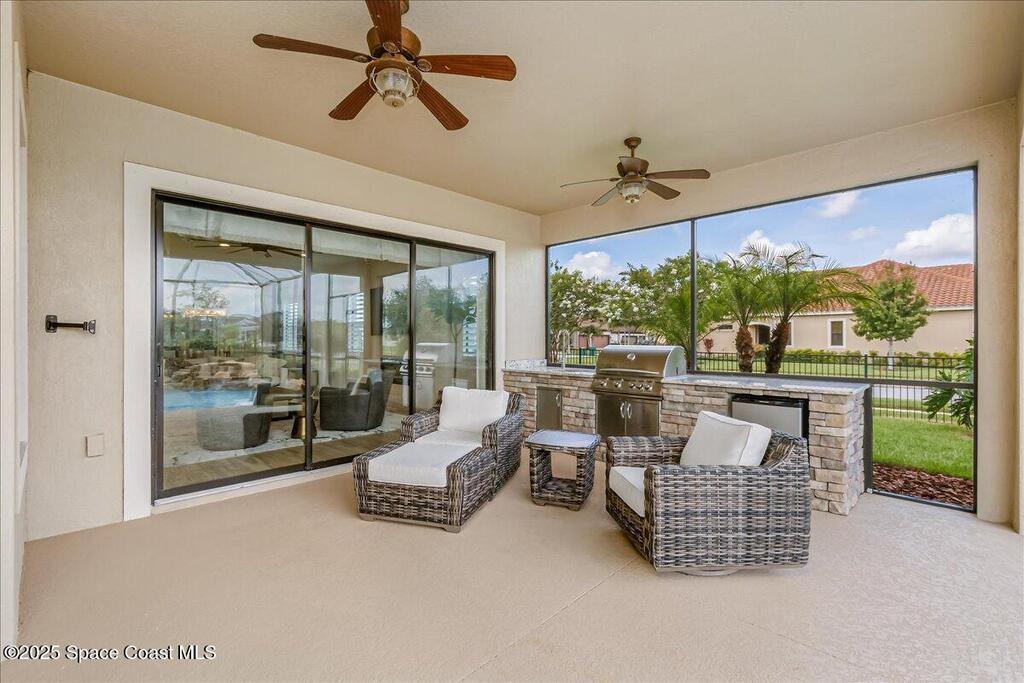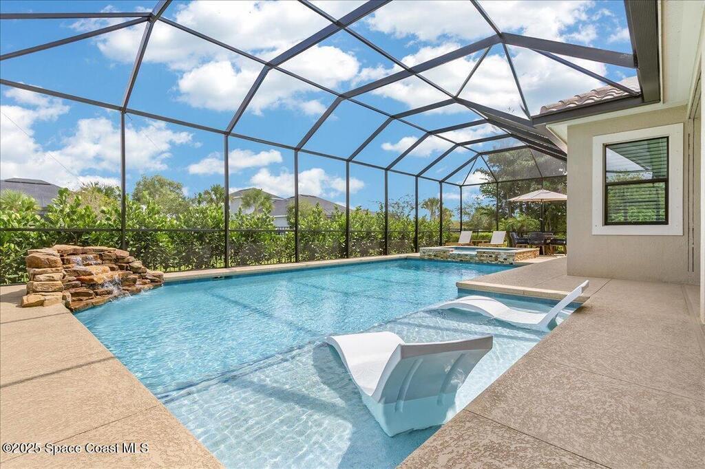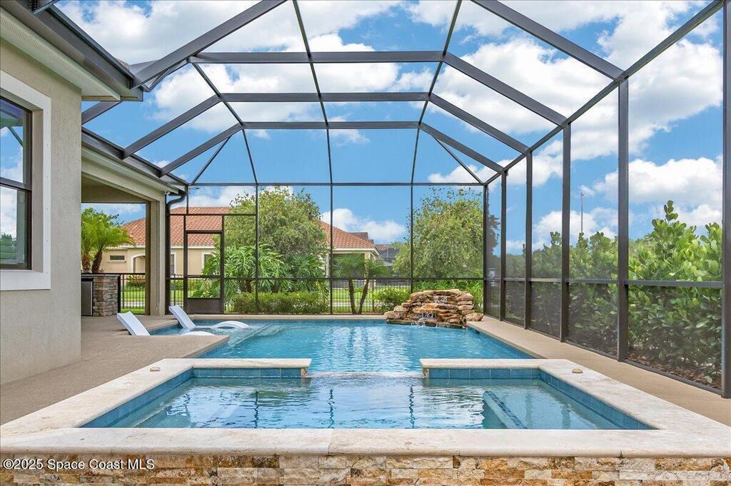 Luxurious executive pool home with sleek design finishes! Situates in one of Viera's premier gated communities, Kerrrington. Corner lot just shy of one third acre. Mature landscaping creates your own tropical paradise with heated pool and spa, 2 waterfalls, pool beach area, outdoor kitchen, high pitched screen enclosure. The interior of the home is designed in a calming neutral plate giving you a relaxed feeling all day long. This cook's kitchen has stainless steel appliances, quartz countertops, 42'' uppers, soft close cabinetry, large walk-in pantry with custom built all wood shelving and wine rack, and the seller's favorite a built in 'sonic ice' machine. Other features include barrel tile roof, 13' and 10' ceilings, 8' doors, tray ceilings, crown molding, plantation shutters, reverse osmosis water system, water softener, paver driveway and extra paver side-yard. Garage has extra side room for personal home gym or golf cart, 220v plug for an EV charger, NewAge storage system.